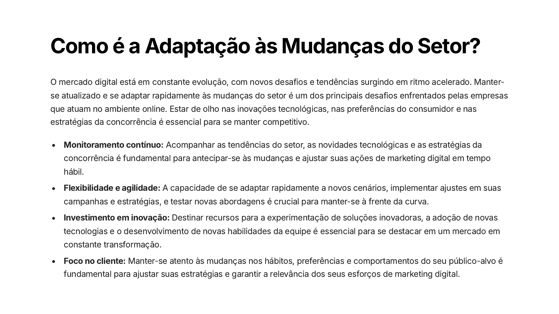 Como é a Adaptação às Mudanças do Setor? O mercado digital está em constante evolução, com novos desafios e tendências surgindo em ritmo acelerado. Manter- se atualizado e se adaptar rapidamente às mudanças do setor é um dos principais desafios enfrentados pelas empresas que atuam no ambiente online. Estar de olho nas inovações tecnológicas, nas preferências do consumidor e nas estratégias da concorrência é essencial para se manter competitivo. Monitoramento contínuo: Acompanhar as tendências do setor, as novidades tecnológicas e as estratégias da concorrência é fundamental para antecipar-se às mudanças e ajustar suas ações de marketing digital em tempo hábil. Flexibilidade e agilidade: A capacidade de se adaptar rapidamente a novos cenários, implementar ajustes em suas campanhas e estratégias, e testar novas abordagens é crucial para manter-se à frente da curva. Investimento em inovação: Destinar recursos para a experimentação de soluções inovadoras, a adoção de novas tecnologias e o desenvolvimento de novas habilidades da equipe é essencial para se destacar em um mercado em constante transformação. Foco no cliente: Manter-se atento às mudanças nos hábitos, preferências e comportamentos do seu público-alvo é fundamental para ajustar suas estratégias e garantir a relevância dos seus esforços de marketing digital. Como Gerenciar a Reputação Online? A gestão da reputação online é um desafio crítico para as empresas que atuam no ambiente digital. Atividades neste campo envolvem o monitoramento constante da imagem da marca, a resposta ágil a comentários e avaliações de clientes, e a promoção ativa de uma narrativa positiva sobre a empresa. Com o aumento da importância das redes sociais e de sites de avaliação, a reputação online se tornou um fator determinante para o sucesso de qualquer negócio. Manter o controle sobre a narrativa que circula na internet, identificar e resolver rapidamente qualquer crise de imagem, e investir em ações que construam uma percepção favorável sobre a marca são elementos essenciais para o gerenciamento eficaz da reputação online. Para lidar com esse desafio, é preciso adotar uma abordagem proativa e integrada, envolvendo equipes de marketing, comunicação e atendimento ao cliente. Ferramentas de monitoramento de menções, análise de sentimentos e gerenciamento de reputação online se tornam indispensáveis nesse contexto. Além disso, é crucial investir em conteúdo de alta qualidade, que reforce a imagem positiva da marca, e estabelecer processos ágeis de resposta a comentários negativos. Dessa forma, as empresas podem mitigar os riscos e capitalizar os benefícios de uma reputação online sólida e bem gerenciada. Como é a Automação de Processos? A automação de processos é um desafio crítico para as empresas de marketing digital. Com a necessidade de lidar com uma infinidade de tarefas, desde a geração de conteúdo até o monitoramento de campanhas, a automação se torna essencial para aumentar a eficiência, reduzir erros e liberar tempo para atividades estratégicas. Mapeamento de Processos: Identificar e mapear os principais processos da empresa, desde a captação de leads até a análise de resultados, é o primeiro passo para automatizar de forma eficaz. 1. Integração de Sistemas: Integrar ferramentas e plataformas de marketing digital, como CRM, automação de marketing e analytics, permite a integração de dados e a automatização dos fluxos de trabalho. 2. Adoção de IA e Machine Learning: Tecnologias como inteligência artificial e machine learning podem ser aplicadas para automatizar tarefas recorrentes, como segmentação de públicos, otimização de anúncios e personalização de conteúdo. 3. Fluxos de Aprovação: Estabelecer fluxos de aprovação automatizados para conteúdo, campanhas e atividades de marketing pode acelerar o processo de produção e garantir a conformidade com as diretrizes da empresa. 4. Monitoramento e Reporte Automático: Configurar relatórios e painéis de controle automáticos para acompanhar métricas-chave e insights de desempenho, reduzindo o tempo gasto em tarefas manuais de acompanhamento. 5.