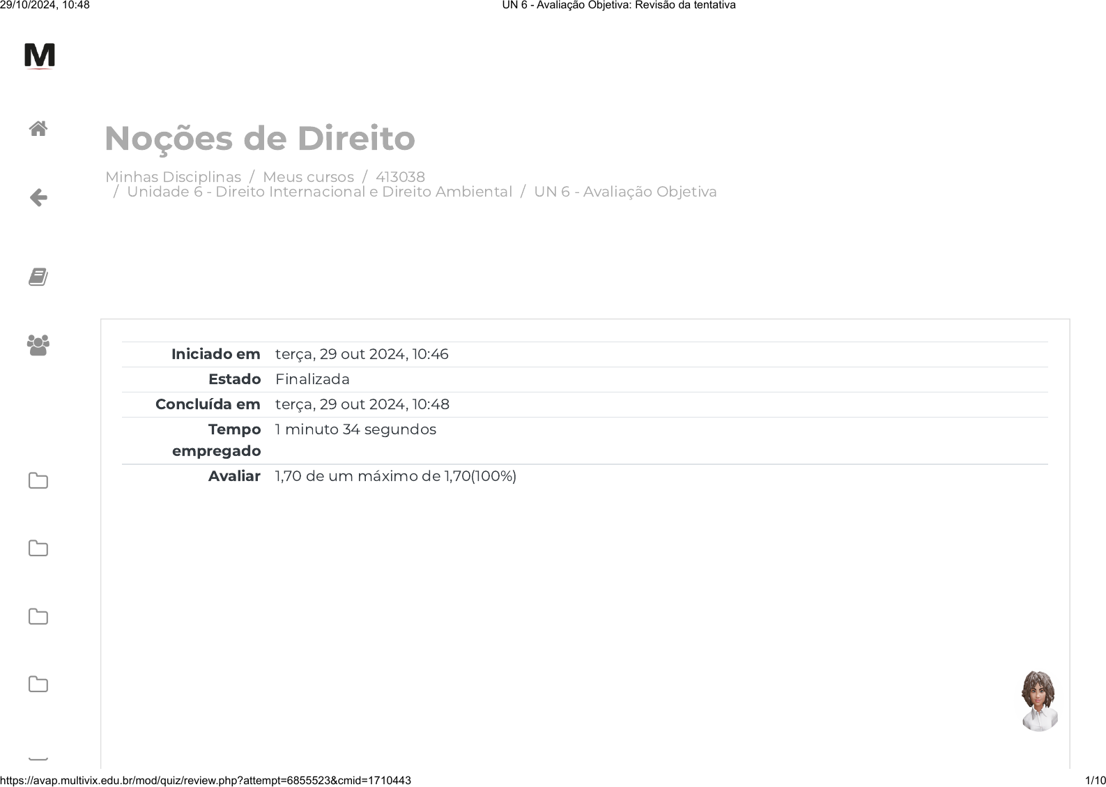 Minhas Disciplinas / Meus cursos / 413038 / Unidade 6 - Direito Internacional e Direito Ambiental / UN 6 - Avaliação Objetiva Noções de Direito Iniciado em terça, 29 out 2024, 10:46 Estado Finalizada Concluída em terça, 29 out 2024, 10:48 Tempo empregado 1 minuto 34 segundos Avaliar 1,70 de um máximo de 1,70(100%) 29/10/2024, 10:48 UN 6 - Avaliação Objetiva: Revisão da tentativa https://avap.multivix.edu.br/mod/quiz/review.php?attempt=6855523&cmid=1710443 1/10 https://avap.multivix.edu.br/my/ https://avap.multivix.edu.br/course/view.php?id=29089 https://avap.multivix.edu.br/course/view.php?id=29089§ion=7 https://avap.multivix.edu.br/mod/quiz/view.php?id=1710443 https://avap.multivix.edu.br/my/ https://avap.multivix.edu.br/course/view.php?id=29089 https://avap.multivix.edu.br/user/index.php?id=29089 https://avap.multivix.edu.br/course/view.php?id=29089§ion=1 https://avap.multivix.edu.br/course/view.php?id=29089§ion=2 https://avap.multivix.edu.br/course/view.php?id=29089§ion=3 https://avap.multivix.edu.br/course/view.php?id=29089§ion=4 https://avap.multivix.edu.br/course/view.php?id=29089§ion=5 https://avap.multivix.edu.br/ https://avap.multivix.edu.br/ https://avap.multivix.edu.br/ https://avap.multivix.edu.br/ https://avap.multivix.edu.br/ https://avap.multivix.edu.br/ https://avap.multivix.edu.br/ https://avap.multivix.edu.br/ https://avap.multivix.edu.br/ https://avap.multivix.edu.br/ https://avap.multivix.edu.br/ Questão 1 Correto Atingiu 0,34 de 0,34 O direito ambiental não visa preservação cega e burra, ela visa compatibilizar o desenvolvimento econômico com a preservação do meio ambiente, gerando também um desenvolvimento social. Este é o elo do direito ambiental com o direito econômico. Marcelo Abelha Rodrigues diz que o objeto de proteção do Direito Ambiental está disposto no art. 225, caput, da Constituição Federal de 1998: “todos têm direito a um meio ambiente ecologicamente equilibrado, bem de uso comum do povo e essencial à sadia qualidade de vida (...)”. Direito Ambiental. Publicado por André Queiroz. Disponível em http://direitoambiental.com/ ; Novembro, 2016. Assinale V para as a�rmativas verdadeiras e F para as a�rmativas falsas: ( ) O Direito Ambiental se preocupa com todos os meios ambientes, sejam eles naturais ou não. ( ) A degradação da qualidade ambiental, conforme art. 3º, II, da Lei nº 6.938/81 é “(...) a alteração adversa das características do meio ambiente”. É toda e qualquer alteração do ambiente. ( ) O equilíbrio ecológico é um bem jurídico a ser tutelado/protegido pelo Direito Ambiental. ( ) O Direito Ambiental, busca-se proteger “(...) somente os elementos bióticos e a sua respectiva interação, para se alcançar a proteção do meio ambiente ecologicamente equilibrado, porque este bem é responsável pela conservação de todas as formas de vida”. Assinale a alternativa com a sequência correta: Escolha uma opção: 29/10/2024, 10:48 UN 6 - Avaliação Objetiva: Revisão da tentativa https://avap.multivix.edu.br/mod/quiz/review.php?attempt=6855523&cmid=1710443 2/10 http://direitoambiental.com/%C2%A0 https://avap.multivix.edu.br/ https://avap.multivix.edu.br/ https://avap.multivix.edu.br/ https://avap.multivix.edu.br/ https://avap.multivix.edu.br/ https://avap.multivix.edu.br/ https://avap.multivix.edu.br/ https://avap.multivix.edu.br/ https://avap.multivix.edu.br/ https://avap.multivix.edu.br/ https://avap.multivix.edu.br/ a. F, V, V, F b. V, F, V, F c. F, F, V, F d. V, V, F, F e. V, F, F, F 29/10/2024, 10:48 UN 6 - Avaliação Objetiva: Revisão da tentativa https://avap.multivix.edu.br/mod/quiz/review.php?attempt=6855523&cmid=1710443 3/10 https://avap.multivix.edu.br/ https://avap.multivix.edu.br/ https://avap.multivix.edu.br/ https://avap.multivix.edu.br/ https://avap.multivix.edu.br/ https://avap.multivix.edu.br/ https://avap.multivix.edu.br/ https://avap.multivix.edu.br/ https://avap.multivix.edu.br/ https://avap.multivix.edu.br/ https://avap.multivix.edu.br/ Questão 2 Correto Atingiu 0,34 de 0,34 A ideia do direito ambiental brasileiro é que ele está intimamente ligado com o desenvolvimento econômico e com o desenvolvimento social e não apenas em matéria de preservação ambiental propriamente dita. O direito ambiental não foi criado apenas para proteger, preservar o meio ambiental. Esta seria uma visão equivocada, pois o direito ambiental brasileiro em momento algum quer frear o desenvolvimento sócio econômico. Pelo contrário, se frear o desenvolvimento sócio econômico, com certeza, estará gerando indiretamente uma maior agressão ao meio ambiente, pois atividades irregulares começarão a aparecer. Frederico Amado conceitua o “Direito Ambiental como (...) ramo do direito público composto por princípios e regras que regulam as condutas humanas que afetem, potencial ou efetivamente, direta ou indiretamente, o meio ambiente...” Refere-se ao ART. 225, CRFB – “Todos têm direito ao meio ambiente ecologicamente equilibrado, bem de uso comum do povo e essencial à sadia qualidade de vida, impondo-se ao Poder Público e à coletividade o dever de defendê-lo e preservá-lo para os presentes e futuras gerações.” Direito Ambiental. Publicado por André Queiroz. Disponível em http://direitoambiental.com/ ; Novembro, 2016. Sobre o direito ambiental, analise as a�rmativas abaixo: I. O único objetivo do Direito Ambiental brasileiro é o controle da poluição, visando mantê-la dentro de padrões toleráveis, para que os presentes e futuras gerações possam usufruir da sua dignidade ambiental. 29/10/2024, 10:48 UN 6 - Avaliação Objetiva: Revisão da tentativa https://avap.multivix.edu.br/mod/quiz/review.php?attempt=6855523&cmid=1710443 4/10 http://direitoambiental.com/%C2%A0 https://avap.multivix.edu.br/ https://avap.multivix.edu.br/ https://avap.multivix.edu.br/ https://avap.multivix.edu.br/ https://avap.multivix.edu.br/ https://avap.multivix.edu.br/ https:/