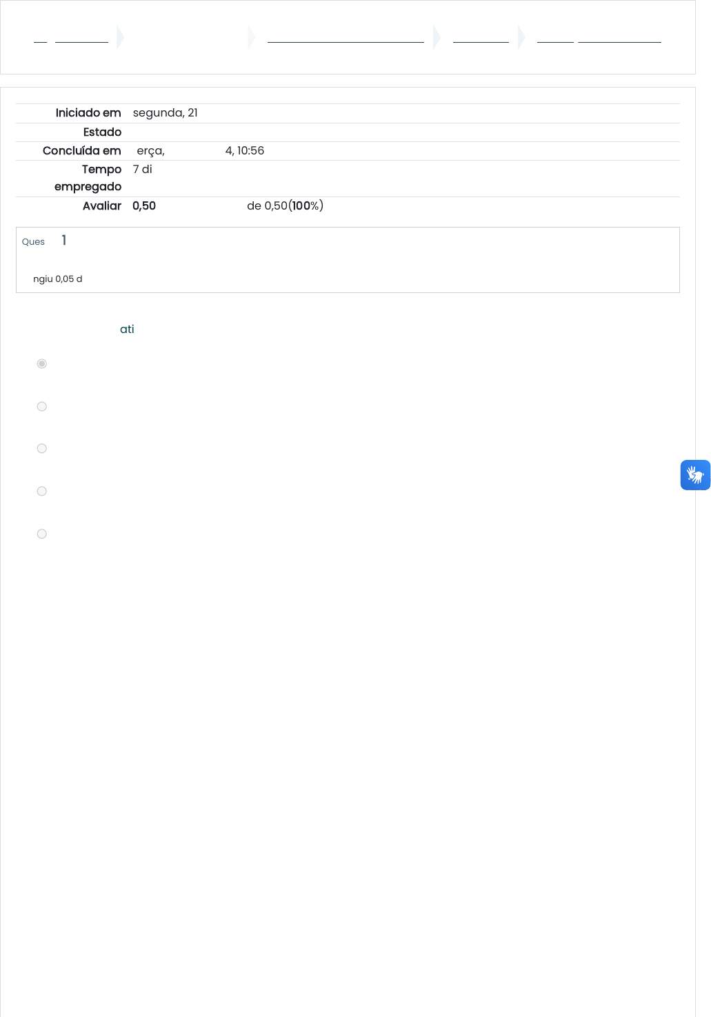 Página inicial Minhas disciplinas 2024/4 - Botânica Estrutural UNIDADE II Avaliação - Unidade II Iniciado em segunda, 21 out 2024, 14:28 Estado Finalizada Concluída em terça, 29 out 2024, 10:56 Tempo empregado 7 dias 20 horas Avaliar 0,50 de um máximo de 0,50(100%) Questão 1 Completo Atingiu 0,05 de 0,05 Assinale a afirmativa correta sobre a organização do corpo vegetal: a. O colênquima e o esclerênquima são tecidos compostos por células com paredes espessas e por isso são adequados a função de sustentação. b. O transporte da seiva pode ser feito por qualquer tecido do corpo da planta, sendo comumente realizado pela periderme. c. A epiderme só pode ser observada em plantas com crescimento secundário, como as gimnospermas e angiospermas dicotiledôneas. d. A presença de parede secundária lignificada é mais comum nos elementos de tubo crivados do que nas células crivadas. e. A epiderme é um tecido de revestimento secundário e é normalmente composta por várias camadas de células. A resposta correta é: O colênquima e o esclerênquima são tecidos compostos por células com paredes espessas e por isso são adequados a função de sustentação. https://ambienteonline.uninga.br/ https://ambienteonline.uninga.br/course/view.php?id=29675 https://ambienteonline.uninga.br/course/view.php?id=29675§ion=4 https://ambienteonline.uninga.br/mod/quiz/view.php?id=824523 Questão 2 Completo Atingiu 0,05 de 0,05 Questão 3 Completo Atingiu 0,05 de 0,05 Assinale a afirmativa correta sobre a organização do corpo vegetal. a. Os meristemas secundários são responsáveis pelo aumento da espessura do corpo do vegetal e dão origem a tecidos como a epiderme e o colênquima. b. Os meristemas secundários, câmbio vascular e felogênio, estão envolvidos no aumento da espessura de caules e raízes de plantas que apresentam crescimento Decundário. c. As células meristemáticas que apresentam parede secundária espessa e lignificada dão origem a tecidos vasculares e de sustentação, pois estes são os únicos tecidos vegetais com paredes lignificadas desde sua origem. d. Protoderme, procâmbio e meristema fundamental são meristemas secundários. e. A protoderme dá origem a periderme que é um tecido de revestimento primário e pode apresentar várias camadas de células mortas. A resposta correta é: Os meristemas secundários, câmbio vascular e felogênio, estão envolvidos no aumento da espessura de caules e raízes de plantas que apresentam crescimento Decundário. Assinale a afirmativa correta sobre os tecidos vegetais: a. As células do esclerênquima não são lignificadas. b. Tecidos relacionados com a sustentação do corpo vegetal podem apresentar paredes mais espessas, como o colênquima. c. Todos os tecidos vegetais são formados por células vivas e somente com parede secundária. d. A presença de parede primária só ocorre em tecidos de sustentação. e. As fibras vegetais são formadas por células que apresentam somente parede primária lignificada. A resposta correta é: Tecidos relacionados com a sustentação do corpo vegetal podem apresentar paredes mais espessas, como o colênquima. Questão 4 Completo Atingiu 0,05 de 0,05 Questão 5 Completo Atingiu 0,05 de 0,05 Assinale a afirmativa correta: a. O parênquima é um tecido composto por células mortas na maturidade. b. O súber tem origem do meristema secundário protoderme. c. Todos os tecidos vegetais apresentam células vivas e com capacidade de multiplicação irrestrita, como os meristemas. d. Os meristemas primários são responsáveis pelo crescimento primário dos vegetais e dão origem a tecidos como o súber e o floema secundário. e. O câmbio vascular pode ser observado em plantas com caules do tipo tronco, que apresentam o crescimento secundário. A resposta correta é: O câmbio vascular pode ser observado em plantas com caules do tipo tronco, que apresentam o crescimento secundário. Assinale a alternativa correta sobre a organização do corpo vegetal a. O floema é um tecido composto de células vivas e responsáveis pelo transporte da seiva bruta da raiz em direção às folhas. b. O parênquima é o tecido vegetal menos dinâmico, pois a presença de parede secundária em suas células dificulta a multiplicação. c. Os estômatos são normalmente encontrados no tecido parenquimático e estão envolvidos com a absorção de água nas raízes. d. O xilema é composto por células vivas e apresentam as células companheiras. e. A presença da cutícula sobre a epiderme das células vegetais tem grande importância na regulação da perda de agua pela planta. A resposta correta é: A presença da cutícula sobre a epiderme das células vegetais tem grande importância na regulação da perda de agua pela planta. Questão 6 Completo Atingiu 0,05 de 0,05 Questão 7 Completo Atingiu 0,05 de 0,05 Assinale a alternativa correta sobre a organização do corpo vegetal a. O parênquima localizado nas folhas é o responsável pela fotossíntese devido a presença de grande número de cloroplastos em suas células. b. A presença da cutícula sobre a camada de células da periderme tem grande importância no transporte de água pela planta. c. As fibras vegetais de grande importância para o artesanato são do tecido colenquimático, que apresenta células com paredes espessas e lignificadas. d. O esclerênquima é o tecido vegetal mais dinâmico, pois pode servir de armazenador em raízes ou fotossintetizante quando constituinte das folhas. e. A presença de cloroplasto armazenador de amido é comum no parênquima de caules subterrâneos. A resposta correta é: O parênquima localizado nas folhas é o responsável pela fotossíntese devido a presença de grande número de cloroplastos em suas células. Assinale a alternativa correta sobre a organização do corpo vegetal: a. A periderme é composta pelo floema secundário e parênquima. b. O parênquima é um tipo de tecido que pode ser diferencia