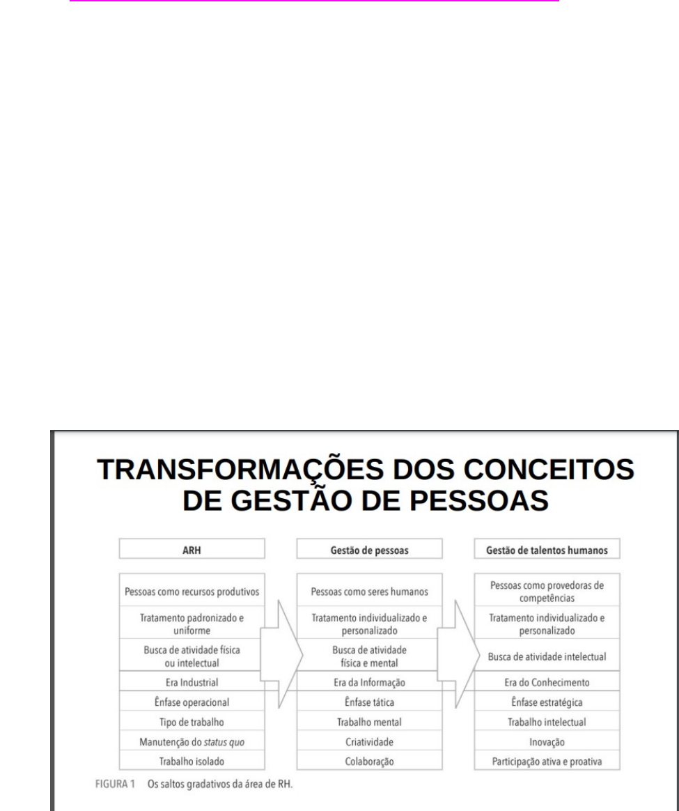 A evolução no conceito de gestão de pessoas e equipes. Descrição da aula Nesta Unidade de Aprendizagem vamos abordar sobre a evolução da área de Gestão de Pessoas, verificando que conforme o aumento da globalização e o desenvolvimento mundial avançou, as relações de trabalho, sobretudo entre empregador e empregado, se modernizaram, resultando assim em uma evolução dos conceitos de gestão de pessoas. De Departamento Pessoal para Recursos Humanos e hoje Gestão de Pessoas ou até mesmo Gestão do Talento Humano, essa é a abordagem conceitual em que se baseiam os aspectos fundamentais da moderna Gestão de Pessoas. Competências adquiridas · Entender a evolução da área de gestão de pessoas. · Compreender as mudanças nos modelos de gestão de pessoas. · Compreender os conceitos de gestão de pessoas. · Compreender os aspectos fundamentais da moderna Gestão de Pessoas. · Identificar as principais práticas dos novos modelos de gestão de pessoas. Transformações dos conceitos de gestão de pessoas Evolução da nomenclatura Conceito A gestão de pessoas hoje conhecida como gestão do talento humano é uma área muito sensível quanto a missão, visão de futuro, mentalidade, cultura corporativa e valores que predominam em cada organização. Extremamente contingencial e situacional, pois depende de vários aspectos, como arquitetura, cultura corporativa, características do seu mercado e do negócio, tecnologia utilizada, processos internos, estilo de gestão e uma infinidade de outras variáveis. E, principalmente, depende das características das pessoas que constituem. Tudo isso constitui um complexo mix que torna única cada organização. Gestão de pessoas · Gestão de pessoas procura ajudar o administrador/gestor a desempenhar todas suas funções porque ele não realiza seu trabalho sozinho, mas por meio das pessoas que formam sua equipe. Com sua equipe, o executivo alcança metas, objetivos e resultados. As organizações são criadas por pessoas, para pessoas e com pessoas. Constituídas de pessoas e dependem delas para atingir seus objetivos e cumprir suas missões; para as pessoas, as organizações constituem o meio mais importante pelo qual elas podem alcançar vários objetivos pessoais. Aspectos fundamentais da moderna gestão de pessoas 1. Pessoas como seres humanos; 2. Pessoas como ativadoras de recursos organizacionais; 3. Pessoas como parceiras da organização; 4. Pessoas como talentos fornecedores de competências; 5. Pessoas como capital humano do negócio. image5.png image3.png image1.png image4.png image2.png