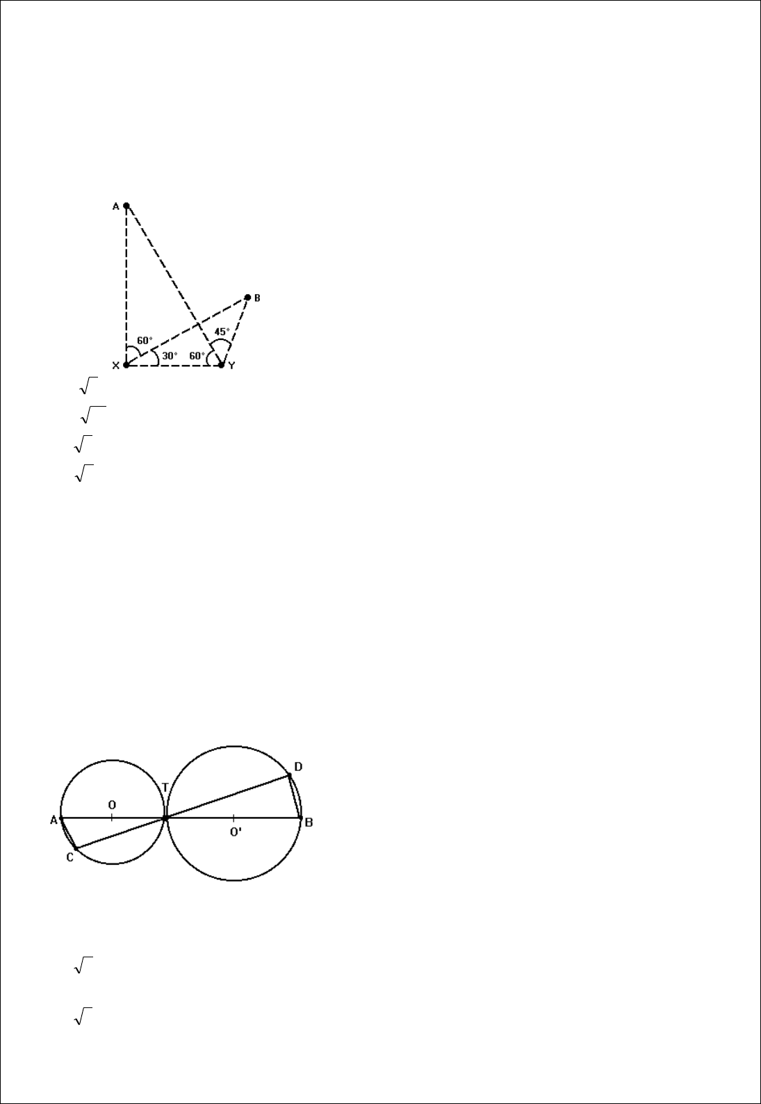 TRIÂNGULO RETÂNGULO 1) A área de um triângulo retângulo é 12dm 2 . Se um dos catetos é 2/3 do outro, calcule a medida da hipotenusa desse triângulo. 2) Na figura a seguir, os ângulos assinalados têm as medidas indicadas. Se XY=5m, então a medida de AB, em metros, é igual a: a) (5 5 )/2 b) (5 10 )/2 c) 5 3 d) 5 5 e) 5 3) Se em um triângulo os lados medem 9, 12 e 15cm, então a altura relativa ao maior lado mede: a) 8,0 cm b) 7,2 cm c) 6,0 cm d) 5,6 cm e) 4,3 cm 4) (UFMG) Observe a figura. Nessa figura, AB contém os centros O e O' das circunferências que se tangenciam no ponto T. Sendo AB = 44, O'B = 16, AC = 6, a medida TD é a) 8 2 b) 15 c) 6 3 d) 20 e) 16 3 5) (UNIRIO) Os lados de um triângulo retângulo estão em progressão aritmética. Sabendo-se que o perímetro mede 57 cm, podemos afirmar que o maior cateto mede: a) 17 cm b) 19 cm c) 20 cm d) 23 cm e) 27 cm 6) Os catetos de um triângulo retângulo medem 6 cm e 8 cm. Nessas condições determine: a) a medida "a" da hipotenusa b) a medida "h" da altura relativa à hipotenusa. c) as medidas "m" e "n" das projeções dos catetos sobre a hipotenusa. 7) Um triângulo, inscrito num semicírculo de raio igual a 5cm, possui um dos lados que mede 10cm. A soma dos quadrados dos outros dois lados é: a) 50 cm 2 b) 75 cm 2 c) 100 cm 2 d) 125 cm 2 e) 150 cm 2 8) A reta 2x + 3y = 5, ao interceptar os dois eixos coordenados, forma com estes um triângulo retângulo. Calcule o valor da hipotenusa desse triângulo. 9) (FUVEST) Dois pontos materiais A e B deslocam-se com velocidades constantes sobre uma circunferência de raio r= 8 m partindo de um mesmo ponto O. Se o ponto A se desloca no sentido horário com o triplo da velocidade de B, que se desloca no sentido anti-horário, então o comprimento da corda que liga o ponto de partida ao ponto do primeiro encontro é: a) 1 m b) 2 m c) 3 m d) 4 m e) 5 m 10) O triângulo ABC da figura é retângulo em A. AH é a altura e AS é bissetriz. Calcule x, y e z. 11) Determine o valor de "x" nos casos: 12) Os dois maiores lados de um retângulo medem 12dm e 13dm. O perímetro desse triângulo é: a) 36 dm b) 35 dm c) 34 dm d) 33 dm e) 30 dm 13) As medidas dos catetos de um triângulo retângulo são, respectivamente, 30 cm e 40 cm. A altura relativa à hipotenusa mede: a) 24 cm b) 20 cm c) 31 cm d) 23 cm e) 25 cm 14) (UNIRIO) Dado um triângulo retângulo cujos catetos medem 2 cm, construímos um segundo triângulo retângulo onde um dos catetos está apoiado na hipotenusa do primeiro e o outro cateto mede 2 cm. Construímos um terceiro triângulo com um dos catetos medindo 2 cm e o outro apoiado na hipotenusa do segundo triângulo. Se continuarmos a construir triângulos sempre da mesma forma, a hipotenusa do 15º triângulo medirá: a) 15 cm. b) 15 2 cm. c) 14 cm. d) 8 cm. e) 8 2 cm. 15) No triângulo da figura a seguir, o valor de x é: a) 6 b) 7 c) 8 d) 9 e) 10 16) No triângulo a seguir, o valor de x é: a) 14 b) 16 c) 18 d) 20 e) 22 17) A figura a seguir mostra uma antena retransmissora de rádio de 72m de altura. Ela é sustentada por 3 cabos de aços que ligam o topo da antena ao solo, em pontos que estão a 30m do pé da antena. A quantidade (em metros) aproximada de cabo que será gasta para sustentar a antena é: a) 234 b) 78 c) 156 d) 102 e) 306