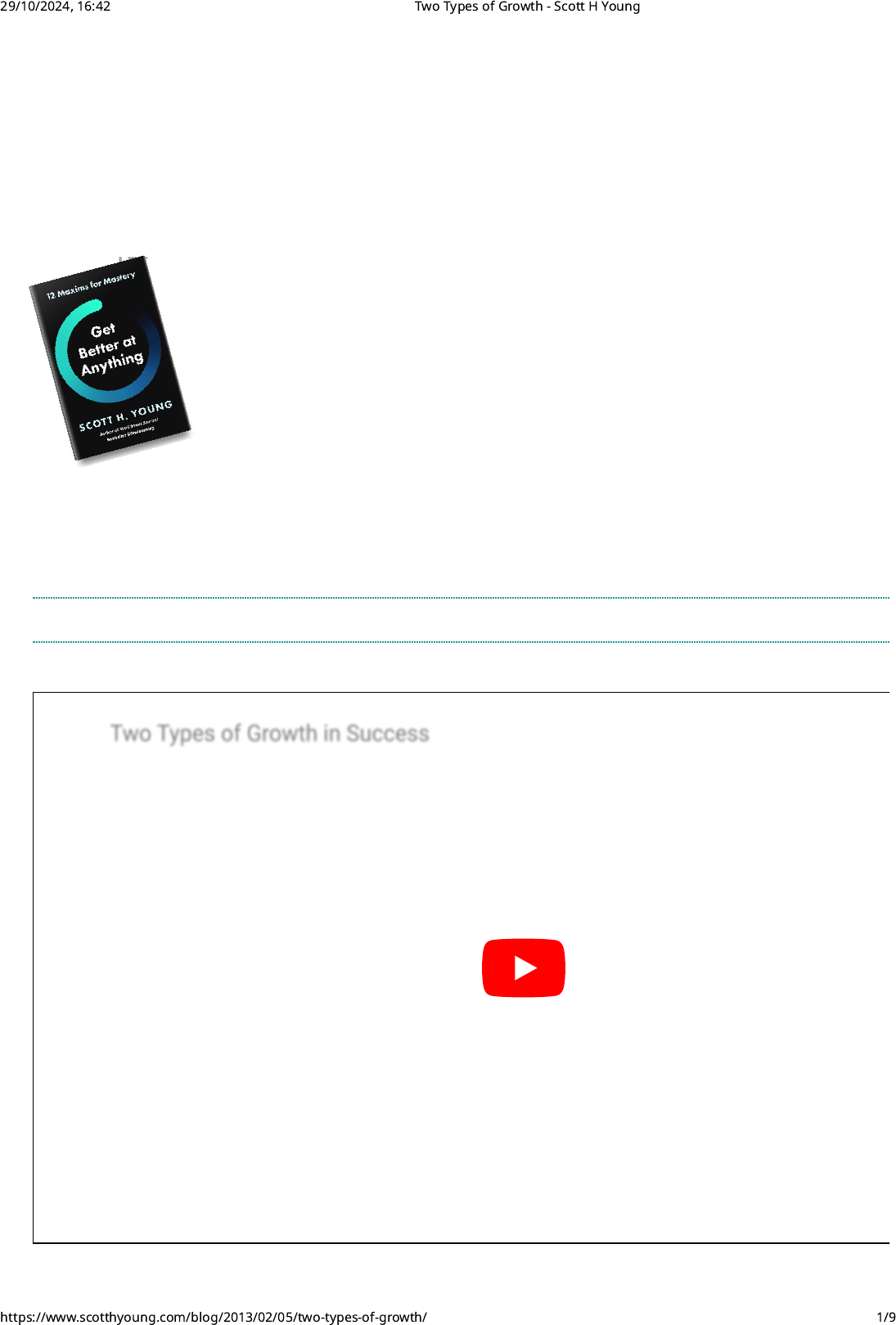 Two Types of Growth February, 2013 | Comments | Share RECENT MY BOOKS ARTICLES CHALLENGES PRODUCTS PODCAST FREE NEWSLETTER Get Better at Anything Now available! Learn More Two Types of Growth in SuccessTwo Types of Growth in Success 29/10/2024, 16:42 Two Types of Growth - Scott H Young https://www.scotthyoung.com/blog/2013/02/05/two-types-of-growth/ 1/9 https://www.scotthyoung.com/ https://www.scotthyoung.com/blog/ https://www.scotthyoung.com/blog/articles/ https://www.scotthyoung.com/blog/my-projects/ https://www.scotthyoung.com/blog/books-courses/ https://www.scotthyoung.com/blog/podcast/ https://www.scotthyoung.com/blog/newsletter/ https://www.scotthyoung.com/blog/getbetter https://www.scotthyoung.com/blog/getbetter https://www.youtube.com/watch?v=Cod4TEKq_qA Anything you try to improve will have a growth curve. Imagine you ran everyday and tracked your speed to �nish a 5-mile course. Smoothing out the noise, over enough t probably get a graph like this: Here, improvement works on a logarithmic scale. As you get better, it gets harder an improve. Elite athletes expend enormous e�ort to shave seconds o� their best times. athletes can shave minutes with just a little practice. Logarithmic growth is the �rst type of growth. This is where you see a lot of progres beginning, but continuing progress is more di�cult. Now imagine a di�erent graph. This time you’ve build a new website you update reg you’re measuring subscribers. This graph would likely look very di�erent: 29/10/2024, 16:42 Two Types of Growth - Scott H Young https://www.scotthyoung.com/blog/2013/02/05/two-types-of-growth/ 2/9 https://www.scotthyoung.com/blog/wp-content/uploads/2013/02/LogarithmicCurve.png https://www.scotthyoung.com/blog/wp-content/uploads/2013/02/LogarithmicCurve.png This is exponential growth, the second type of growth. Website tra�c is often expon because as a blog attracts more readers, there are more opportunities for word about spread. A blog with zero tra�c also has zero word of mouth. I’ve noticed most things tend to be either logarithmic or exponential growth. Despit progress is what most people expect. We tend to expect things to move in the same d rate as they have in the past. This violation of our expectation leads to some mistakes set goals and act on them. The Logarithmic Growth Mistake Listen to this article ScottHYoung – �Ep 129� � Two types of growth The �rst kind of mistake is assuming straight-line growth, when reality is actually log There are many situations which usually �t this pattern: Athletic performance 29/10/2024, 16:42 Two Types of Growth - Scott H Young https://www.scotthyoung.com/blog/2013/02/05/two-types-of-growth/ 3/9 https://www.scotthyoung.com/blog/wp-content/uploads/2013/02/ExponentialCurve.png https://www.scotthyoung.com/blog/wp-content/uploads/2013/02/ExponentialCurve.png https://soundcloud.com/user-324815295/ep-129-two-types-of-growth Weight gain/loss Learning a new language Productivity Mastery of a complex skill Assuming straight-line growth means overcon�dence in long-term progress. As a res to hit plateaus if the di�culty isn’t deliberately tuned to break your comfortable rhyt Logarithmic growth also implies it is easier to slide back down the hill. Since it is so s beginning, carelessness can mean those immediate gains are often easily lost. Losing w quickly may be more desirable than losing it slowly, but it also risks putting it back o quickly if you stop your e�orts. Logarithmic mistakes are common, but so to are mistakes when reality is in the othe growth curve. The Exponential Growth Mistake Once again, people view progress linearly when it is, in fact, exponential. Some exam usually follow exponential curves for at least part of their lifecycle are: Technological improvement (e.g. Moore’s Law) Business growth Wealth Rewards to talent/career Unlike logarithmic curves, almost nothing is consistently exponential. Most are only exponential over some range of values, outside of which they are logarithmic again. No business reaches near-in�nite values, even though this would be implied by an ex curve. Eventually market share is saturated or competition stabilizes growth. Howeve types of businesses, exponential growth can persist for much of the business lifecycle 29/10/2024, 16:42 Two Types of Growth - Scott H Young https://www.scotthyoung.com/blog/2013/02/05/two-types-of-growth/ 4/9 http://en.wikipedia.org/wiki/Moore%27s_Law Exponential curves are somewhat rarer than logarithmic ones, however the mistakes even more costly. Expecting linear growth when it is actually exponential causes man give up way before they should. Several years ago, I remember being disheartened when drawing straight-line projecti business income. At the going rates, it was often a dozen years away or more before I make a full-time living at it. However, my income turned out to be exponential. Desp spending more time below my ideal projections, I ended up eventually surpassing the Exponential areas of life are full of quitters. People making linear assessments of viab giving up before the exponential curve can take hold. Not all of this is irrational, man exponential areas are high-variance as well. However, the problem with exponential d that the feedback can often look bad, even when it is good. Is Your Growth Exponential or Logarithmic? Both types of mistakes, failing to recognize exponential domains and logarithmic on costly. It’s not always clear which is which, but by reasoning about the features of a d can get a better sense which one it is likely to be. The easiest way to tell is to look at how other people have progressed in that �eld. Do attention to their rates, just pay attention to the shape of their growth trajectory. Is it that slows down with mastery or speeds up? Exponential growth stories tend to be the ones where a person struggled long and ha little to show for it, then started quickly gaining success. These stories often