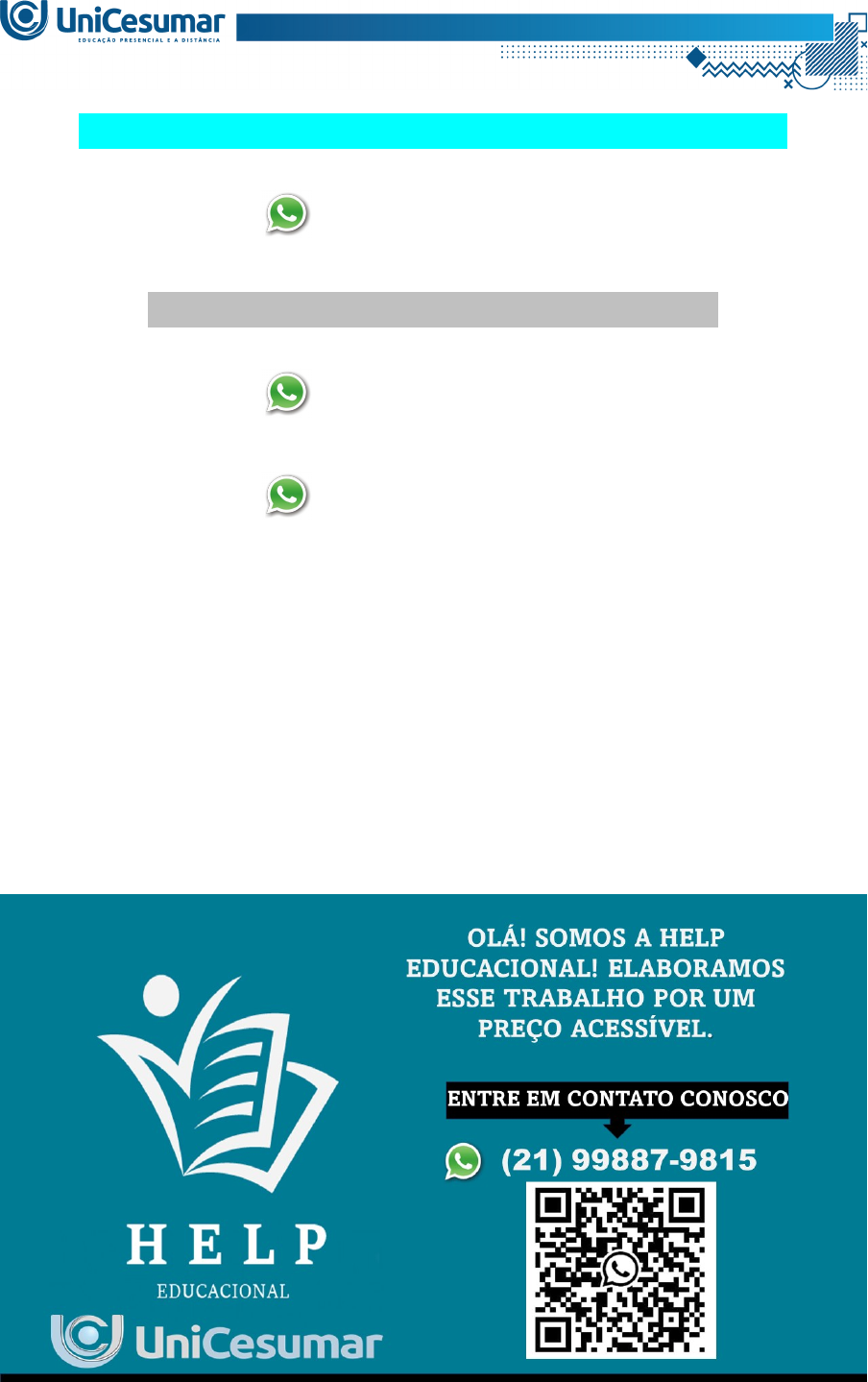 MAPA – ECOS - FISIOLOGIA HUMANA - 54_2024 (21) 99887-9815 ASSESSORIA NOS SEUS TRABALHOS (21) 99887-9815 (21) 99887-9815 Olá, estudante, espero que você esteja bem. Nessa atividade direcionarei você a conhecer mais sobre a fisiologia do corpo humano e como esse conhecimento poderá te auxiliar na prática clínica. Agora, imagine sobre a seguinte clínica A Clínica Bem-estar é um espaço multidisciplinar dedicado ao cuidado integral da saúde. Nossa equipe é formada por profissionais especializados em áreas como estética, terapias integrativas e podologia, todos comprometidos em oferecer um atendimento completo e personalizado. Esses profissionais estão em constante atualização, aprofundando seus conhecimentos sobre a fisiologia humana e os efeitos de cada procedimento no corpo, para garantir a escolha dos tratamentos mais adequados para cada paciente. Recentemente, durante uma capacitação interna, o sistema muscular foi um dos principais temas abordados, reforçando a importância desse conhecimento para a prática clínica Um exemplo prático discutido foi a aplicação da toxina botulínica, que tem um impacto direto no sistema muscular, interferindo na comunicação entre os nervos e os músculos. Essa toxina bloqueia a liberação de acetilcolina, um neurotransmissor essencial para a contração muscular, resultando na paralisia temporária dos músculos tratados. Esse procedimento é amplamente utilizado tanto em tratamentos estéticos quanto terapêuticos, demonstrando a importância de entender o funcionamento muscular para aplicar a técnica de forma eficaz Outro exemplo relevante foi a massagem relaxante, que atua diretamente sobre as fibras musculares. A manipulação dessas fibras ajuda a liberar nódulos de tensão, melhorar a flexibilidade e aumentar a elasticidade muscular. Além disso, ao estimular o sistema nervoso parassimpático e reduzir a atividade do sistema simpático, a massagem promove um estado de relaxamento muscular, aliviando o estresse e favorecendo a recuperação dos músculos, o que é essencial para prevenir tensões crônicas Por fim, o conhecimento da estrutura e função do sistema muscular dos pés também se mostra fundamental. Os músculos dos pés desempenham um papel crucial no equilíbrio e na postura do corpo. Fraquezas ou desequilíbrios nesses músculos podem comprometer a distribuição de peso e o alinhamento corporal, resultando em problemas posturais e alterações na marcha. Profissionais capacitados podem avaliar com precisão essas condições e, quando necessário, recomendar o uso de palmilhas corretivas para corrigir os desequilíbrios musculares, promovendo uma postura adequada e prevenindo sobrecargas musculares Fonte: Elaborado pelo autor. Para desenvolver a atividade MAPA dessa disciplina, diante das informações passadas e visto a importância da Fisiologia Humana para seus futuros atendimentos profissionais, você deverá responder às questões com base no conteúdo presente no livro didático sobre o sistema muscular. Veja a seguir: 1) O músculo esquelético é composto por várias estruturas, incluindo células musculares, tecido nervoso, sangue e tecido conjuntivo. Entre as estruturas musculares, destacam-se as miofibrilas, filamentos longos e abundantes contendo as proteínas responsáveis pela contração. A partir disso, DESCREVA em detalhes sobre os componentes dos dois principais tipos de miofilamentos que formam as miofibrilas. 2) Para que a contração muscular se inicie, é essencial a conexão entre o sistema nervoso e o sistema muscular. QUAIS são os componentes de cada sistema que participam desse processo? Como é CHAMADA a interação entre esses componentes? 3) O movimento da actina e da miosina é fundamental para o encurtamento do músculo, resultando na contração. EXPLIQUE as etapas que ocorrem durante o processo de encurtamento do sarcômero. Orientações para desenvolver sua atividade MAPA: 1. Leia o livro da disciplina. 2. Assista às aulas conceituais e ao vivo. 3. Assista ao vídeo de orientação para a realização da atividade. Link de acesso: https://www.youtube.com/watch?v=xKF0TfonciQ (copie e cole no seu navegador de internet) 4. Baixe o "Formulário de entrega do MAPA", disponível no ambiente Studeo, na pasta Material da Disciplina, e preencha corretamente todos os campos solicitados. 5. Anexe seu modelo de entrega do MAPA respondido no espaço específico da atividade MAPA. 6. Lembre-se de clicar em “Finalizar” para efetivar sua participação. 7. Evite plágio de informações, nesse caso, insira as referências utilizadas para consulta das respostas. 8. Atividades com imagens da internet ou compartilhadas entre alunos sofrerão penalizações. *Esta atividade faz parte da composição de notas para a média na disciplina. Sua realização é muito importante! OLÁ! SOMOS A HELP EDUCACIONAL! ELABORAMOS ESSE TRABALHO POR UM PREÇO ACESSÍVEL. ENTRE EM CONTATO CONOSCO (21) 99887-9815 image1.png image2.png image3.png