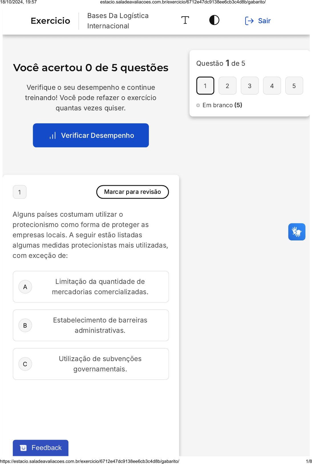 Você acertou 0 de 5 questões Verifique o seu desempenho e continue treinando! Você pode refazer o exercício quantas vezes quiser. Verificar Desempenho A B C 1 Marcar para revisão Alguns países costumam utilizar o protecionismo como forma de proteger as empresas locais. A seguir estão listadas algumas medidas protecionistas mais utilizadas, com exceção de: Limitação da quantidade de mercadorias comercializadas. Estabelecimento de barreiras administrativas. Utilização de subvenções governamentais. Questão 1 de 5 Em branco �5� 1 2 3 4 5 Feedback Exercicio Bases Da Logística Internacional Sair 18/10/2024, 19:57 estacio.saladeavaliacoes.com.br/exercicio/6712e47dc9138ee6cb3c4d8b/gabarito/ https://estacio.saladeavaliacoes.com.br/exercicio/6712e47dc9138ee6cb3c4d8b/gabarito/ 1/8 D E Abertura do mercado para outras empresas concorrerem com a empresa estrangeira. Aumento de impostos aduaneiros sobre mercadorias importadas. Questão não respondida Opa! A alternativa correta é a letra D. Confira o gabarito comentado! Gabarito Comentado A alternativa D, que menciona a "abertura do mercado para outras empresas concorrerem com a empresa estrangeira", não é uma medida protecionista. O protecionismo é uma política econômica que visa proteger as empresas e indústrias locais da concorrência estrangeira. Isso é feito através de várias medidas, como limitação da quantidade de mercadorias comercializadas, estabelecimento de barreiras administrativas, utilização de subvenções governamentais e aumento de impostos aduaneiros sobre mercadorias importadas. Portanto, a abertura do mercado para outras empresas concorrerem com a empresa estrangeira é contraproducente para o protecionismo, pois permite a entrada de concorrência estrangeira, em vez de proteger as empresas locais. 2 Marcar para revisão 18/10/2024, 19:57 estacio.saladeavaliacoes.com.br/exercicio/6712e47dc9138ee6cb3c4d8b/gabarito/ https://estacio.saladeavaliacoes.com.br/exercicio/6712e47dc9138ee6cb3c4d8b/gabarito/ 2/8 A B C D E Os negociadores internacionais devem sempre estar atentos às formas de pagamentos a serem efetuadas nas transações comerciais. Esses cuidados são importantes porque: Os bancos podem interferir nas transações comerciais, de modo a impedi-las. Existem diversos tipos de moedas e, portanto, deve-se escolher a mais adequada. A empresa não deverá trabalhar com todos os tipos de moedas. As moedas não seriam problemas nas relações de comércio exterior. Não é possível realizar pagamentos de produtos comercializados em outros países. Questão não respondida Opa! A alternativa correta é a letra B. Confira o gabarito comentado! Gabarito Comentado A alternativa correta é a B, que afirma que existem diversos tipos de moedas e, portanto, deve-se escolher a mais adequada. Isso é crucial nas negociações internacionais, pois a escolha da moeda pode impactar diretamente no valor final da transação, levando em consideração as taxas de câmbio e a volatilidade das moedas. Portanto, a escolha da moeda 18/10/2024, 19:57 estacio.saladeavaliacoes.com.br/exercicio/6712e47dc9138ee6cb3c4d8b/gabarito/ https://estacio.saladeavaliacoes.com.br/exercicio/6712e47dc9138ee6cb3c4d8b/gabarito/ 3/8 A B C D E mais adequada é uma estratégia importante para minimizar riscos e maximizar os lucros nas transações comerciais internacionais. 3 Marcar para revisão Devido aos grandes empecilhos e obstáculos para a comercialização de produtos em escala global, alguns empresários desistem destas operações em outros países. Dentre os obstáculos para as operações logísticas em nível mundial, pode-se considerar: Dificuldade do desenvolvimento de embalagens. Restrições aos meios de transportes utilizados. Dificuldade de se conseguir infraestrutura de armazenagem. Entraves burocráticos. Diversidade de idiomas. Questão não respondida Opa! A alternativa correta é a letra D. Confira o gabarito comentado! Gabarito Comentado 18/10/2024, 19:57 estacio.saladeavaliacoes.com.br/exercicio/6712e47dc9138ee6cb3c4d8b/gabarito/ https://estacio.saladeavaliacoes.com.br/exercicio/6712e47dc9138ee6cb3c4d8b/gabarito/ 4/8 A B C A alternativa correta é a letra D, que se refere aos "Entraves burocráticos". Isso porque, em um contexto de operações logísticas em nível mundial, os entraves burocráticos podem ser um grande obstáculo. Esses entraves podem incluir a dificuldade em obter as licenças necessárias, lidar com regulamentos de importação e exportação, entre outros. Esses fatores podem tornar o processo de comercialização de produtos em escala global muito mais complexo e desafiador, levando alguns empresários a desistirem dessas operações. 4 Marcar para revisão O investimento maciço em alta tecnologia para a fabricação de produtos pode trazer resultados bastante interessantes para o mercado exportador. Isso se deve ao fato de que: Clientes em países mais exigentes valorizam esse tipo de produto. Esses produtos costumam ser mais baratos. Esses produtos costumam ter menos problemas relacionados a defeitos técnicos. 18/10/2024, 19:57 estacio.saladeavaliacoes.com.br/exercicio/6712e47dc9138ee6cb3c4d8b/gabarito/ https://estacio.saladeavaliacoes.com.br/exercicio/6712e47dc9138ee6cb3c4d8b/gabarito/ 5/8 D E Esses produtos possuem melhor serviço de pós-venda. Esses produtos são mais fáceis de serem transportados. Questão não respondida Opa! A alternativa correta é a letra A. Confira o gabarito comentado! Gabarito Comentado A alternativa correta é a letra A. O investimento em alta tecnologia para a fabricação de produtos é valorizado por clientes em países mais exigentes. Isso ocorre porque esses clientes buscam produtos de alta qualidade, com características inovadoras e que atendam às suas necessidades de forma eficiente. Portanto, o investimento em tecnologia pode ser um diferencial competitivo para empresas que desejam se destacar no mercado exportador, uma vez que pode aumentar a percep