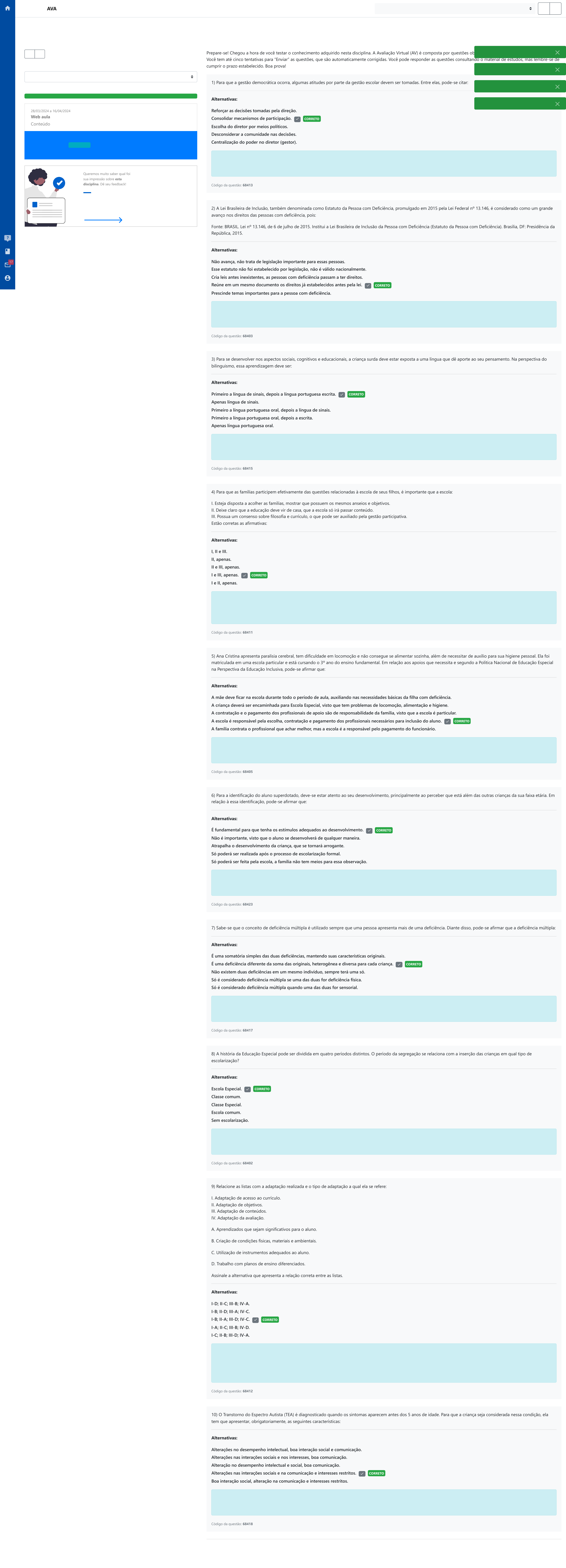 Cosmos • AVA Gestão e Organização da Escola com Ênfase em Coordenação e Orientação E Legislação e políticas públicas de inclusão e multiculturalidade Professor(a): Gleidis Roberta Guerra (Mestrado acadêmico) Alterar Disciplina Legislação e políticas públicas de inclusão e multiculturalidade Progresso da Disciplina 100% Queremos muito saber qual foi sua impressão sobre esta disciplina. Dê seu feedback! Pesquisa de opinião 28/03/2024 a 16/04/2024 Web aula Conteúdo 1) 2) 3) 4) 5) 6) 7) 8) 9) 10) Prepare-se! Chegou a hora de você testar o conhecimento adquirido nesta disciplina. A Avaliação Virtual (AV) é composta por questões objetivas e corresponde a 100% da média final. Você tem até cinco tentativas para “Enviar” as questões, que são automaticamente corrigidas. Você pode responder as questões consultando o material de estudos, mas lembre-se de cumprir o prazo estabelecido. Boa prova! Para que a gestão democrática ocorra, algumas atitudes por parte da gestão escolar devem ser tomadas. Entre elas, pode-se citar: Alternativas: Reforçar as decisões tomadas pela direção. Consolidar mecanismos de participação. CORRETO Escolha do diretor por meios políticos. Desconsiderar a comunidade nas decisões. Centralização do poder no diretor (gestor). Código da questão: 68413 A Lei Brasileira de Inclusão, também denominada como Estatuto da Pessoa com Deficiência, promulgado em 2015 pela Lei Federal nº 13.146, é considerado como um grande avanço nos direitos das pessoas com deficiência, pois: Fonte: BRASIL. Lei nº 13.146, de 6 de julho de 2015. Institui a Lei Brasileira de Inclusão da Pessoa com Deficiência (Estatuto da Pessoa com Deficiência). Brasília, DF: Presidência da República, 2015. Alternativas: Não avança, não trata de legislação importante para essas pessoas. Esse estatuto não foi estabelecido por legislação, não é válido nacionalmente. Cria leis antes inexistentes, as pessoas com deficiência passam a ter direitos. Reúne em um mesmo documento os direitos já estabelecidos antes pela lei. CORRETO Prescinde temas importantes para a pessoa com deficiência. Código da questão: 68403 Para se desenvolver nos aspectos sociais, cognitivos e educacionais, a criança surda deve estar exposta a uma língua que dê aporte ao seu pensamento. Na perspectiva do bilinguismo, essa aprendizagem deve ser: Alternativas: Primeiro a língua de sinais, depois a língua portuguesa escrita. CORRETO Apenas língua de sinais. Primeiro a língua portuguesa oral, depois a língua de sinais. Primeiro a língua portuguesa oral, depois a escrita. Apenas língua portuguesa oral. Código da questão: 68415 Para que as famílias participem efetivamente das questões relacionadas à escola de seus filhos, é importante que a escola: I. Esteja disposta a acolher as famílias, mostrar que possuem os mesmos anseios e objetivos. II. Deixe claro que a educação deve vir de casa, que a escola só irá passar conteúdo. III. Possua um consenso sobre filosofia e currículo, o que pode ser auxiliado pela gestão participativa. Estão corretas as afirmativas: Alternativas: I, II e III. II, apenas. II e III, apenas. I e III, apenas. CORRETO I e II, apenas. Código da questão: 68411 Ana Cristina apresenta paralisia cerebral, tem dificuldade em locomoção e não consegue se alimentar sozinha, além de necessitar de auxílio para sua higiene pessoal. Ela foi matriculada em uma escola particular e está cursando o 3º ano do ensino fundamental. Em relação aos apoios que necessita e segundo a Política Nacional de Educação Especial na Perspectiva da Educação Inclusiva, pode-se afirmar que: Alternativas: A mãe deve ficar na escola durante todo o período de aula, auxiliando nas necessidades básicas da filha com deficiência. A criança deverá ser encaminhada para Escola Especial, visto que tem problemas de locomoção, alimentação e higiene. A contratação e o pagamento dos profissionais de apoio são de responsabilidade da família, visto que a escola é particular. A escola é responsável pela escolha, contratação e pagamento dos profissionais necessários para inclusão do aluno. CORRETO A família contrata o profissional que achar melhor, mas a escola é a responsável pelo pagamento do funcionário. Código da questão: 68405 Para a identificação do aluno superdotado, deve-se estar atento ao seu desenvolvimento, principalmente ao perceber que está além das outras crianças da sua faixa etária. Em relação à essa identificação, pode-se afirmar que: Alternativas: É fundamental para que tenha os estímulos adequados ao desenvolvimento. CORRETO Não é importante, visto que o aluno se desenvolverá de qualquer maneira. Atrapalha o desenvolvimento da criança, que se tornará arrogante. Só poderá ser realizada após o processo de escolarização formal. Só poderá ser feita pela escola, a família não tem meios para essa observação. Código da questão: 68423 Sabe-se que o conceito de deficiência múltipla é utilizado sempre que uma pessoa apresenta mais de uma deficiência. Diante disso, pode-se afirmar que a deficiência múltipla: Alternativas: É uma somatória simples das duas deficiências, mantendo suas características originais. É uma deficiência diferente da soma das originais, heterogênea e diversa para cada criança. CORRETO Não existem duas deficiências em um mesmo indivíduo, sempre terá uma só. Só é considerado deficiência múltipla se uma das duas for deficiência física. Só é considerado deficiência múltipla quando uma das duas for sensorial. Código da questão: 68417 A história da Educação Especial pode ser dividida em quatro períodos distintos. O período da segregação se relaciona com a inserção das crianças em qual tipo de escolarização? Alternativas: Escola Especial. CORRETO Classe comum. Classe Especial. Escola comum. Sem escolarização. Código da questão: 68402 Relacione as li