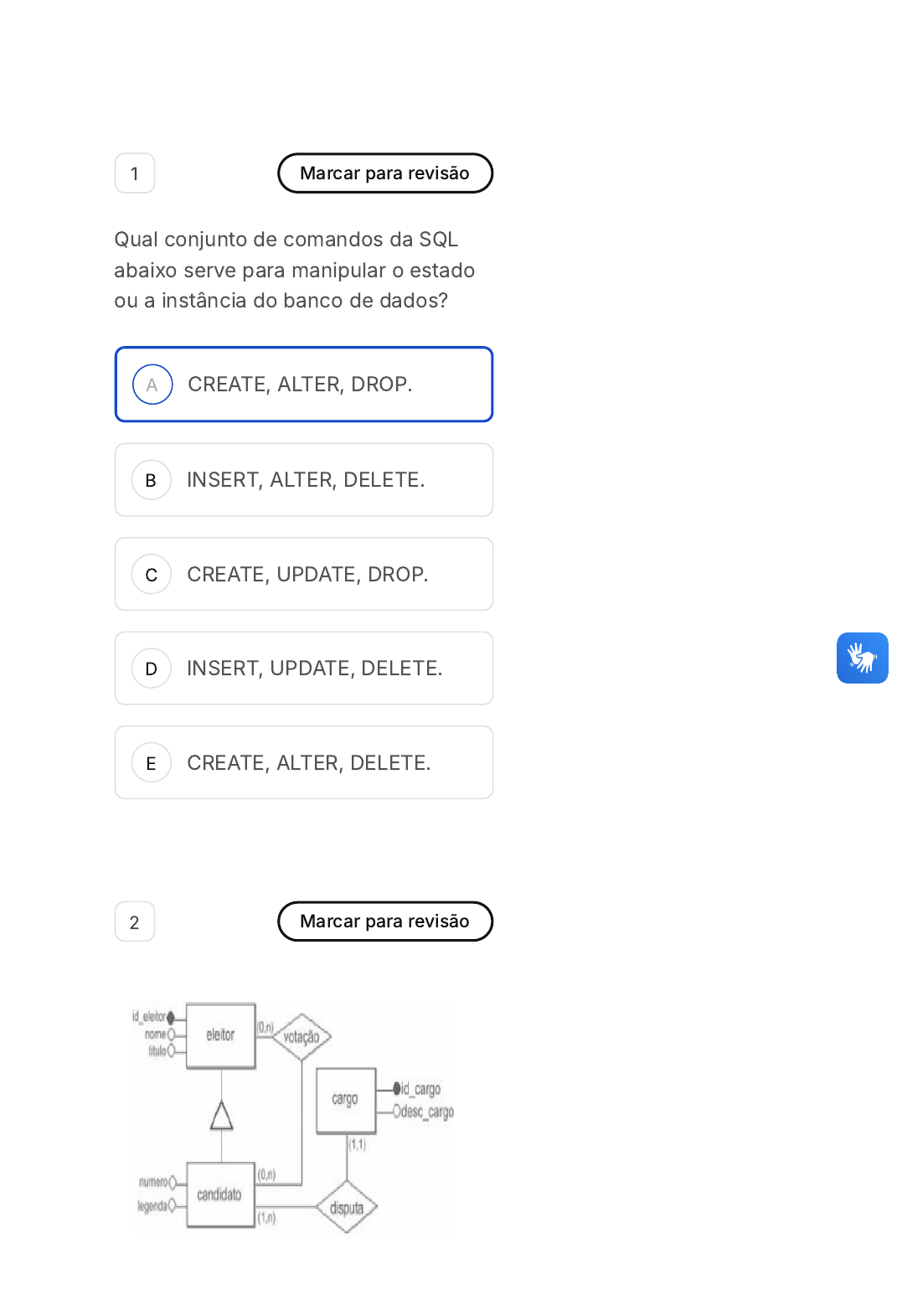 A B C D E 1 Marcar para revisão Qual conjunto de comandos da SQL abaixo serve para manipular o estado ou a instância do banco de dados? CREATE, ALTER, DROP. INSERT, ALTER, DELETE. CREATE, UPDATE, DROP. INSERT, UPDATE, DELETE. CREATE, ALTER, DELETE. 2 Marcar para revisão A B A figura acima apresenta o modelo entidade relacionamento �ER) de uma situação hipotética que considera eleitores votando em candidatos a cargo público em uma eleição. O processo de mapeamento do modelo ER para o modelo relacional gera relações. Assinale a opção que apresenta as relações corretas que serão geradas ao mapear o modelo ER apresentado para o modelo relacional. Considere a seguinte notação: �PK� - atributos que compõem a chave primária e �FK� - atributos que compõe a chave estrangeira. eleitor (id_eleitor(pk), nome, titulo) candidato (id_eleitor(pk)(fk), numero, legenda, id_cargo(fk)) votação((id_eleitor_eleitor(fk), id_eleitor_candidato(fk))(pk)) cargo(id_cargo(pk), desc_cargo) eleitor (id_eleitor(pk), nome, titulo) candidato (id_eleitor(pk), numero, legenda, id_cargo(fk)) cargo (id_cargo(pk), desc_cargo) votação((id_eleitor_eleitor, id_eleitor_candidato)(pk)) C D E eleitor (id_eleitor(pk), nome, titulo) candidato (id_eleitor(pk), numero, legenda, id_cargo(fk)) cargo (id_cargo(pk), desc_cargo) votação((id_eleitor_eleitor(fk), id_eleitor_candidato(fk))(pk)) eleitor (id_eleitor(pk), nome, titulo) candidato (id_eleitor(pk) (fk), numero, legenda) cargo (id_cargo(pk), desc_cargo, id_eleitor(fk)) votação((id_eleitor_eleitor(fk), id_eleitor_candidato(fk))(pk)) eleitor_candidato ((id_eleitor ( pk), nome, titulo,numero,legenda, id_cargo(fk)) votação((id_eleitor_eleitor(fk), id_eleitor_candidato(fk))(pk)) cargo (id_cargo(pk), desc_cargo) 3 Marcar para revisão Qual dos fatores a seguir não deve ser levado em consideração ao implementarmos um banco de dados A B C D E A B C levando em conta questões de desempenho? Consultas e transações de banco de dados. Organização de políticas de acesso a dados. Restrições de tempo de consulta e transações. Frequências esperadas de operações de atualização. Restrições de exclusividade em colunas da tabela. 4 Marcar para revisão Que invenção da IBM permitiu a utilização dos computadores na implementação de sistemas de informação, inaugurando a chamada era do processamento de dados? O disco magnético. A memória RAM. Os arquivos eletrônicos. D E A B C D E O modelo relacional de dados. O microcomputador. 5 Marcar para revisão NoSQL é um termo usado para se referir a uma categoria de sistemas de gerenciamento de banco de dados �SGBDs� que são diferentes dos bancos de dados relacionais tradicionais. O que significa NoSQL em bancos de dados? Nenhum SQL é permitido. Apenas SQL é permitido. Não somente SQL. Novo SQL. Nenhuma base de dados SQL. 6 Marcar para revisão A B C D E Qual conjunto de comandos da SQL abaixo serve para o administrador do banco de dados gerenciar os metadados de um banco de dados? CREATE, MODIFY, DELETE. INSERT, ALTER, REMOVE. CREATE, ALTER, DROP. INSERT, UPDATE, DELETE. CREATE, ALTER, DELETE. 7 Marcar para revisão Após a análise dos requisitos de um projeto de banco de dados para representar as estradas de um país, obteve-se as seguintes especificações: As estradas são descritas pelo nome oficial, apelido (pode ser mais de um), tipo, extensão. As estradas se classificam em: Federais, estaduais e municipais. As estradas se dividem em trechos. Porém um trecho pertence sempre a uma única estrada e não poderá fazer parte de outra estrada. Existe o trecho inicial e trecho final de uma estrada. Na criação de um modelo de entidades-relacionamento para o A B C D E problema descrito acima, marque a alternativa correta: TRECHO será modelado como uma especialização de ESTRADA. TRECHO pode ser modelado como uma entidade fraca com relação a ESTRADA. O apelido da estrada será o atributo identificador, pois é o nome pelo qual a estrada é mais conhecida. A classificação das estradas gerará três atributos para a entidade ESTRADA� Federal, estadual e municipal. Teremos três entidades para representar trecho: TRECHO_INICIAL, TRECHO_FINAL e TRECHO. Sendo TRECHO uma entidade fraca que se relaciona com as outras duas. 8 Marcar para revisão Em relação aos conceitos de bancos de dados, é correto afirmar que: 00 hora : 39 min : 49 seg Ocultar Questão 10 de 10 Respondidas �10� Em branco �0� 1 2 3 4 5 6 7 8 9 10 SM1 Banco De Dados A B C D E Um atributo não pode possuir cardinalidade. Um relacionamento não pode possuir cardinalidade. Um atributo pode possuir cardinalidade de relacionamentos. O conjunto de valores que um atributo pode assumir é a cardinalidade do atributo. Em uma generalização/especialização total, para cada ocorrência da entidade genérica, existe sempre uma ocorrência em uma das entidades especializadas. 9 Marcar para revisão Em Modelo de Entidade de Relacionamento, possuímos entidades e atributos. A esse respeito, analise as assertivas e assinale a alternativa que aponta a(s) correta(s). I. O objeto básico de um MER é uma entidade, "algo" do mundo real, com uma existência independente. II. Uma entidade pode ser um objeto com uma existência física (por exemplo, uma pessoa, um carro, uma casa ou um funcionário) ou um objeto Finalizar prova A B C D E com uma existência conceitual (por exemplo, uma empresa, um trabalho ou um curso universitário). III. Os valores dos atributos que descrevem cada entidade se tornarão a maior parte dos dados armazenados no banco de dados. IV. Cada entidade tem atributos ¿ propriedades particulares que a descrevem. Por exemplo, uma entidade empregada pode ser descrita pelo nome do empregado, idade, endereço, salário e trabalho (função). Apenas I. Apenas I, II e III. Apenas I, III e IV. Apenas II, III e IV. I, II, III e IV. 10 Marcar para revisão Em um projeto de banco de dados, a desnormalização é 