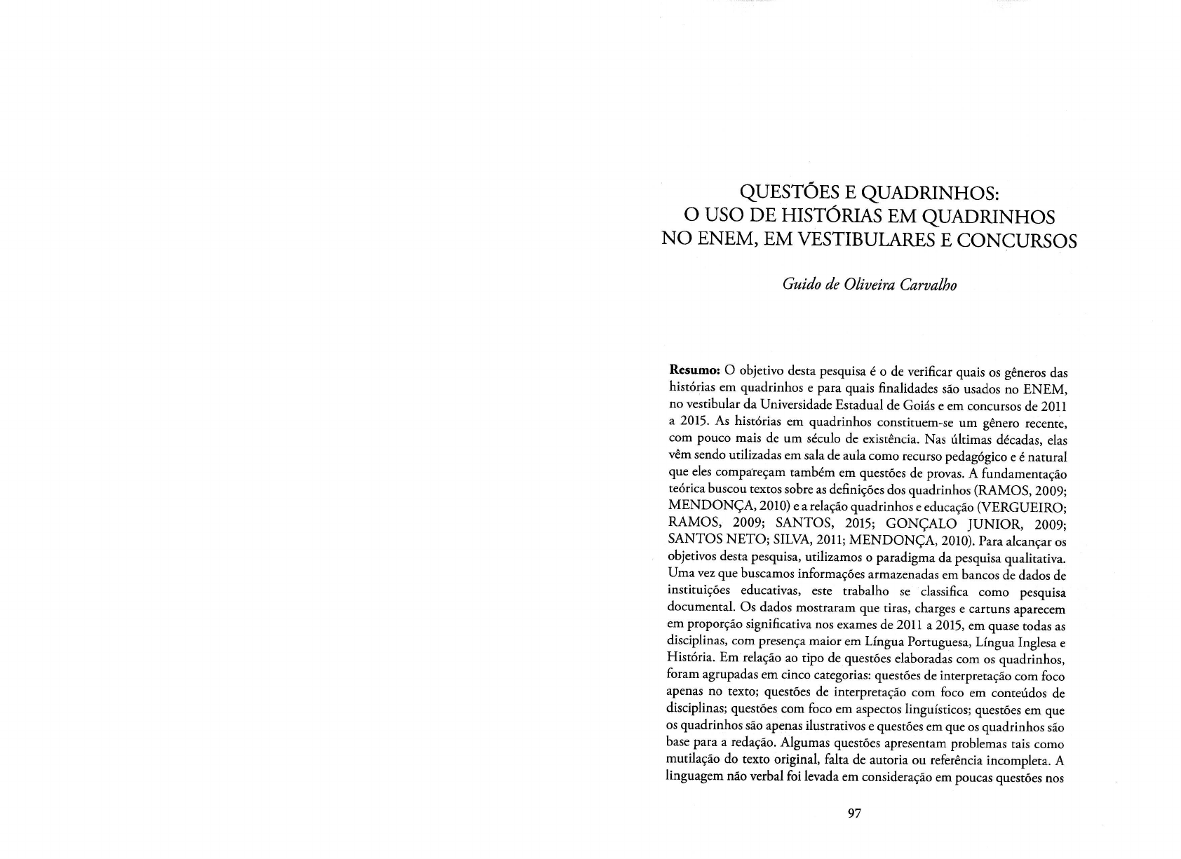 QUESTÕES E QUADRINHOS: O USO DE HISTÓRIAS EM QUADRINHOS NO ENEM, EM VESTIBULARES E CONCURSOS Guido de Oliveira Carvalho Resumo: O objetivo desta pesquisa é o de verificar quais os gêneros das histórias em quadrinhos e para quais finalidades são usados no ENEM, no vestibular da Universidade Estadual de Goiás e em concursos de 2011 a 2015. As histórias em quadrinhos constituem-se um género recente, com pouco mais de um século de existência. Nas últimas décadas, elas vêm sendo utilizadas em sala de aula como recurso pedagógico e é natural que eles compareçam também em questões de provas. A fundamentação teórica buscou textos sobre as definições dos quadrinhos (RAMOS,2009; MENDONÇA,2010)e a relação quadrinhose educação (VERGUEIRO; RAMOS, 2009; SANTOS, 2015; GONÇALO JUNIOR, 2009; SANTOS NETO;SILVA, 2011; MENDONÇA,2010). Para alcançar os objetivos desta pesquisa,utilizamos o paradigmada pesquisa qualitativa. Umavez que buscamosinformações armazenadas em bancos de dados de instituições educativas, este trabalho se classifica como pesquisa documental. Os dados mostraram quetiras, charges e cartuns aparecem em proporção significativa nos exames de 2011 a 2015, em quase todas as disciplinas, com presença maior em Língua Portuguesa, Língua Inglesa e História. Em relação ao tipo de questões elaboradas com os quadrinhos, foram agrupadas em cinco categorias: questões de interpretação com foco apenas no texto; questões de interpretação com foco em conteúdos de disciplinas; questões com foco em aspectoslinguísticos; questões em que os quadrinhossão apenasilustrativos e questões em que os quadrinhos são base para a redação. Algumas questões apresentam problemas tais como mutilação do texto original, falta de autoria ou referência incompleta. A linguagem não verbal foi levada em consideração em poucas questões nos 97 LINGUAGENS, IDENTIDADES E ENSINO Os quadrinhos começaram a ser visto de outra forma pelos educadores de forma tímida, a partir dos anos 40 do Século XX. Primeiro, com algumas experiências isoladas de professores, depois marcando presença em livros didáticos e, por fim, sendo objeto de estudos acadêmicos. De acordo com Santos Neto Silva (2011), já na década de 40, os Estados Unidos começaram a explorar o caráter educacional dos quadrinhos: cartilhas educativas em forma de quadrinhos, ilustrações em livros didáticos, biografias de pessoas famosas e adaptações de clássicos literários para esse gênero, como a famosa série Classics Illustrated. Entretanto, segundo Santos (2015) e Gonçalo Junior (2009), os europeus foram os pioneiros, na década de 60, em considerar os produtos da comunicação de massa — à qual pertenciam os quadrinhos — objeto de estudos acadêmicos. Ramos (2006) informa que os primeiros estudos sobre quadrinhos no Brasil se desenvolveram a partir do fim dos anos 60. Vergueiro e Ramos (2009) estabelecem os anos 90 como a data da mudança definitiva da relação dos quadrinhos com a educação. Isso ocorreu devido aos documentos oficiais trazerem menções aos quadrinhos e indicarem seu uso na educação. Primeiro a Lei de Diretrizes e Bases, promulgada em 20 de dezembro de 1996, traz em seu texto a necessidade de inserção de outras linguagens nos ensinos fundamental e médio (art. 3º, item II, e art. 36, S 19, item ID. Em 1998, é a vez dos Parâmetros Curriculares Nacionais de Arte mencionarem a necessidade de o aluno ser competente na leitura de quadrinhos, enquanto os PCNs de Língua Portuguesa propõem o estudo através de gêneros (considerando quadrinhos como gênero, eles seriam, sem dúvida, parte dos estudos), e os PCNs do ensino Médio, no volume Linguagens, Códigos e suas Tecnologias, informam a necessidade de estudos da linguagem dos quadrinhos. Em 2006, o PNBE (Programa Nacional Biblioteca da Escola), que compralivros para distribuir às escolas de ensino fundamental e 100 Questões e quadrinhos médio, traz em sualista, obras de quadrinhos. Em princípio, poucas obras e, em sua maioria, adaptações literárias, contudo, nos anos subsequentes o número de HQs aumentou e o critério de ser adaptação literária deixou de ser prioritário na escolha da obra. Santos Neto e Silva (2011) destacam que é preciso critérios para escolher os quadrinhos — assim como qualquer outra mídia produzida pelo homem — para se trabalhar nasala de aula. Não se pode pensar que os quadrinhos “como um recurso para distrair” (SANTOS NETO; SILVA, 2011, p. 31, grifo dos autores), como uma leitura recreativa (RAMOS,2006), ou “como uma espécie de panaceia que atende a todo e qualquer objetivo educacional, como se eles possuíssem algum característica mágica capaz de transformar pedra em ouro” (VERGUEIRO,2004,p. 27). Em vista dos novos estudos sobre quadrinhos e educação, nas últimas décadas, têm surgido muitos textos versando sobre a aplicação deles em diferentes áreas como matemática, geografia, língua portuguesa, história, física, língua inglesa etc. Para Vergueiro (2004, p. 26), “o único limite para seu bom aproveitamento em qualquer sala de aula é a criatividade do professor e sua capacidade de bem utilizá-los para atingir seus objetivos de ensino”. Tiras, charges e cartuns Abordaremosos gêneros tiras, charges e cartunsnesta seção em virtude de serem os gêneros mais utilizados nas questões estudadas. Ástiras recebem diversos nomes: tira de jornal, tira diária,tira jornalística, tira de humor, tiras humorísticas ou tirinha (RAMOS, 2007). Publicadas principalmente em jornais, atualmente são compiladas em revistas ou álbuns e têm sido lançadas em sites ou blogs na internet. Ramos (2007, p. 276) define o formato da seguinte maneira: À tira, como se vê, tem diferentes acepções, que ficam em torno de três eixos: quadrinhos (a linguagem utilizada), 101 LINGUAGENS, IDENTIDADES E ENSINO jornal (o local privilegiado de publicação) e cômico ou de