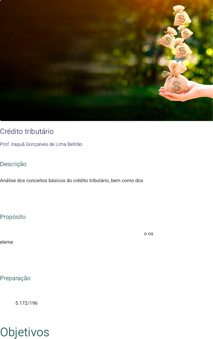 Crédito tributário Prof. Irapuã Gonçalves de Lima Beltrão Descrição Análise dos conceitos básicos do crédito tributário, bem como dos elementos trazidos pelo Código Tributário Nacional (CTN) para o vínculo obrigacional. Propósito Compreender os conceitos básicos do crédito tributário, absorvendo os elementos trazidos pelo CTN para o vínculo obrigacional, é de fundamental importância ao necessário conhecimento para atuação jurídico-profissional na área do Direito Tributário. Preparação Antes de iniciar a apresentação deste conteúdo, tenha em mãos o CTN (Lei nº 5.172/1966). Objetivos Módulo 1 Conceito, constituição e suspensão do crédito tributário Reconhecer o conceito, a constituição e a suspensão do crédito tributário. Módulo 2 Extinção do crédito tributário Identificar as situações de extinção do crédito tributário. Módulo 3 Exclusão do crédito tributário. Privilégios e garantias do crédito Analisar a exclusão, as garantias e os privilégios tributários. Como sabido, o tributo representa a principal receita obtida compulsoriamente pelo Estado-tributante do particular- contribuinte. O ordenamento jurídico nacional organizou tal dever como um vínculo obrigacional, tendo o CTN disciplinado, de forma lógica, a relação jurídico-tributária. Podemos identificar três momentos que ensejam a formação do dever tributário: Lei: define, abstrata e genericamente, a obrigação tributária. Fato gerador: que concretiza a situação definida em lei. Introdução 1 - Conceito, constituição e suspensão do crédito tributário Ao fim do módulo, você será capaz de reconhecer o conceito, a constituição e a suspensão do crédito tributário. Conceito Para a perfeita visualização da obrigação, de modo que o sujeito passivo encontre-se pronto a cumpri-la, vejamos o esquema a seguir dos três momentos que ensejam a formação do dever tributário, conforme vimos na introdução: Lançamento: medida adotada pela autoridade estatal buscando verificar a ocorrência do fato gerador, formalizando o ocorrido e traduzindo o valor devido. Com o lançamento, marca-se a transição da obrigação para o crédito, que será analisado ao longo deste conteúdo. Uma vez ocorrida a obrigação tributária, faltaria traduzir tal dever para sua expressão econômica, que vai se materializar, então, com a formação do crédito tributário. Esse é, portanto, o reconhecimento formal do sujeito ativo de uma obrigação com cunho pecuniário, resultante de um fato gerador produzido pelo sujeito passivo. Por ter tal função, podemos afirmar, sem dúvida, que o crédito tributário nasce da obrigação principal, tendo, portanto, os mesmos limites, as mesmas características e a mesma natureza daquela obrigação (art. 139 do CTN). Nos dizeres do CTN, em especial no art. 142, caberá à Administração Pública, por meio do lançamento, constituir o crédito tributário. Assim, é esse procedimento administrativo que vai permitir à Administração tornar a obrigação tributária algo líquido e certo, passível de exigência pela Fazenda. Ainda segundo o CTN, em seu art. 140, a obrigação principal tem certo grau de independência do crédito tributário. Isso quer dizer que não é afetada pelas circunstâncias que venham a modificar o crédito. Dessa forma, se o processo de lançamento for anulado, suspenso ou interrompido, a obrigação subsistirá, perfeita e intocável. Igualmente, o crédito tributário pode ser excluído (isenção/anistia), mas a obrigação permanecerá inalterada. Exemplo Se, por equívoco, figurar em lançamento como sujeito passivo quem não o seja, nem por isso será afetada a obrigação. A correção poderá ser feita para exigir o cumprimento da obrigação por parte do verdadeiro devedor. Em relação ao crédito, vale dizer que, depois de regularmente constituído, somente poderá ser modificado nos casos expressamente determinados pelo próprio CTN (art. 141). Devemos ainda reconhecer que o crédito estará definitivamente constituído quando terminado todo o procedimento da atividade do lançamento, estando cientes de que o último ato deste é a notificação do sujeito passivo pela Fazenda Pública. Lançamento O art. 142 do CTN traz o conceito legal de lançamento. A função deste é individualizar a obrigação prevista em abstrato pela lei e surgida em concreto com a ocorrência do fato gerador. Na verdade, o lançamento compete sempre à autoridade administrativa, e em relação a esta é um dever vinculado e obrigatório, sob pena de responsabilidade funcional. Para a Administração Pública, já conhecemos a noção de atos discricionários e vinculados, o que nos faz repetir que, ocorrido o fato gerador, deve, necessariamente, o representante da Fazenda Pública efetuar vinculadamente o lançamento. Para tanto, deve cumprir as seguintes funções: Atestar a ocorrência do fato gerador. Determinar a matéria tributável, ou seja, a base de cálculo no caso concreto. Calcular o montante devido. Conclui-se, então, que o lançamento vai unicamente formalizar a obrigação, isto é, dar as “formas” da respectiva obrigação tributária. A autoridade administrativa não pode inventar nem criar nada no lançamento. Deve apenas verificar a ocorrência do fato gerador e declarar os elementos da obrigação tributária. Normas aplicáveis e o direito intertemporal Os arts. 143 e 144 do próprio CTN constituem a ideia de que tal atividade deve traduzir o ocorrido no momento do fato gerador, ao determinar que o lançamento será egulado pelas circunstâncias fáticas e legais vigentes à época da ocorrência do fato gerador. Assim, se o fato gerador envolver circunstância mensurável em moeda estrangeira, salvo disposição em contrário, será utilizada a conversão pelos padrões vigentes no momento do fato gerador. De igual forma, a lei que rege os elementos básicos do tributo será aquela vige