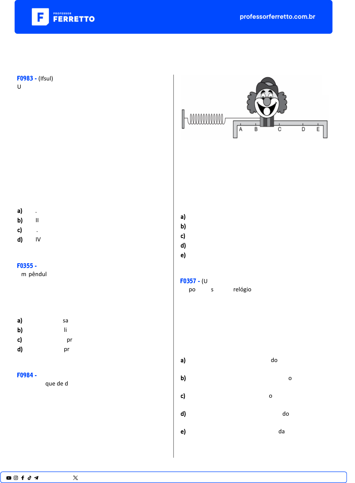MHS F0983 - (Ifsul) Uma par�cula oscila em movimento harmônico simples ao longo de um eixo x entre os pontos x1 = –35 cm e x2 = 15 cm. Sabe-se que essa par�cula leva 10 s para sair da posição x1 e passar na posição x = –10 cm. Analise as seguintes afirma�vas referentes ao movimento dessa par�cula: I. A amplitude do movimento é igual a 50 cm e a posição de equilíbrio é o ponto x = 0. II. Na posição x = –10 cm, a velocidade da par�cula a�nge o valor máximo. III. Nos pontos x1 = –35 cm e x2 = 15 cm, a velocidade da par�cula é nula. IV. O período do movimento é 10 s. Estão corretas apenas as afirma�vas a) I e II. b) II e III. c) I e IV. d) III e IV. F0355 - (Ifsul) Um pêndulo simples é formado por um pequeno corpo de massa igual a 100 g, preso a um fio de massa desprezível e comprimento igual a 2 m, oscilando com uma amplitude de 10 cm. Querendo-se diminuir o período de oscilação, basta a) diminuir a massa do corpo. b) diminuir a amplitude da oscilação. c) aumentar o comprimento do fio. d) diminuir o comprimento do fio. F0984 - (Unesp) Em um parque de diversões, existe uma atração na qual o par�cipante tenta acertar bolas de borracha na boca da figura de um palhaço que, presa a uma mola ideal, oscila em movimento harmônico simples entre os pontos extremos A e E, passando por B, C e D, de modo que em C, ponto médio do segmento AE, a mola apresenta seu comprimento natural, sem deformação. Uma pessoa, ao fazer suas tenta�vas, acertou a primeira bola quando a boca passou por uma posição em que o módulo de sua aceleração é máximo e acertou a segunda bola quando a boca passou por uma posição onde o módulo de sua velocidade é máximo. Dos pontos indicados na figura, essas duas bolas podem ter acertado a boca da figura do palhaço, respec�vamente, nos pontos a) A e C. b) B e E. c) C e D. d) E e B. e) B e C. F0357 - (Ufla) Os ponteiros de um relógio do �po cuco são movidos por um pêndulo simples. O pêndulo desses relógios possui um disposi�vo para que se ajuste seu comprimento de acordo com a estação do ano. Considere um relógio cujo pêndulo tenha sido ajustado para temperatura de 20°C. Para que esse relógio tenha um funcionamento sa�sfatório num local onde a temperatura média no inverno é de 10°C e, no verão, 30°C, deve-se a) no inverno diminuir o tamanho do pêndulo e no verão aumentar. b) no inverno e no verão aumentar o tamanho do pêndulo. c) no inverno e no verão diminuir o tamanho do pêndulo. d) no inverno aumentar o tamanho do pêndulo e no verão diminuir. e) conservar o mesmo ajuste em todas as estações do ano. 1@professorferretto @prof_ferretto F0982 - (Uece) Se fossem desprezados todos os atritos e re�rados os amortecedores, um automóvel parado em uma via horizontal poderia ser tratado como um sistema massa mola. Suponha que a massa suspensa seja de 1.000 kg e que a mola equivalente ao conjunto que o sustenta tenha coeficiente elás�co k. Como há ação também da gravidade, é correto afirmar que, se o carro oscilar ver�calmente, a frequência de oscilação a) não depende da gravidade e é função apenas do coeficiente elás�co k. b) é função do produto da massa do carro pela gravidade. c) não depende da gravidade e é função da razão entre k e a massa do carro. d) depende somente do coeficiente elás�co k. F0359 - (Ufop) Dois sistemas oscilantes, um bloco pendurado em uma mola ver�cal e um pêndulo simples, são preparados na Terra de tal forma que possuam o mesmo período. Se os dois osciladores forem levados para a Estação Espacial Internacional (ISS), como se comportarão os seus períodos nesse ambiente de microgravidade? a) Os períodos de ambos os osciladores se manterão os mesmos de quando estavam na Terra. b) O período do bloco pendurado na mola não sofrerá alteração, já o período do pêndulo deixará de ser o mesmo. c) O período do pêndulo será o mesmo, no entanto o período do bloco pendurado na mola será alterado. d) Os períodos de ambos os osciladores sofrerão modificação em relação a quando estavam na Terra. F0981 - (Ufu) Considere duas situações em que dois pêndulos (A e B) de mesmo comprimento oscilam livremente em um cenário isento de resistência do ar. A esfera A tem o mesmo volume que a B, todavia, por serem de materiais diferentes, a densidade de A é um terço da de B. Ambas são soltas da mesma altura e do repouso para iniciarem a oscilação. Com base na situação descrita, são feitas algumas afirmações. I. O período de oscilação de A é igual ao de B. II. A velocidade com que B passa pelo ponto mais baixo da trajetória é três vezes maior do que a velocidade com que A passa pelo mesmo ponto. III. A aceleração com que B passa pelo ponto mais baixo da trajetória é maior do que a de A nesse mesmo ponto. Em relação às afirmações acima, marque V para as verdadeiras e F para as falsas e assinale a alterna�va correta. a) I – F; II – V; III – F. b) I – V; II – F; III – V. c) I – F, II – V; III – V. d) I – V; II – F; III – F. F0353 - (Ufrgs) A figura abaixo representa o movimento de um pêndulo que oscila sem atrito entre os pontos x1 e x2. Qual dos seguintes gráficos melhor representa a energia mecânica total do pêndulo – ET – em função de sua posição horizontal? 2@professorferretto @prof_ferretto a) b) c) d) e) F0603 - (Enem) Chris�aan Huygens, em 1656, criou o relógio de pêndulo. Nesse disposi�vo, a pontualidade baseia-se na regularidade das pequenas oscilações do pêndulo. Para manter a precisão desse relógio, diversos problemas foram contornados. Por exemplo, a haste passou por ajustes até que, no início do século XX, houve uma inovação, que foi sua fabricação usando uma liga metálica que se comporta regularmente em um largo intervalo de temperaturas. YODER, J. G. Unrolling Time: Chris�aan Huygens and the mathema�za�on of nature. Cambridge: 