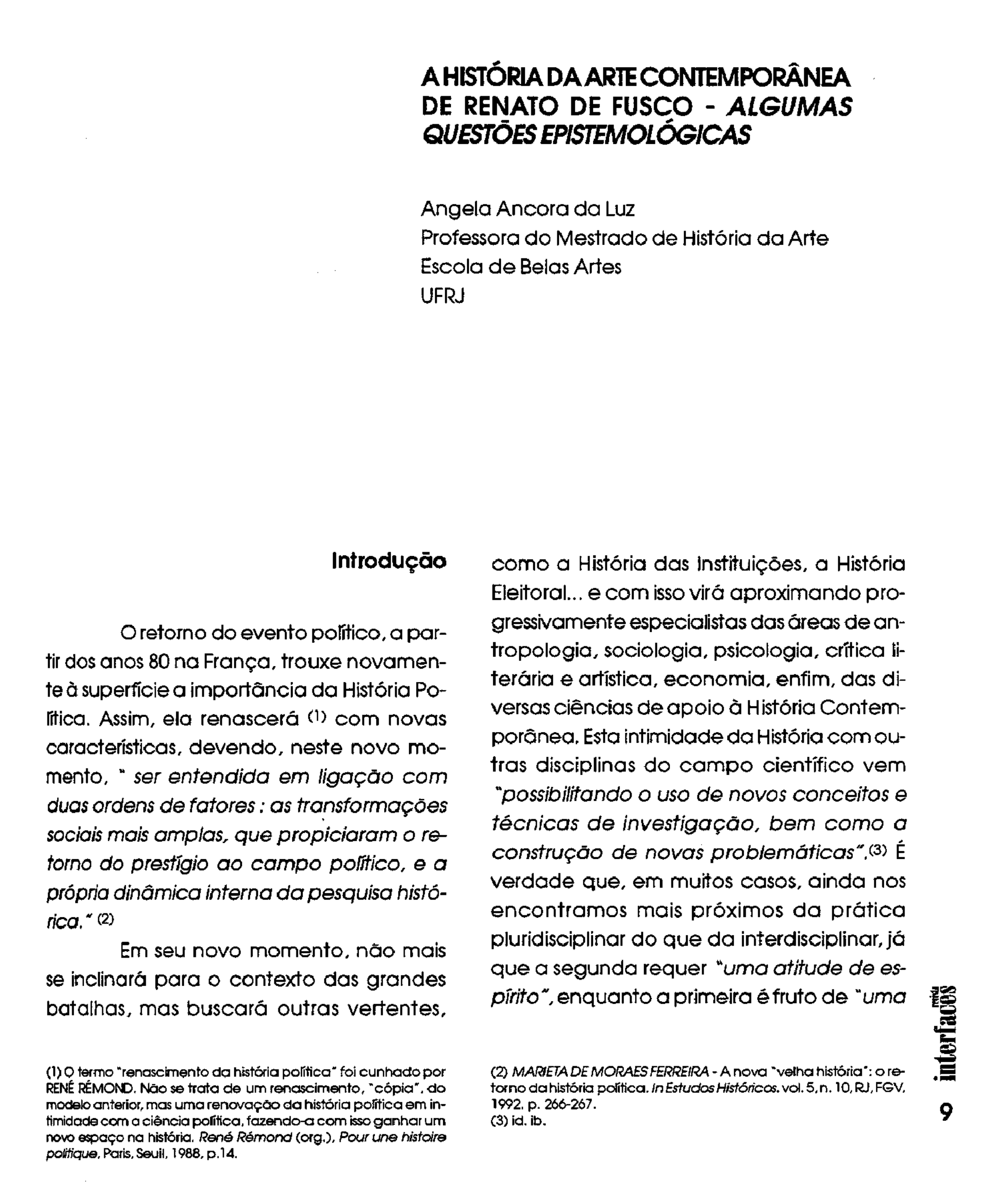 AHISTÓRIA DAARTE CONTEMPORÃNEA DE RENATO DE FUSQO - ALGUMAS QUEST OES EPISTEMOL OGICAS Angela Ancora da Luz Professora do Mestrado de Historia da Arie Escola de Belas Aries UFRJ Introdução O retorno do evento politico, a par- rir dos anos 80 na França. Trouxe novamen- Te & superfície a importancia da Historia Po— riiica. Assim, ela renascera (1) com novas caracterís'rioas, devendo, nesie novo mo- mento, " ser entendido em iigaçao com duas ordens de fatores : as Transformações sociais mais amp las, que propiciaram a re- torno do prestígio ao campo pafãico, e a propria dinâmica inferno da pesquisa histo- rica. ” (º) Em seu novo momento, nao mais se inclinara para o conrexio das grondes batalhas, mas buscara outras verienies, (1) O Termo ªrenoso irnento da história política" foi cunhado por RENÉ REMONl Nao se trata de um renascimento, “copia”. do modelo anferior, mas uma renauaçao da historia poíí'rica em in- timidade corn a ciência políiica. fazendo-a com isso ganhar um novo espaço na historia. Rene Romana (ora,), Pour une riisiaire pon'iiaue. Paris. Seuil, 1983, p.14. como a História das lnsfiruíções, a História Eleitoral... e com isso vira aproximando pro-— ªgressivamente especialistas das areas de an— Tropologio, sociologia, psicoiogia, crítica ii- ieraria e artística, economia, enfim, das di- versas ciências de apoio a História Contem- poranea. Esia intimidade da Historia com ou- 1ras disciplinas do campo científico vem “possipiiirando o uso de novos conceiros e Técnicas de investigação... bem como a consfruçao de novas problemáticas ".(3) É verdade que, em muitos casos, ainda nos encontramos mais próximos da pratica pluridísciplinar do que da inserdisciplinar, ja que a segunda requer “uma arirude de es- pirito ”,. enquanto a primeira efru'ro de “uma (2) MA.-'?!ETA DE MORAESFERREIRÁ - A nova “velha his'rória': o re- torno da hisforia política. in Estudos Hisfórícasr sroL 5. n. 10, RJ, FGM“. 1%2. p. esszsr. (3) ia. ib. m. HGBS tori “ºlll 'IO irnagr'neçee criedera e campinaieria, se- ben de man ejer cenceiies e méredes diver- ses. '" (4) O fale resulla nie lera uma imperldn- cia inieleclual significative, peis a inler- disciplinariedade vem sende cada vez mais buscada cerne recursc de alcançar a he— mem na sua múhªipla abrangência. Alias, esle caraler é própria da epislemelegia cerne disciplina, uma vez que ele busca “es—- fuder a gênese e e esrrurura des cenheci— rnenres cienrifices. Mais precisemen re, e de lenrer pesquisar es leis reais de preduçae desses cenhecimenies, lente de penre de vista legice, duenre des pentes de Visie lin- guisiice, secieiegice, ideeiegice, erc“. ” (5) É neste ambíle due lrdzerncs &: analise urna imperlanle ebra da hista- riegrafia da arte, escrlle em 1983 per Rene- lc De Fusce, Sierie deli'Arle Contemporâ- nee, em seu lilule eriginal, traduzida per Maria Jerge Vilar de Figueiredo para a lín- gua perluguesa e editada em Lisboa, em 1988, pela Edilcriai Presença lee. Sobre e auler, lema-se necessdrie esclarecer que Renala De Fusce nasceu em 1929 na cidade de Nepeies na Italia, sende aluanle na censlruçae de pensamenlc de moderna Hisªlericl de Arie desde el década de sessenla, duer cerne prefesscr de Hislô- ria de Arquilelura na Universidade de Na— peles, quer como direler de urna revisla ila- liana de crilice de arle ccnlemperdnea eu, ainda. cerne cular de ebras significalivas ende deslacarnes a que servira &: nessa analise, alem de La Riduziene Cuilure!e(1976) (4) HILTON JAPIASSU - Quesfôesepisiemeiõgicm. RJJrnage, 198L 13881. e Sieria del Design (1988) enlre curras' nae menes imperlanles. Na Hisferie de Arre Cen remperânee. Renale De Fusca precura pensara arle de nesse secule não em uma sucessae de “ismcs”, iae de agrade de uma História “clas- sica". mas segunda seis linhas de Tendências: e da expressee, a da fermalhridade, a de cnirice, a da arle secial, e da arle útil e, final- menle, e da redução. vende—es simullaned- menle. apesar de exislir um residue de anali- se seaúencial na elaperaçeainlima de cada linha. Ele eiabera sinleses inlerpretalivas ende nec nes cenfrenlames cem uma História feciuel e fermal, mas cem urna inferessanle hisleria de aberdagern cr'ilica em suas mais ine- vadercs direções, ende a inserção de fale eu da farma nae sda superles da reliexec, anles, serão as mais diferenles vieses de critica e da leeria que sewirde de direcianamenle a esle neve elher lee cempalivel &: ccnlernpe— raneidade. Outra especie imparlanle e e apre— ximdçde cem e lempe presenle, realizada pelo hisleriader, pais a ebra de Renale De Fusce aborda a preduçâe anísiicd de nesse seculc ele a década de 80, numa Ialilude ainda peucc realizada pelo Hisierieder de Arie, que Tem precurdde refletir sobre e passed—e, algu— mes vezes e pessede mais recente, mas difi- cilmenle sobre e presente, cerne fez a aulcr em 1983. Inleressan're, ainda, a acrescentar e que as inúmeras reproduções seleclenddds. mais de trezentas, sae abras pern recenles e pcuquissime cenhecidas. (5) HILTON JAPLQSHJ - in freduçde depensamenie episrerrreiôgrce. RJ, Frmcisce Alves., 1991. p.38. Arte, História, História da Arte Por sua especificidade, a História da Arte vem sendo vista como um corpo independente da História, quando, na ver- dade, não deveria ser assim. Acreditamos ate que exista uma dupla ligação entre elas. Uma pelo fato de ser também Historia, outra porque a propria arte parte do homem e, se este “existe enquanto se inscreve na histó- ria " (é), como diz Heidegger, então sua arte e prova doou mental de sua existência... É certo que o assunto provoca grande polêmica. Paul Vevne fala de uma “História Axiolãgica ”, para identificar o pon— to de vista que separa a História da Arte da Historia “pura" e, citando Max Weber.. ele alirma que esta história axiológica “não estã orientada para as investigações dos fat