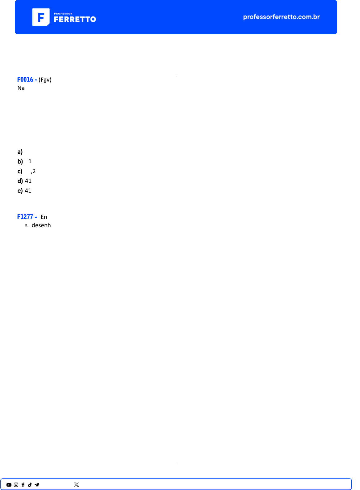 Cinemática F0016 - (Fgv) Na pista de testes de uma montadora de automóveis, foram feitas medições do comprimento da pista e do tempo gasto por um certo veículo para percorrê-la. Os valores ob�dos foram, respec�vamente, 1030,0 m e 25,0 s. Levando-se em conta a precisão das medidas efetuadas, é correto afirmar que a velocidade média desenvolvida pelo citado veículo foi, em m/s, de a) 400 b) 41 c) 41,2 d) 4120 e) 41200 F1277 - (Enem) Nos desenhos animados, com frequência se vê um personagem correndo na direção de um abismo, mas, ao invés de cair, ele con�nua andando no vazio e só quando percebe que não há nada sob seus pés é que ele para de andar e cai ver�calmente. No entanto, para observar uma trajetória de queda num experimento real, pode-se lançar uma bolinha, com velocidade constante (V0), sobre a super�cie de uma mesa e verificar o seu movimento de queda até o chão. Qual figura melhor representa a trajetória de queda da bolinha? 1@professorferretto @prof_ferretto a) b) c) d) e) F1482 - (Pucsp) A afirmação “todo movimento é rela�vo” significa que: a) Todos os cálculos de velocidade são imprecisos. b) Não existe movimento com velocidade constante. c) A velocidade depende sempre de uma força. d) A velocidade depende sempre de uma aceleração. e) A descrição de qualquer movimento requer um referencial. F0020 - (Ifrj) Rússia envia navios de guerra para o Mediterrâneo. Fonte militar disse que envio ocorre devido à situação na Síria. A Marinha negou que a movimentação esteja ligada à crise em Damasco. 29/08/2013 08h32 - Atualizado em 29/08/2013 08h32 A Rússia está enviando dois navios de guerra ao Mediterrâneo Oriental, enquanto potências ocidentais se preparam para uma ação militar na Sina em resposta ao suposto ataque com armas químicas na semana passada. Uma fonte anônima do comando das Forças Armadas disse que um cruzador de mísseis e um navio an�ssubmarino chegariam aos próximos dias ao Mediterrâneo por causa da “situação bem conhecida” – uma clara referência ao conflito na Síria. A Marinha negou que a movimentação esteja ligada aos eventos na Síria e disse que faz parte de uma rota�vidade planejada de seus navios no Mediterrâneo. A força não disse que �po de embarcações, ou quantas, estão a caminho da região. Os Estados Unidos acusam as forças do governo sírio de realizar um ataque com armas químicas na semana passada e disse que está reposicionando suas forças navais no Mediterrâneo. (Portal G1 – h�p://g1.globo.com/revoIta- arabe/no�cia/2013/08/russia-enva-navios-de-guerra- para-o-mediterraneo-diz-agencia.htrnI - Acesso em 30/0912013) 2@professorferretto @prof_ferretto A velocidade dos navios é geralmente medida em uma unidade chamada nó. Um nó equivale a uma velocidade de aproximadamente 1,8 km/h. Um navio russo que desenvolvesse uma velocidade constante de 25 nós, durante 10 horas, percorreria uma distância de: a) 180 km. b) 250 km. c) 430 km. d) 450 km. F1520 - (Ifce) Um veículo parte do repouso em movimento re�líneo e acelera com aceleração escalar constante e igual a 3,0 m/s2. O valor da velocidade escalar e da distância percorrida após 4,0 segundos, valem, respec�vamente a) 12,0 m/s e 24,0 m. b) 6,0 m/s e 18,0 m. c) 8,0 m/s e 16,0 m. d) 16,0 m/s e 32,0 m. e) 10,0 m/s e 20,0 m. F1506 - (Fei) Uma motocicleta, com velocidade de 90 km/h, tem seus freios acionados bruscamente e para após 25 s. Qual é o módulo de aceleração que os freios aplicaram na motocicleta? a) 1 m/s2 b) 25 m/s2 c) 90 m/s2 d) 2250 m/s2 e) 3,6 m/s2 F0639 - (Espcex) Duas polias, A e B, ligadas por uma correia inextensível têm raios RA = 60 cm e RB = 20 cm, conforme o desenho abaixo. Admi�ndo que não haja escorregamento da correia e sabendo que a frequência da polia A é fA = 30 rpm, então a frequência da polia B é a) 10 rpm b) 20 rpm c) 80 rpm d) 90 rpm e) 120 rpm F0674 - (Eear) Um atleta pra�ca salto ornamental, fazendo uso de uma plataforma situada a 5m do nível da água da piscina. Se o atleta saltar desta plataforma, a par�r do repouso, com que velocidade se chocará com a água? Obs.: despreze a resistência do ar e considere o módulo da aceleração da gravidade g = 10 m/s2. a) 10 m/s. b) 20 m/s. c) 30 m/s. d) 50 m/s. F1453 - (Uerj) O rompimento da barragem de contenção de uma mineradora em Mariana (MG) acarretou o derramamento de lama contendo resíduos poluentes no rio Doce. Esses resíduos foram gerados na obtenção de um minério composto pelo metal de menor raio atômico do grupo 8 da tabela de classificação periódica. A lama levou 16 dias para a�ngir o mar, situado a 600 km do local do acidente, deixando um rastro de destruição nesse percurso. Caso alcance o arquipélago de Abrolhos, os recifes de coral dessa região ficarão ameaçados. Com base nas informações apresentadas no texto, a velocidade média de deslocamento da lama, do local onde ocorreu o rompimento da barragem até a�ngir o mar, em km/h, corresponde a: a) 1,6 b) 2,1 c) 3,8 d) 4,6 3@professorferretto @prof_ferretto F0069 - (Uerj) Uma ave marinha costuma mergulhar de uma altura de 20 m para buscar alimento no mar. Suponha que um desses mergulhos tenha sido feito em sen�do ver�cal, a par�r do repouso e exclusivamente sob ação da força da gravidade. Desprezando-se as forças de atrito e de resistência do ar, a ave chegará à super�cie do mar a uma velocidade, em m/s, aproximadamente igual a: a) 20 b) 40 c) 60 d) 80 F0641 - (Unicamp) A volta da França é uma das maiores compe�ções do ciclismo mundial. Num treino, um ciclista entra num circuito reto e horizontal (movimento em uma dimensão) com velocidade constante e posi�va. No instante t1, ele acelera sua bicicleta com uma aceleração constante e posi�va até o instante t2. Entre t2 e t3, ele varia sua velocidade com uma aceleração também constante, porém nega�va. Ao final do percurso, a par�r do instante 