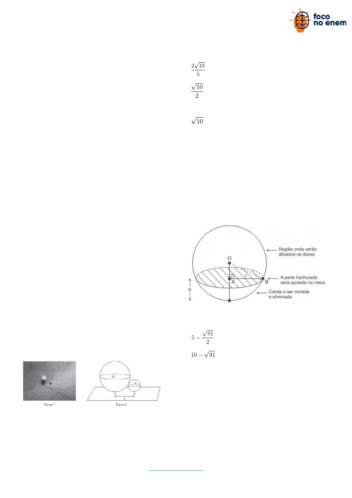 LISTA DE EXERCÍCIOS PARA O ENEM MATEMÁTICA Esferas 01 - (ENEM) Uma empresa farmacêutica produz medicamentos em pílulas, cada uma na forma de um cilindro com uma semiesfera com o mesmo raio do cilindro em cada uma de suas extremidades. Essas pílulas são moldadas por uma máquina programada para que os cilindros tenham sempre 10 mm de comprimento, adequando o raio de acordo com o volume desejado. Um medicamento é produzido em pílulas com 5 mm de raio. Para facilitar a deglutição, deseja-se produzir esse medicamento diminuindo o raio para 4 mm, e, por consequência, seu volume. Isso exige a reprogramação da máquina que produz essas pílulas. Use 3 como valor aproximado para π. A redução do volume da pílula, em milímetros cúbicos, após a reprogramação da máquina, será igual a a.168. b.304. c.306. d.378. e.514. 02 - (ENEM) A bocha é um esporte jogado em canchas, que são terrenos planos e nivelados, limitados por tablados perimétricos de madeira. O objetivo desse esporte é lançar bochas, que são bolas feitas de um material sintético, de maneira a situá-las o mais perto possível do bolim, que é uma bola menor feita, preferencialmente, de aço, previamente lançada. A Figura 1 ilustra uma bocha e um bolim que foram jogados em uma cancha. Suponha que um jogador tenha lançado uma bocha, de raio 5cm que tenha ficado encostada no bolim, de raio 2cm conforme ilustra a Figura 2. Considere o ponto C como o centro da bocha, e o ponto O como o centro do bolim. Sabe-se que A e B são os pontos em que a bocha e o bolim, respectivamente, tocam o chão da cancha, e que a distância entre A e B é igual a d. Nessas condições, qual a razão entre d e o raio do bolim? a.1 b. c. d.2 e. 03 - (ENEM) Para decorar uma mesa de festa infantil, um chefe de cozinha usará um melão esférico com diâmetro medindo10cm o qual servirá de suporte para espetar diversos doces. Ele irá retirar uma calota esférica do melão, conforme ilustra a figura, e, para garantir a estabilidade deste suporte, dificultando que o melão role sobre a mesa, o chefe fará o corte de modo que o raio r da seção circular de corte seja de pelo menos3cm. Por outro lado, o chefe desejará dispor da maior área possível da região em que serão afixados os doces. Para atingir todos os seus objetivos, o chefe deverá cortar a calota do melão numa altura em centímetro, igual a a. b. c.1 d.4 e.5 04 - (ENEM) Um artesão construiu peças de artesanato interceptando uma pirâmide de base quadrada com um plano. Após fazer um estudo das diferentes peças que poderia obter, ele concluiu que uma delas poderia ter uma das faces pentagonal. WWW. FOCONOENEM.COM INSTAGRAM: @OFOCONOENEM LISTA DE EXERCÍCIOS PARA O ENEM Qual dos argumentos a seguir justifica a conclusão do artesão? a.Uma pirâmide de base quadrada tem 4 arestas laterais e a interseção de um plano com a pirâmide intercepta suas arestas laterais. Assim, esses pontos formam um polígono de 4 lados. b.Uma pirâmide de base quadrada tem 4 faces triangulares e, quando um plano intercepta essa pirâmide, divide cada face em um triângulo e um trapézio. Logo, um dos polígonos tem 4 lados. c.Uma pirâmide de base quadrada tem 5 faces e a interseção de uma face com um plano é um segmento de reta. Assim, se o plano interceptar todas as faces, o polígono obtido nessa interseção tem 5 lados. d.O número de lados de qualquer polígono obtido como interseção de uma pirâmide com um plano é igual ao número de faces da pirâmide. Como a pirâmide tem 5 faces, o polígono tem 5 lados. e.O número de lados de qualquer polígono obtido interceptando-se uma pirâmide por um plano é igual ao número de arestas laterais da pirâmide. Como a pirâmide tem 4 arestas laterais, o polígono tem 4 lados. 05 - (ENEM) Uma empresa que fabrica esferas de aço, de 6 cm de raio, utiliza caixas de madeira, na forma de um cubo, para transportá-las. Sabendo que a capacidade da caixa é de 13.824 cm3, então o número máximo de esferas que podem ser transportadas em uma caixa é igual a a.4. b.8. c.16. d.24. e.32. 06 - (UNESP) Diferentes tipos de nanomateriais são descobertos a cada dia, viabilizando produtos mais eficientes, leves, adequados e, principalmente, de baixo custo. São considerados nanomateriais aqueles cujas dimensões variam entre 1 e 100 nanômetros (nm), sendo que 1 nm equivale a 10–9 m, ou seja, um bilionésimo de metro. Uma das características dos nanomateriais refere-se à relação entre seu volume e sua área superficial total. Por exemplo, em uma esfera maciça de 1 cm de raio, a área superficial e o volume valem 4·π cm2 e (4/3)·π cm3, respectivamente. O conjunto de nanoesferas de 1 nm de raio, que possui o mesmo volume da esfera dada, tem a soma de suas áreas superficiais a.10 vezes maior que a da esfera. b.103 vezes maior que a da esfera. c.105 vezes maior que a da esfera. d.107 vezes maior que a da esfera. e.109 vezes maior que a da esfera. 07 - (FUVEST) Uma superfície esférica de raio 13 cm é cortada por um plano situado a uma distância de 12 cm do centro da superfície esférica, determinando uma circunferência. O raio desta circunferência, em cm, é: a.1 b.2 c.3 d.4 e.5 08 - (ENEM) Uma indústria de perfumes embala seus produtos, atualmente, em frascos esféricos de raio R com volume dado por . Observou-se que haverá redução de custos se forem utilizados frascos cilíndricos com raio da base cujo volume será dado por sendo a altura da nova embalagem. Para que seja mantida a mesma capacidade do frasco esférico, a altura do frasco cilíndrico (em termos de R) deverá ser igual a a.2R b.4R c.6R d.9R e.12R 09 - (UNIFENAS) Uma esfera de aço inox, cujo raio vale 15 cm, é cortada por um plano situado a uma distância de 12 WWW. FOCONOENEM.COM INSTAGRAM: @OFOCONOENEM LISTA DE EXERCÍCIOS PARA O ENEM cm do centro da superfície esférica, determinando uma circunferência. Qual o raio desta circunferência, em cm? a.10. b.9. c.8. d.