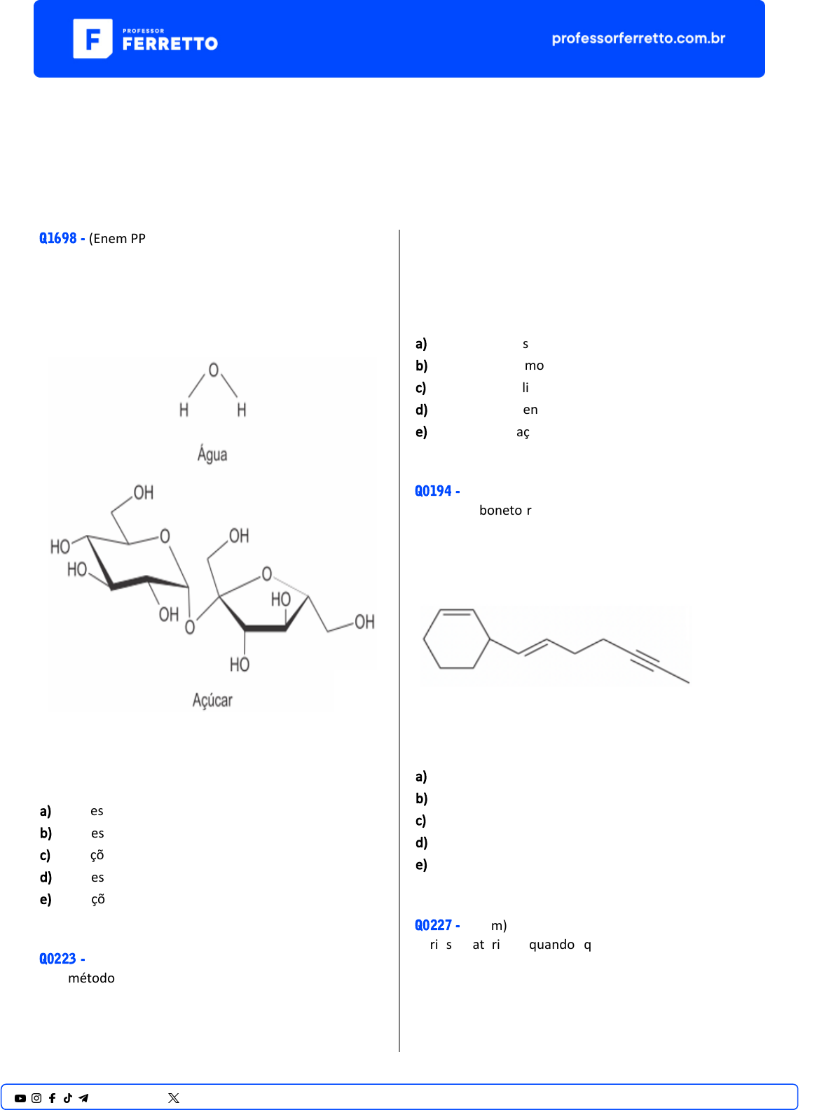 ENEM Ligações Químicas Q1698 - (Enem PPL) Um princípio importante na dissolução de solutos é que semelhante dissolve semelhante. Isso explica, por exemplo, o açúcar se dissolver em grandes quan�dades na água, ao passo que o óleo não se dissolve. A dissolução na água, do soluto apresentado, ocorre predominantemente por meio da formação de a) ligações iônicas. b) ligações covalentes. c) interações íon-dipolo. d) ligações de hidrogênio. e) interações hidrofóbicas. Q0223 - (Enem) Um método para determinação do teor de etanol na gasolina consiste em misturar volumes conhecidos de água e de gasolina em um frasco específico. Após agitar o frasco e aguardar um período de tempo, medem-se os volumes das duas fases imiscíveis que são ob�das: uma orgânica e outra aquosa. O etanol, antes miscível com a gasolina, encontra-se agora miscível com a água. Para explicar o comportamento do etanol antes e depois da adição de água, é necessário conhecer a) a densidade dos líquidos. b) o tamanho das moléculas. c) o ponto de ebulição dos líquidos. d) os átomos presentes nas moléculas. e) o �po de interação entre as moléculas. Q0194 - (Enem) O hidrocarboneto representado pela estrutura química a seguir pode ser isolado a par�r das folhas ou das flores de determinadas plantas. Além disso, sua função é relacionada, entre outros fatores, a seu perfil de insaturações. Considerando esse perfil específico, quantas ligações pi a molécula contém? a) 1 b) 2 c) 4 d) 6 e) 7 Q0227 - (Enem) Vários materiais, quando queimados, podem levar à formação de dioxinas, um composto do grupo dos organoclorados. Mesmo quando a queima ocorre em incineradores, há liberação de substâncias derivadas da dioxina no meio ambiente. Tais compostos são produzidos em baixas concentrações, como resíduos da 1@professorferretto @prof_ferretto queima de matéria orgânica em presença de produtos que contenham cloro. Como consequência de seu amplo espalhamento no meio ambiente, bem como de suas propriedades estruturais, as dioxinas sofrem magnificação trófica na cadeia alimentar. Mais de 90% da exposição humana às dioxinas é atribuída aos alimentos contaminados ingeridos. A estrutura �pica de uma dioxina está apresentada a seguir: A molécula do 2,3,7,8 - TCDD é popularmente conhecida pelo nome ‘dioxina’, sendo a mais tóxica dos 75 isômeros de compostos clorados de dibenzo-p-dioxina existentes. FADINI, P. S.; FADINI, A. A. B. Lixo: desafios e compromissos. Cadernos Temá�cos de Química Nova na Escola, São Paulo, n. 1, maio 2001 (adaptado). Com base no texto e na estrutura apresentada, as propriedades químicas das dioxinas que permitem sua bioacumulação nos organismos estão relacionadas ao seu caráter a) básico, pois a eliminação de materiais alcalinos é mais lenta do que a dos ácidos. b) ácido, pois a eliminação de materiais ácidos é mais lenta do que a dos alcalinos. c) redutor, pois a eliminação de materiais redutores é mais lenta do que a dos oxidantes. d) lipo�lico, pois a eliminação de materiais lipossolúveis é mais lenta do que a dos hidrossolúveis. e) hidro�lico, pois a eliminação de materiais hidrossolúveis é mais lenta do que a dos lipossolúveis. Q0225 - (Enem) A pele humana, quando está bem hidratada, adquire boa elas�cidade e aspecto macio e suave. Em contrapar�da, quando está ressecada, perde sua elas�cidade e se apresenta opaca e áspera. Para evitar o ressecamento da pele é necessário, sempre que possível, u�lizar hidratantes umectantes, feitos geralmente à base de glicerina e polie�lenoglicol: A retenção de água na super�cie da pele promovida pelos hidratantes é consequência da interação dos grupos hidroxila dos agentes umectantes com a umidade con�da no ambiente por meio de a) ligações iônicas. b) forças de London. c) ligações covalentes. d) forças dipolo-dipolo. e) ligações de hidrogênio. Q1582 - (Enem PPL) Bebidas alcoólicas, algumas soluções desinfetantes ou até álcool combus�vel são exemplos de misturas cons�tuídas por etanol (CH3CH2OH) e água. A “afinidade” entre esses líquidos é suficiente para possibilitar que a mistura formada por 500 mL de água e 500 mL de etanol origine uma solução de 970 mL, em um processo que envolve liberação de pequena quan�dade de energia. De certa forma, isso cons�tui um problema para os fabricantes, uma vez que, para obterem um litro dessa mistura, necessitariam misturar mais do que 500 mL de cada um dos líquidos. Do ponto de vista da química, a que se deve essa variação de volume? a) À redução do volume das moléculas. b) Ao abaixamento da massa molecular. c) À formação de ligações covalentes mais fortes. d) À diminuição do grau de agitação das moléculas. e) Ao estabelecimento de interações intermoleculares mais intensas. Q1441 - (Enem) Por terem camada de valência completa, alta energia de ionização e afinidade eletrônica pra�camente nula, considerou-se por muito tempo que os gases nobres não formariam compostos químicos. Porém, em 1962, foi realizada com sucesso a reação entre o xenônio (camada de valência 5s25p6) e o hexafluoreto de pla�na e, desde então, mais compostos novos de gases nobres vêm sendo 2@professorferretto @prof_ferretto sinte�zados. Tais compostos demonstram que não se pode aceitar acri�camente a regra do octeto, na qual se considera que, numa ligação química, os átomos tendem a adquirir estabilidade assumindo a configuração eletrônica de gás nobre. Dentre os compostos conhecidos, um dos mais estáveis é o difluoreto de xenônio, no qual dois átomos do halogênio flúor (camada de valência 2s22p5) se ligam covalentemente ao átomo de gás nobre para ficarem com oito elétrons de valência. Ao se escrever a fórmula de Lewis do composto de xenônio citado, quantos elétrons na camada de valência haverá no átomo do gás no