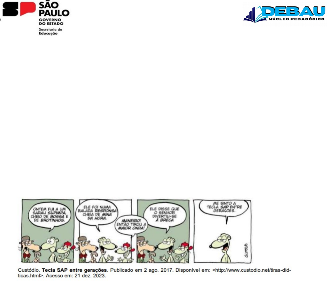 SIMULADO SARESP 6º ANO ENSINO FUNDAMENTAL Língua Portuguesa 1- Leia a tirinha e responda: O humor da tirinha consiste: A) na reação do rato mais jovem ao zombar do rato mais velho. B) na falha de comunicação gerada pelo uso da linguagem formal. C) no uso de gírias que impediu a comunicação entre as três personagens. D) no uso de gírias de diferentes gerações ‘traduzidas’ por um interlocutor 2- Leia o texto para responder à questão. O Brasil pode ter até 50% das crianças e adolescentes entre 5 e 19 anos com obesidade ou sobrepeso em 2035, aponta o Atlas Mundial da Obesidade 2024, lançado nesta sexta-feira, pela Federação Mundial de Obesidade. O documento traz dados atuais sobre a doença no mundo e as projeções para os próximos anos. Disponível em: . Acesso em: 08 abr. 2024. Fragmento. O recurso argumentativo empregado no texto é: A) Comparação: ao mostrar projeções sobre a doença nos próximos anos. B) Exemplificação: apresentando exemplos de crianças e adolescentes. C) Dados estatísticos: extraídos de um documento sobre obesidade infantil. D) Causa e consequência: a obesidade infantil é incentivada pelas pesquisas. 3- Leia o texto para responder à questão. Trem de Ferro GOVERNO DO ESTADO DE SÃO PAULO SECRETARIA DE ESTADO DA EDUCAÇÃO DIRETORIA DE ENSINO DA REGIÃO DE BAURU Rua Campos Sales 9-45 – Vila Falcão Fone: (14) 3108-0000 – debau@educacao.sp.gov.br Manuel Bandeira Café com pão Café com pão Café com pão Virge Maria que foi isto maquinista? Agora sim Café com pão Agora sim Voa, fumaça Corre, cerca Ai seu foguista Bota fogo Na fornalha Que eu preciso Muita força Muita força Muita força [...] Disponível em: . Acesso em: 03 jul. 2024. Fragmento. As figuras de linguagem são utilizadas para deixar um texto mais expressivo. Podemos afirmar que no poema acima há uma: A) metáfora, devido à comparação entre o trem e o café com pão. B) onomatopeia, devido ao efeito sonoro do trem no poema. C) antítese, devido à oposição e ideias entre foge e passa. D) personificação, devido ao foguista que bota fogo na fornalha. 4- Leia o texto para responder à questão. Tecnoestresse – como evitar o lado negativo do excesso de conectividade 12/01/2021 | Por Bárbara Nogueira* O uso da tecnologia tem se apresentado como imprescindível nos últimos meses, após o avanço da pandemia do novo coronavírus e a necessidade de isolamento social. Somente por meio dela, foi possível viabilizar o home office para milhares de profissionais em todo o mundo, além do contato com pessoas queridas. Por outro lado, essa nova realidade provocou um crescimento exponencial da conectividade e do uso de mídias eletrônicas. Situação que, se não for bem gerenciada pelos próprios indivíduos e pelas empresas, pode comprometer – e muito – a produtividade no trabalho e provocar transtornos físicos e emocionais. [...] Disponível em: . Acesso em: 05 ago. 2024. Vocabulário: imprescindível: indispensável, fundamental, essencial exponencial: que tem grande importância; que é considerado acima do comum home office: em tradução literal para o nosso idioma, significa “escritório em casa”, ou seja, a pessoa faz da própria casa seu local de trabalho. Após a leitura atenta do texto, identifique qual a informação principal do parágrafo lido. A) O avanço progressivo da pandemia do coronavírus. B) O uso da tecnologia no dia a dia é muito importante. C) O mal uso das mídias sociais compromete a saúde. D) O isolamento social causa problemas emocionais. 5- Leia o texto para responder à questão. MARVIM Meu pai não tinha educação Ainda me lembro, era um grande coração Ganhava a vida com muito suor Mas mesmo assim não podia ser pior Pouco dinheiro pra poder pagar Todas as contas e despesas do lar (Sérgio Brito e Nando Reis. Marvin. In: Titãs Acústico. São Paulo: WEA Music Brasil. Fragmento A expressão “com muito suor” é utilizada em sentido conotativo, ou seja, tem outro significado no texto. A expressão que pode substitui-la sem prejuízo de sentido é: A) trabalhando muito. B) na sauna. C) no calor. D) fazendo exercícios 6- Leia o texto para responder à questão. SEGREDO Andorinha no fio escutou um segredo. Foi à torre da igreja, cochichou com o sino. E o sino bem alto: delém-dem delém-dem delém-dem dem-dem! Toda a cidade ficou sabendo. (Disponível em: www.antoniomiranda.com.br/poesia_infantil/henriqueta_lisboa.html. Acesso em: 02.04.2017. Adaptado) (SARESP Adaptado) Considerando que a personificação atribui características humanas a objetos ou animais, é correto afirmar que, no poema Segredo, a personificação ocorre em: A) “Andorinha no fio”. B) “Foi à torre da igreja”. C) “cochichou com o sino”. D) “Toda a cidade”. 7- Leia o texto para responder à questão. A exploração do trabalho infantil está à vista de todos nós, nas ruas das cidades, no comércio e serviços, principalmente os informais, nas áreas rurais, em especial na agricultura. Há pouco mais de um ano, a crise deflagrada pela pandemia da COVID-19 atingiu o mundo do trabalho e causou efeitos devastadores sobre o emprego e a renda das famílias globalmente. O golpe impactou com mais força as pessoas que já se encontravam em situação de vulnerabilidade socioeconômica. O aumento da pobreza aliada ao fechamento de escolas potencialmente agravou a situação do trabalho infantil. Vinícius Pinheiro. Disponível em: . Acesso em: 06 ago. 2024. Vocabulário: deflagrar: provocar ou aparecer de repente. devastador: destruir de forma arrasadora. vulnerabilidade: frágil, delicado e fraco; implica situação de risco. Sobre qual tema o autor do texto apresenta sua opinião? A) A crise econômica causada pela pandemia de COVID-19 e seus efeitos na educação. B) A importância do trabalho informal para combater a pobreza nas grandes cidades. C) O aumento da exploração do trabalho infantil e seus impactos durante a pandemia. D