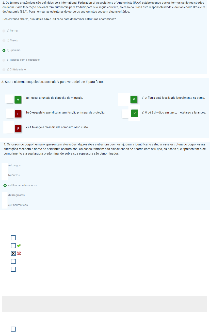 Sistema esquelético As descrições anatômicas exigem um referencial para as posições e partes corporais. Assim sendo, foram criados planos imaginários que atravessam o corpo na posição anatômica. Assinale a alternativa que apresenta o plano vertical que atravessa o corpo longitudinalmente e de frente para trás, dividindo-o em dois lados de tamanhos diferentes. coronal sagital frontal horizontal mediano Respondido em 17/04/2021 21:01:31 2 Questão Numa visão superior da calota craniana é possível observar ossos e suturas. Conhecendo a anatomia da calota, marque a opção que indica corretamente os ossos e as suturas: temporais, parietais e occipital; suturas lambdóide, sagital e escamosa frontal, parietais e occipital; suturas coronal, sagital e lambdóide. esfenóide, frontal e occipital; suturas metópica, sagital e escamosa. parietais, temporais e nasais; suturas coronal, escamosa e lambdóide. frontal, temporais e occipital; suturas coronal, escamosa e sagital. Respondido em 18/04/2021 11:17:40 3 Questão A polidactilia (presença do 6º ou mais dedos nas mãos ou pés) é resultado da expressão de alelo dominante, pouco registrada na população brasileira, que confere alternações morfológica da mão mas sem interferir drasticamente na atividade do seu portador. A partir dessa informação, e com base nas discussões realizadas em sala assinale a ÚNICA alternativa que classifica corretamente a polidactilia dentro do contexto da Anatomia Sistêmica. Má-formação congênita Efeito de translações do RNA, provocadas por fumo prolongado Efeito teratogênico de bebidas alcoólicas ingeridas pela mãe, no período gestacional Anomalia Monstruosidade Respondido em 18/04/2021 11:20:40 4 Questão O tecido ósseo compõe aproximadamente 18% do peso do corpo humano. O sistema esquelético desempenha várias funções básicas à manutenção da homeostase corporal, que estão presentes na sua totalidade, em qual afirmativa? Hematopoese e Proteção. Suporte, proteção, armazenamento de gordura e minerais. Suporte, proteção, movimento, armazenamento de minerais e gordura, hematopoese. Proteção e movimento. Suporte e Proteção. Respondido em 18/04/2021 11:23:40 5 Questão A definição de membro inferior é: Um conjunto formado pelos seguintes segmentos: osso do quadril, coxa, perna e pé. Um conjunto formado pelos seguintes segmentos: cíngulo do membro inferior, coxa, joelho, perna e pé. Um conjunto formado pelos seguintes segmentos: cíngulo do membro inferior, coxa, perna, e pé. Um conjunto formado pelos seguintes segmentos: osso do quadril, coxa, joelho, perna, tornozelo e pé. Um conjunto formado pelos seguintes segmentos: osso do quadril, fêmur, tíbia, fíbula e ossos do pé. Respondido em 18/04/2021 11:27:51 6 Questão Tendo em vista que a anatomia topográfica do corpo humano (osso com acesso mais superficial) e a presença de medula óssea vermelha no adulto, o melhor acesso para a obtenção de medula óssea vermelha no adulto seria através do osso Da escápula Do quadril Do rádio Da ulna Do úmero Respondido em 18/04/2021 11:29:40 Explicação: os ossos do quadril são os com acesso mais facil para fazer a punção de medula óssea vermelha 7 Questão SEGPLAN GO - FUNIVERSA - 2015 Acerca do esqueleto axial, do esqueleto apendicular e das relações entre eles, assinale a alternativa correta: A escápula e a clavícula são ossos presentes no apêndice inferior. Os ossos do crânio estão divididos entre as duas porções esqueléticas. O esqueleto axial está dividido em membros superiores e membros inferiores. O sacro e o externo estão localizados no esqueleto apendicular. As cinturas escapular e pélvica unem o esqueleto apendicular ao axial. Respondido em 18/04/2021 11:30:15 8 Questão As descrições anatômicas exigem um referencial para as posições e partes corporais. Assim sendo, foram criados planos imaginários que atravessam o corpo na posição anatômica. Assinale a alternativa que apresenta o plano vertical que atravessa o corpo longitudinalmente e de frente para trás, dividindo-o em dois lados de tamanhos diferentes. frontal sagital mediano coronal horizontal 2 aula – sistema articular Articulações ou junturas são as uniões funcionais entre os diferentes ossos do esqueleto. São divididas nos seguintes grupos, de acordo com sua estrutura e mobilidade. Assinale a resposta correta: Articulações Fibrosas; Articulações Cartilagíneas; Articulações Sinoviais N.R.A Articulações suturas; Articulações Cartilagíneas; Articulações pluviais Articulações Fibrosas; Articulações Cartilagíneas; Articulações multiaxiais Articulações Fibrosas; Articulações dobráveis; Articulações Sinoviais Respondido em 18/04/2021 12:13:22 2 Questão Representa a união entre as suturas sagital e a sutura coronal Bregma Vértex Ptério Escamosa Lâmbda Respondido em 18/04/2021 12:15:10 3 Questão Classifique as articulações de acordo com o tecido que conecta, e o os movimentos realizados pelas articulações. fibrosa, trocoide e ulnar. Esférica, cartilaginosa e fibrosa. Articulações fibrosas, cartilagineas e sinoviais. Sinovial, triaxial e fibrosa Carpais, fibrosa e sinovial Respondido em 18/04/2021 12:17:16 Explicação: As articulações fibrosas são baseadas no tecido fibroso que conecta os ossos, as articulações cartilagíneas são baseadas no tecido cartilagíneo que conecta os ossos, já a sinovias são baseadas nos movimentos que as mesmas fazem 4 Questão Com relação à Artrologia e sua área de estudo, marque a opção correta: A palavra artrologia tem origem no latim. Somente os ossos são unidos pelas articulações corporais. As articulações unem duas ou mais estruturas corporais. Articulações fibrosas possuem um líquido denominado sinovia. Todas as articulações permitem movimentação intensa. Respondido em 18/04/2021 12:19:26 Explicação: Artrologia tem origem grega; As articulações unem ossos e tamb