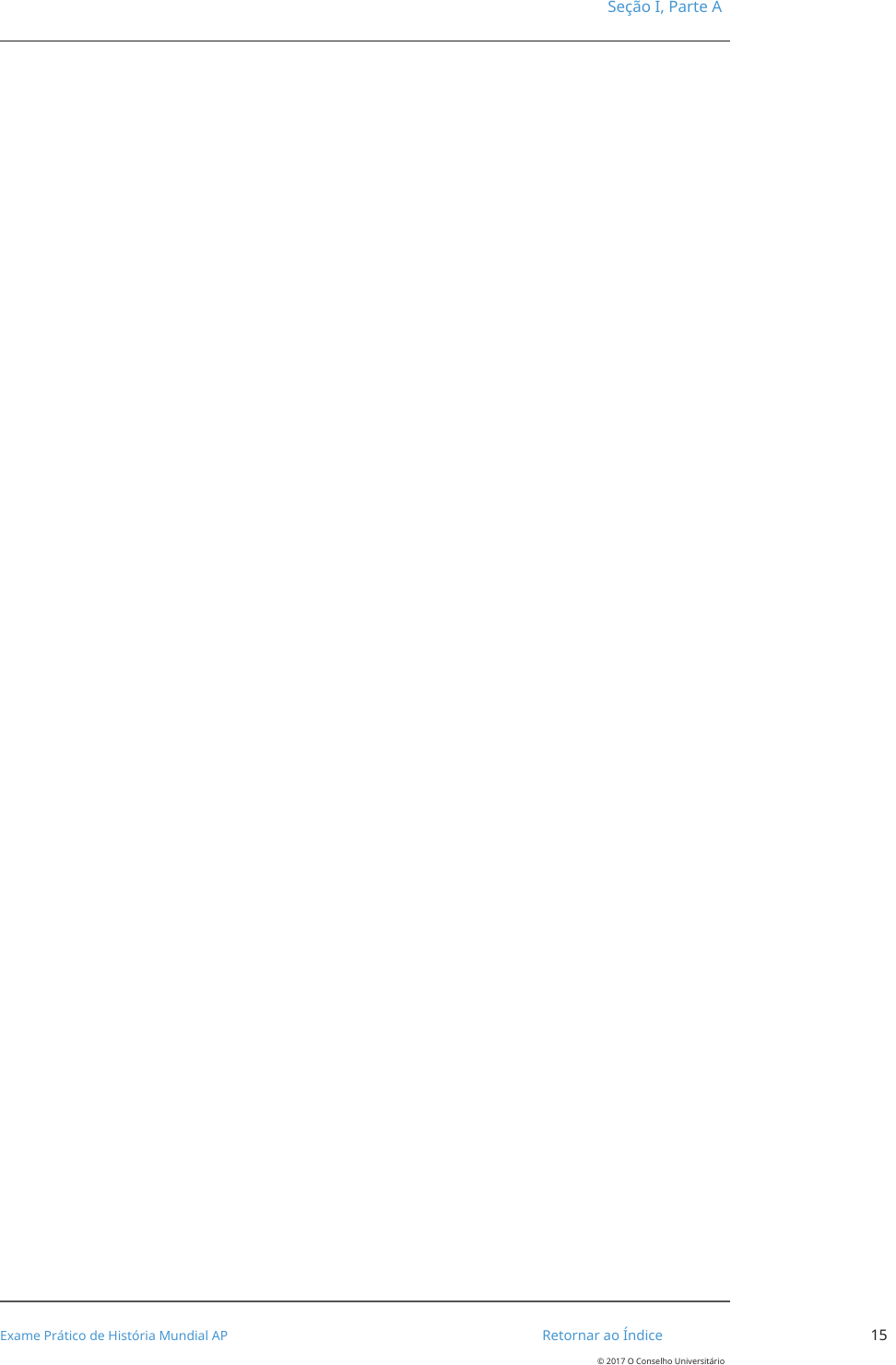 Seção I, Parte A 19. As rotas e os horários específicos das viagens retratados nos mapas refletem melhor quais das seguintes características dos comerciantes de Omã? (A) As suas observâncias rituais islâmicas, que dificultavam as viagens durante o período de jejum do Ramadão (B) Seu conhecimento avançado das correntes do Oceano Índico e dos padrões de ventos das monções (C) A sua necessidade de evitar as rotas percorridas pelos navios mercantes portugueses, mais rápidos e melhor armados (D) O seu controlo sobre as fontes de cereais necessárias às cidades chinesas e da África Oriental 20. Com base nos mapas e no seu conhecimento da história mundial, qual das seguintes opções descreve melhor o efeito da disseminação do islamismo no comércio do Oceano Índico? (A) Levou à expansão e intensificação do comércio ao longo de rotas comerciais já existentes. (B) Levou ao desaparecimento de redes comerciais previamente estabelecidas. (C) Levou à expansão do comércio de caravanas terrestres, mas também ao declínio do comércio marítimo. (D) Levou à primeira criação de laços comerciais entre regiões do mundo anteriormente isoladas. 21. Qual dos seguintes fatores contribuiu mais para a capacidade dos comerciantes de Omã de realizar as viagens descritas nos mapas? (A) O forte apoio às viagens pelo Califado (B) Inovações marítimas e de navegação, como o astrolábio e a vela latina (C) A difusão do árabe como língua comercial nas bacias do Mar Vermelho e do Oceano Índico ocidental (D) Inovações na agricultura, que permitiram que a população de Omã aumentasse rapidamente 22. Qual das seguintes opções poderia ser melhor inferida sobre as cidades comerciais do sul e leste da Ásia mostradas nos mapas? (A) Eles estavam sob o controle político direto de Omã. (B) Eles tinham uma população majoritariamente árabe. (C) Eles tinham comunidades de comerciantes muçulmanos da diáspora. (D) Eles eram principalmente fontes de trabalho escravo para os omanenses. Exame Prático de História Mundial AP Retornar ao Índice 15 © 2017 O Conselho Universitário Rectangle Rectangle Seção I, Parte A As questões 23 a 26 referem-se aos dois diagramas abaixo. FLUXOS MUNDIAIS DE PRATA, 1600–1650 EC, TONELADAS MÉTRICAS POR ANO (média) 94 Toneladas Europa Ocidental Importação: 158 toneladas Reexportação: 110 toneladas Resto da Europa e a importação do Oriente Médio: 94 toneladas Japão Exportação: 59 toneladas Uso: Desconhecido 268 toneladas 59 toneladas Américas Exportação: 302 toneladas Uso: 66 toneladas Importação do Leste e Sul da Ásia: 109 toneladasRota da África Austral 16 toneladas A Rota do Pacífico 34 toneladas FLUXOS MUNDIAIS DE PRATA, 1725–1750 EC, TONELADAS MÉTRICAS POR ANO (média) 110 Toneladas Europa Ocidental Importação: 230 toneladas Reexportação: 270 toneladas Resto da Europa e o Oriente Médio Importação: 110 toneladas Japão Exportação: 0 Toneladas Uso: Desconhecido 500 toneladas 0 toneladas Américas Exportação: 533 toneladas Utilização: 117 toneladas Importação do Leste e Sul da Ásia: 193 toneladasRota da África Austral 160 toneladas A Rota do Pacífico 33 toneladas Fonte: Ronald Findlay e Kevin H. O'Rourke,Poder e abundância: comércio, guerra e a economia mundial no segundo milênio, Princeton University Press, 2007, pág. 218. Exame Prático de História Mundial AP Retornar ao Índice 16 © 2017 O Conselho Universitário Rectangle Rectangle Seção I, Parte A 23. Qual das seguintes condições econômicas foi mais importante na criação da rede de comércio global ilustrada pelos dois diagramas? (A) Demanda americana por mão de obra e oferta africana de escravos (B) Oferta japonesa de prata e demanda do Oriente Médio por especiarias (C) A procura da Europa Ocidental por matérias-primas industriais e a oferta de culturas comerciais dos Estados Unidos e do Sul da Ásia (D) A procura chinesa e indiana por metais preciosos e a procura europeia por têxteis e bens de luxo asiáticos 24. Noséculo XVIII , qual das seguintes opções contribuiu mais diretamente para a mudança no volume de comércio de prata na rota da África Austral? (A) O desenvolvimento de novos tipos de navios, como a caravela e a nau (B) As atividades expandidas das sociedades anônimas e das sociedades por ações (C) A conversão dos governantes dos estados da África Ocidental ao cristianismo (D) A descoberta de ouro e diamantes na África Austral 25. Qual das seguintes opções foi uma questão importante?direto efeito na Europa dos processos refletidos nos diagramas? (A) Os movimentos de independência nas colônias espanholas e portuguesas (B) A industrialização de partes da Inglaterra, França e Alemanha (C) A intensificação das rivalidades entre os Estados pelo controlo das rotas comerciais, levando a guerras coloniais (D) Conflitos religiosos entre católicos e protestantes 26. Qual das seguintes opções foi uma continuidade importante subjacente às interações comerciais ilustradas pelos dois diagramas? (A) A resiliência da economia chinesa, apesar da mudança dinástica de Ming para Qing (B) A supremacia industrial e comercial da Grã-Bretanha na Europa Ocidental (C) A aceitação generalizada dos princípios do comércio livre pela maioria dos governos europeus e asiáticos (D) A expansão contínua dos impérios muçulmanos, como o Otomano e o Safávida Exame Prático de História Mundial AP Retornar ao Índice 17 © 2017 O Conselho Universitário Rectangle Rectangle Seção I, Parte A As questões 27–29 referem-se à imagem abaixo. © BnF, Dist. RMN-Grand Palais / Art Resource, NY A imagem acima, da Etiópia do século XVII, mostra a Virgem Maria e o Menino Jesus com o comerciante que encomendou a pintura deitado abaixo. 27. A pintura é melhor vista como evidência de qual dos seguintes? (A) O impacto duradouro da propagação do cristianismo através da Afro-Eurásia durante o período do final do Impé