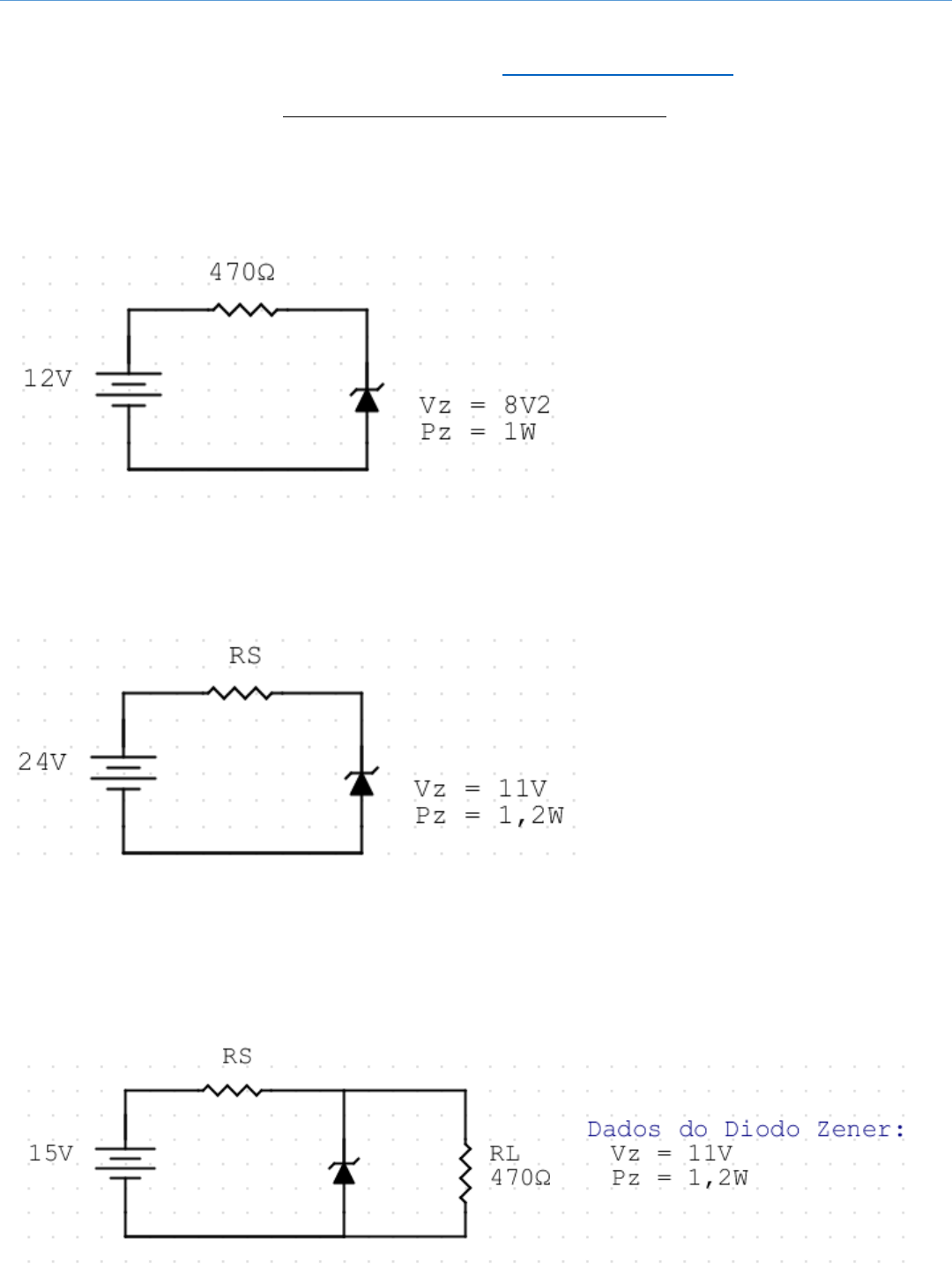 <p>Lista de Exercícios de Eletrônica Analógica</p><p>Lista VII de Eletrônica Analógica I – Regulador de Tensão com Diodo Zener</p><p>Prof. Gabriel Vinicios Silva Maganha (http://www.gvensino.com.br)</p><p>Lista de Exercícios 7 de Eletrônica Analógica</p><p>1. O circuito regulador abaixo com Zener apresenta um problema. Qual é esse problema? Proponha</p><p>uma solução adequada.</p><p>2. Determine o valor máximo e mínimo da resistência de segurança para que o diodo zener funcione</p><p>corretamente:</p><p>3. Determine RS mínimo e máximo para os reguladores de tensão abaixo:</p><p>a)</p><p>http://www.gvensino.com.br/</p><p>Lista de Exercícios de Eletrônica Analógica</p><p>b)</p><p>4. Qual será a tensão na carga (VRL) dos circuitos abaixo?</p><p>a)</p><p>b)</p><p>c)</p><p>Lista de Exercícios de Eletrônica Analógica</p><p>5. Desenhe a forma de onda na Carga para os circuitos abaixo, conhecidos como circuitos limitadores:</p><p>6. O rádio de um carro precisa de uma tensão de 9V para funcionar e consome uma corrente máxima de</p><p>320mA. Ora bolas, um carro possuí uma bateria de +12V e se você alimentar 12V direto no rádio, ele irá</p><p>queimar. Por isso, precisaremos usar um regulador de tensão com Diodo Zener.</p><p>Você tem um diodo zener de 9V1, o modelo 1N960, de 130mW de Potência Máxima. Projete o circuito para</p><p>abastecer este rádio corretamente.</p><p>Parte II</p><p>7. Analisando o gráfico do Diodo Zener abaixo, qual é a sua Tensão Zener (Vz) e a sua Corrente Mínima</p><p>(aproximada)?</p><p>Lista de Exercícios de Eletrônica Analógica</p><p>8. Se quisermos projetar um circuito para obter uma tensão de aproximadamente +7V, usando diodos comuns</p><p>ao invés de diodos Zener, como ficaria esse circuito?</p><p>9. Sobre o Diodo Zener, qual a alternativa correta?</p><p>( A ) – É uma bateria</p><p>( B ) – Age como uma bateria na região de ruptura</p><p>( C ) - É um dispositivo de corrente constante</p><p>( D ) – É diretamente polarizado</p><p>10. A tensão na Carga é aproximadamente constante quando um diodo Zener está:</p><p>( A ) – Diretamente Polarizado</p><p>( B ) – Reversamente Polarizado</p><p>( C ) – Operando na região de ruptura</p><p>( D ) – Não Polarizado</p><p>11. Quando a tensão da entrada do regulador Zener aumenta, qual das correntes permanece aproximadamente</p><p>constante?</p><p>( A ) – A corrente no Resistor de Segurança</p><p>( B ) – A corrente no Zener</p><p>( C ) – A corrente na Carga</p><p>( D ) – A corrente total</p><p>12. Se um diodo Zener num regulador Zener for conectado com polaridade trocada, a tensão na Carga ficará</p><p>próxima de:</p><p>( A ) – 0,7V</p><p>( B ) – 10V</p><p>( C ) – 3,3V</p><p>( D ) – Infinito</p><p>Lista de Exercícios de Eletrônica Analógica</p><p>13. Analise o circuito da fonte linear abaixo, com Regulador Zener:</p><p>Dados do Diodo Zener: Vz = 11V1, Pz = 500mW</p><p>13.1 – Qual é a tensão de pico no Capacitor (Vcp)?</p><p>13.2 – Sabendo-se que desejamos um Ripple de 2V, qual é a tensão média filtrada no Capacitor?</p><p>13.3 – Calcule RS máximo, mínimo e ideal</p><p>13.4 – Qual é a corrente máxima sobre o Resistor RS?</p><p>13.5 – Qual é o valor do Capacitor de filtro?</p><p>14. Para a fonte linear estabilizada com Zener abaixo, qual é o valor de RS ideal e do Ripple no Capacitor?</p><p>Dados do Diodo Zener: Vz = 9V1, Pz = 1W</p><p>Lista de Exercícios de Eletrônica Analógica</p><p>Respostas:</p><p>1) O problema é que é que a corrente no Zener é menor do que a mínima, de maneira que o Zener não</p><p>conseguirá estabilizar a tensão em 8,2V. A solução é diminuir o valor do Resistor de Segurança (RS) para que</p><p>o Zener possa receber uma corrente mínima necessária para o seu funcionamento. O Valor máximo de RS</p><p>será de 311,6 Ω.</p><p>2) RSm = , Ω</p><p>RSM = , Ω</p><p>3) A- IzM = 109,09mA</p><p>IZm = 10,9 mA</p><p>IRL = 23,4mA</p><p>RSm = , Ω</p><p>RSM = , Ω</p><p>RSideal = , Ω</p><p>B – IzM = 93,75mA</p><p>IZm = 9,38mA</p><p>IRL = 571,4 µA</p><p>RSm = , Ω</p><p>RSM = , Ω</p><p>RSideal = Ω</p><p>4) a) VRL = 16,7V</p><p>b) VRL = 7,5V</p><p>c) VRL = 4,9V (considerando Si)</p><p>Lista de Exercícios de Eletrônica Analógica</p><p>5) As telas abaixo foram visualizadas em um osciloscópio ajustado na Escala Vertical para 5V/div e</p><p>na Escala Horizontal para 10ms/div:</p><p>Vendo o sinal de entrada (em azul) ao mesmo tempo que o sinal na Carga:</p><p>0,7V reversos</p><p>5,1V</p><p>Lista de Exercícios de Eletrônica Analógica</p><p>6)</p><p>IRL = 320mA</p><p>VRL = Vz = 9,1V</p><p>Logo, RL = , / , = , Ω</p><p>IzM = 14,28mA</p><p>Izm = 1,43mA</p><p>RSm = , Ω</p><p>RSM = , Ω</p><p>RSideal = , Ω</p><p>7) Vz = 5V e IZm = 4mA (aprox.)</p><p>8) Usando diodos de Silício (Si), ficaria um circuito assim:</p><p>Ou seja, usaríamos 10 diodos de Si, pois 10 x 0,7V = 7V. E ligaríamos a carga em paralelo com todos esses</p><p>diodos.</p><p>9) B</p><p>10) C</p><p>11) C</p><p>12) A</p><p>13)</p><p>13.1) V2 = 127/8 = 15,88V</p><p>V2p = 15,88 x √ = 22,45V</p><p>Vcp = 22,45 – 1,4V = 21,05V</p><p>13.2) Vond = 2V</p><p>VCmed = 21,05 – (2 /2) = 20,05V</p><p>RS</p><p>Lista de Exercícios de Eletrônica Analógica</p><p>13.3) IzM = 0,5 / 11,1 = 45,05mA</p><p>Izm = 4,5mA</p><p>IRL = 11,1 / 300 = 37mA</p><p>RSm =</p><p>, − ,, �+ �=8,95 / 82,05mA = 109,08 Ω</p><p>RSM =</p><p>, − ,, �+ �= 8,95 / 41,05mA = 218,03 Ω</p><p>RsIdeal = (109,08 + 218,03) / 2 = 163,55 Ω (aproximado)</p><p>13.4) IRSM = 45,05mA + 37mA = 82,05mA</p><p>13.5) C =</p><p>, ���� � � = , µ�</p><p>14) Para calcularmos o valor do Ripple, podemos usar a fórmula que usa a Corrente ou a que usa a Tensão Média e a</p><p>Resistência da Carga. Como nós sabemos os dados do diodo Zener, podemos calcular as correntes na Carga e no</p><p>Zener e, assim, calcular a Corrente que terá de ser drenada pelo Capacitor. A