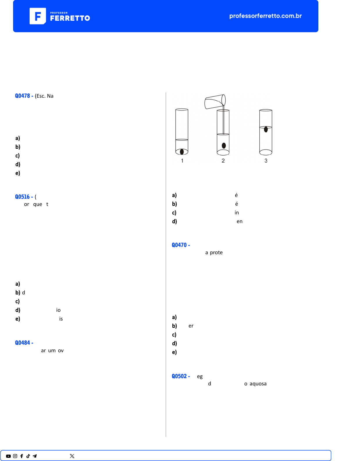 Vestibulares Soluções Q0478 - (Esc. Naval) Qual é a massa (expressa em gramas) de uma amostra com volume de 3 mL de álcool e�lico, e cujo valor de sua densidade, nas condições de temperatura e pressão em que se encontra, é de 0,79 g/mL? a) 0,26 b) 2,37 c) 2,73 d) 3,79 e) 8,78 Q0516 - (Cps) - Por que tomar água no meio da aula prejudica o aprendizado? Resposta: Porque ela diminui a concentração. - Um nêutron entra num bar e pergunta: – Qual o valor da bebida? O garçom responde: – Pra você? É zero! A ideia química, no primeiro exemplo se refere ao conceito de a) diluição. b) dissolução. c) evaporação. d) des�lação fracionada. e) separação de misturas. Q0484 - (Uemg) Ao adicionar um ovo de galinha a um recipiente contendo água, o ovo vai para o fundo. Em seguida, à medida que se coloca salmoura nesse recipiente, observa-se que o ovo flutua na super�cie da solução ob�da. O ovo flutua após a adição de salmoura porque a) a densidade da solução é menor que a do ovo. b) a densidade da solução é maior que a do ovo. c) a densidade do ovo diminui. d) a densidade do ovo aumenta. Q0470 - (Cesgranrio) O colágeno é a proteína mais abundante no corpo humano, fazendo parte da composição de órgãos e tecidos de sustentação. Apesar de não ser comes�vel, seu aquecimento em água produz uma mistura de outras proteínas comes�veis, denominadas gela�nas. Essas proteínas possuem diâmetros médios entre 1,0 nm e 1.000 nm e, quando em solução aquosa, formam sistemas caracterizados como a) soluções verdadeiras. b) dispersantes. c) coagulantes. d) homogêneos. e) coloides. Q0502 - (Ueg) Considere 5 L de uma solução aquosa contendo 146 g de cloreto de sódio que será u�lizada como solução de par�da para outras de mais baixa concentração. Uma quan�dade de 2 mL dessa solução contém uma massa de soluto, em miligramas, de aproximadamente 1@professorferretto @prof_ferretto a) 3 b) 29 c) 58 d) 73 e) 292 Q1523 - (Professor Ferre�o) A cerveja é feita basicamente com quatro ingredientes: água, levedura, lúpulo e malte. Não existe uma data definida para a invenção da cerveja, entretanto, o que se sabe é que ela é considerada uma das bebidas mais an�gas da humanidade. Seus primeiros registros datam de 5.000 a.C. As leveduras são os micro-organismos (ou fungos) responsáveis pela fermentação da cerveja. O lúpulo é uma flor que confere o amargor e o aroma, além de ser o conservante natural da bebida. Já o malte se origina de diversos cereais, como o trigo, a cevada, o milho, o centeio e o arroz. Após um teste em uma cervejaria, foi constatada a presença de 900 g de malte em meia dúzia de garrafas de cerveja com capacidade de 600 mL cada uma delas. Nesse caso, a concentração de malte, em g.L–1, u�lizada nessa cervejaria, é a) 250 b) 350 c) 900 d) 300 e) 600 Q0506 - (Unicamp) Um medicamento se apresenta na forma de comprimidos de 750 mg ou como suspensão oral na concentração de 100 mg/mL. A bula do remédio informa que o comprimido não pode ser par�do, aberto ou mas�gado e que, para crianças abaixo de 12 anos, a dosagem máxima é de 15 mg/kg/dose. Considerando apenas essas informações, conclui-se que uma criança de 11 anos, pesando 40 kg, poderia ingerir com segurança, no máximo, a) 6,0 mL da suspensão oral em uma única dose. b) 7,5 mL da suspensão oral, ou um comprimido em uma única dose. c) um comprimido em uma única dose. d) 4,0 mL da suspensão oral em uma única dose. Q0490 - (Uerj) Um canudo de plás�co e outro de vidro borossilicato possuem mesmo volume e densidades de 0,90 g/cm3 e 2,25 g/cm3, respec�vamente. A razão entre as massas do canudo de plás�co e do canudo de vidro corresponde a: a) 1,2 b) 0,8 c) 0,4 d) 0,2 Q0467 - (Ueg) O gráfico abaixo mostra a curva de solubilidade para diversos sais inorgânicos. A análise do gráfico permite concluir que a quan�dade mínima de água, em gramas, a 10˚C, necessária para dissolver 16 g do sal A é igual a: a) 12 b) 20 c) 36 d) 48 Q0479 - (Ifmg) Derramamentos de líquidos insolúveis e menos densos que a água (densidade = 1,0 g.mL–1) sobre rios, lagos e mares são consideradas perturbações ambientais graves. Esses líquidos espalham-se sobre a super�cie da água, formando uma grande película prejudicial ao meio ambiente. O quadro a seguir apresenta alguns materiais, no estado líquido a 25˚C, acompanhados de suas propriedades �sicas. Material Solubilidade em água Densidade (gmL–1) gasolina insolúvel 0,75 álcool solúvel 0,80 tetracloreto de carbono insolúvel 1,59 ácido sulfúrico solúvel 1,84 2@professorferretto @prof_ferretto Entre os materiais relacionados, aquele que provoca a perturbação ambiental mencionada é a(o) a) álcool. b) gasolina. c) ácido sulfúrico. d) tetracloreto de carbono. Q0501 - (Ufpa) Devido à toxicidade do íon lí�o, a concentração máxima desse íon no sangue deve ser de 1,0 mmol L–1. Considerando que um adulto tenha 5 litros de sangue, a massa total (em (mg) de íons lí�o no sangue desse adulto deve ser de aproximadamente Dado: Massa molar Li (g mol–1) = 6,94. a) 6,9. b) 13,9. c) 20,8. d) 27,8. e) 34,7. Q0474 - (Ucs) Os refrigerantes possuem dióxido de carbono dissolvido em água, de acordo com a equação química e a curva de solubilidade representadas abaixo. Equação química: CO2 (g) + H2O (l) ⇄ H+ (aq) + HCO3 – (aq) No processo de fabricação dos refrigerantes, a) o aumento da temperatura da água facilita a dissolução do CO2 (g) na bebida. b) a diminuição da temperatura da água facilita a dissolução do CO2 (g) na bebida. c) a diminuição da concentração de CO2 (g) facilita sua dissolução na bebida. d) a dissolução do CO2 (g) na bebida não é afetada pela temperatura da água. e) o ideal seria u�lizar a temperatura da água em 25 ˚C, pois a solubilidade do CO2 (g) é máxima. Q0515 - (Espcex) Em uma aula prá�ca de química, o professor for
