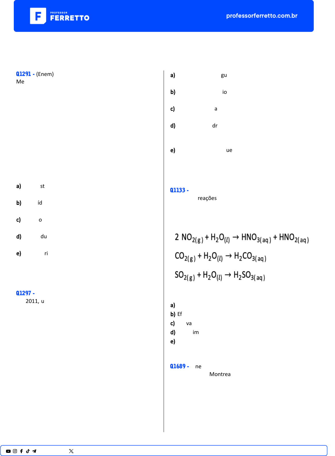 Química Ambiental Q1291 - (Enem) Megaespectáculos com queima de grande quan�dade de fogos de ar�ficio em festas de final de ano são muito comuns no Brasil. Após a queima, grande quan�dade de material par�culado permanece suspensa no ar. Entre os resíduos, encontram-se compostos de sódio, potássio, bário, cálcio, chumbo, an�mônio, cromo, além de percloratos e gases, como os dióxidos de nitrogênio e enxofre. BRUNNING, A. The Chemistry of Firework Pollu�on. Disponível em: www.compoundchem.com. Acesso em: 1 dez. 2017 (adaptado). Esses espetáculos promovem riscos ambientais, porque a) as substâncias resultantes da queima de fogos de ar��cio são inflamáveis. b) os resíduos produzidos na queima de fogos de ar��cio ainda são explosivos. c) o sódio e o potássio são os principais responsáveis pela toxicidade do produto da queima. d) os produtos da queima contêm metais pesados e gases tóxicos que resultam em poluição atmosférica. e) o material par�culado gerado se deposita na super�cie das folhas das plantas impedindo os processos de respiração celular. Q1297 - (Enem) Em 2011, uma falha no processo de perfuração realizado por uma empresa petrolífera ocasionou derramamento de petróleo na bacia hidrográfica de Campos, no Rio de Janeiro. Os impactos decorrentes desse derramamento ocorrem porque os componentes do petróleo a) reagem com a água do mar e sofrem degradação, gerando compostos com elevada toxicidade. b) acidificam o meio, promovendo o desgaste das conchas calcárias de moluscos e a morte de corais. c) dissolvem-se na água, causando a mortandade dos seres marinhos por ingestão da água contaminada. d) têm caráter hidrofóbico e baixa densidade, impedindo as trocas gasosas entre o meio aquá�co e a atmosfera. e) têm cadeia pequena e elevada vola�lidade, contaminando a atmosfera local e regional em função dos ventos nas orlas marí�mas. Q1133 - (U�f) Analise as reações químicas de alguns óxidos presentes na atmosfera e marque a alterna�va que descreve a qual processo de poluição ambiental elas estão relacionadas. a) Camada de ozônio. b) Efeito estufa. c) Chuva ácida. d) Aquecimento global. e) Inversão térmica. Q1689 - (Enem PPL) O Protocolo de Montreal é um tratado internacional que diz respeito à defesa do meio ambiente. Uma de suas recomendações é a redução da u�lização de substâncias propelentes, como os CFCs (Cloro-Flúor-Carbono), em aerossóis e aparelhos de refrigeração. Essa recomendação visa 1@professorferretto @prof_ferretto a) evitar a chuva ácida. b) prevenir a inversão térmica. c) preservar a camada de ozônio. d) controlar o aquecimento global. e) impedir a formação de ilhas de calor. Q1132 - (Ifmg) A água da chuva é naturalmente ácida devido à presença do gás carbônico encontrado na atmosfera. Esse efeito pode ser agravado com a emissão de gases contendo enxofre, sendo o dióxido e o trióxido de enxofre os principais poluentes que intensificam esse fenômeno. Um dos prejuízos causados pela chuva ácida é a elevação do teor de ácido no solo, implicando diretamente a fer�lidade na produção agrícola de alimentos. Para reduzir a acidez provocada por esses óxidos, frequentemente é u�lizado o óxido de cálcio, um óxido básico capaz de neutralizar a acidez do solo. As fórmulas moleculares dos óxidos citados no texto são, respec�vamente, a) CO, SO, SO2 e CaO2. b) CO2, SO2, SO3 e CaO. c) CO2, S2O, S3O e CaO. d) CO, SO2, SO3 e CaO2. Q1578 - (Enem PPL) O Brasil foi o primeiro país a usar o álcool em larga escala como combus�vel de automóvel. Hoje, a indústria automobilís�ca produz e equipa os automóveis com motores que funcionam tanto com gasolina como com álcool, ou ainda com uma mistura dos dois. No Brasil, o álcool é ob�do principalmente da cana-de-açúcar, razão pela qual o classificam como biocombus�vel. Com essa a�tude, contribui-se diretamente para a a) preservação de rios e lagos. b) preservação da biodiversidade. c) diminuição do buraco da camada de ozônio. d) preservação de espécies ameaçadas de ex�nção. e) diminuição da emissão efe�va de dióxido de carbono. Q1303 - (Enem) A imagem apresenta as etapas do funcionamento de uma estação individual para tratamento do esgoto residencial. Em qual etapa decanta-se o lodo a ser separado do esgoto residencial? a) 1 b) 2 c) 3 d) 5 e) 6 Q1694 - (Enem PPL) Algumas espécies de bactérias do gênero Pseudomonas desenvolvem-se em ambientes contaminados com hidrocarbonetos, pois u�lizam essas moléculas como substratos para transformação em energia metabólica. Esses microrganismos são capazes de transformar o octano em moléculas menos tóxicas, tornando o ambiente mais propício para desenvolvimento de fauna e flora. Essas bactérias poderiam ser u�lizadas para recuperar áreas contaminadas com a) petróleo. b) pes�cidas. c) lixo nuclear. d) gases tóxicos. e) metais pesados. Q1138 - (Ifsul) 2@professorferretto @prof_ferretto Atualmente uma nova indústria para se instalar numa determinada localidade, deve ter um rígido controle das emissões de gases, para evitar a formação de chuva ácida. Qual dos gases a seguir forma a chuva ácida? a) CH4. b) SO2. c) CO. d) NH3. Q1155 - (Espcex) O carvão e os derivados do petróleo são u�lizados como combus�veis para gerar energia para maquinários industriais. A queima destes combus�veis libera grande quan�dade de gás carbônico como produto. Em relação ao gás carbônico, são feitas as seguintes afirma�vas: I. é um composto covalente de geometria molecular linear. II. apresenta geometria molecular angular e ligações triplas, por possuir um átomo de oxigênio ligado a um carbono. III. é um composto apolar. Das afirma�vas apresentadas está(ão) correta(as) a) apenas II. b) apenas I e II. c) apenas I e III. d) apenas II e III. e) todas. Q1134 - (Cps) O fenômeno da chuva ácida está rel