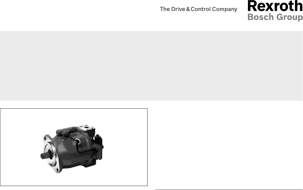 RE 92701/06.2016, Bosch Rexroth AG RE 92701/06.2016, Bosch Rexroth AG Features ▶ Variable pump with axial piston rotary group in swash- plate design for hydrostatic drives in open circuit. ▶ The flow is proportional to the drive speed and displacement. ▶ The flow can be infinitely varied by adjusting the swash- plate angle. ▶ 2 drain ports ▶ Excellent suction performance ▶ Low noise level ▶ Long service life ▶ Favorable power/weight ratio ▶ Versatile controller range ▶ Short control time ▶ The through drive is suitable for adding gear pumps and axial piston pumps up to the same size, i.e., 100% through drive. ▶ Size 18 (A10VSO) ▶ Sizes 28 to 140 (A10VO) ▶ Nominal pressure 280 bar ▶ Maximum pressure 350 bar ▶ Open circuit Axial piston variable pump A10V(S)O Series 31 RE 92701 Edition: 06.2016 Replaces: 01.2012 Contents Type code 2 Hydraulic fluids 4 Working pressure range 6 Technical data, standard unit 7 Technical data, high-speed version 8 DG – Two-point control, direct operated 10 DR – Pressure controller 11 DRG – Pressure controller, remote controlled 12 DFR / DFR1 / DRSC – Pressure and flow controller 13 DFLR – Pressure, flow and power control 15 ED – Electro-hydraulic pressure control 16 ER – Electro-hydraulic pressure control 17 Dimensions, size 18 to 140 18 Dimensions, through drive 49 Overview of mounting options 53 Combination pumps A10VO + A10VO 54 Connector for solenoids 55 Electronic controls 55 Installation instructions 56 Project planning notes 59 Safety instructions 60 Bosch Rexroth AG, RE 92701/06.2016 2 A10V(S)O Series 31 | Axial piston variable pump Type code Type code 01 02 03 04 05 06 07 08 09 10 11 12 13 A10V(S) O / 31 – V Version 18 28 45 71 88 100 140 01 Standard version (without code) ● ● ● ● ● ● ● High-speed version (external dimensions are the same as the standard version) – – ● ● – ● ● H Axial piston unit 02 Swashplate design, variable, nominal pressure 280 bar, maximum pressure 350 bar ● – – – – – – A10VS – ● ● ● ● ● ● A10V Operating mode 03 Pump, open circuit O Size (NG) 04 Geometric displacement, see table of values on pages 6 and 7 18 28 45 71 88 100 140 Control device 05 Two-point control, direct operated ● ● ● ● ● ● ● DG Pressure controller hydraulic ● ● ● ● ● ● ● DR with flow controller hydraulic X-T open ● ● ● ● ● ● ● DFR X-T plugged with flushing function ● ● ● ● ● ● ● DFR1 X-T plugged without flushing function ● ● ● ● ● ● ● DRSC with flow and differential pressure control, electrically variable ● ● ● ● ● ● ● EF1) with pressure cut-off hydraulic remote controlled ● ● ● ● ● ● ● DRG electrical negative control U = 12 V ● ● ● ● ● ● ● ED71 U = 24 V ● ● ● ● ● ● ● ED72 electrical positive control U = 12 V ● ● ● ● ● ● ● ER71 U = 24 V ● ● ● ● ● ● ● ER72 Pressure-flow power control – ● ● ● ● ● ● DFLR Series 06 Series 3, index 1 31 Direction of rotation 07 Viewed on drive shaft clockwise R counter-clockwise L Sealing material 08 FKM (fluoroelastomer) V Drive shaft 18 28 45 71 88 100 140 09 Splined shaft ANSI B92.1a standard shaft ● ● ● ● ● ● ● S similar to shaft “S” however for higher input torque ● ● ● ● ● – – R reduced diameter, limited suitability for through drive (see table of values, page 9) ● ● ● ● ● ● ○ U same as “U”, higher torque; limited suitability for through drive (see table of values, page 9) – ● ● ● ● ● ● W Mounting flange 10 ISO 3019-1 (SAE) 2-hole ● ● ● ● ● ● ● C 4-hole – – – – – – ● D 1) See data sheet 92709 RE 92701/06.2016, Bosch Rexroth AG Axial piston variable pump | A10V(S)O Series 31 Type code 3 Working port 18 28 45 71 88 100 140 11 SAE flange ports according to J518 Working ports metric Fastening thread metric; rear not for through drive – ● ● – – ● ● 11 – – – ● ● – – 41 Fastening thread metric; lateral top bottom for through drive ● ● ● – – ● ● 12 – – – ● ● – – 42 SAE flange ports according to J518 Working ports UNF Fastening thread UNF; rear not for through drive – ● ● – – ● ● 61 – – – ● ● – – 91 Fastening thread UNF; lateral top bottom for through drive ● ● ● – – ● ● 62 – – – ● ● – – 92 Through drive (for mounting options, see page 53) 12 Flange ISO 3019-1 Hub for splined shaft2) Diameter Diameter 18 28 45 71 88 100 140 without through drive ● ● ● ● ● ● ● N00 82-2 (A) 5/8 in 9T 16/32DP ● ● ● ● ● ● ● K01 3/4 in 11T 16/32DP ● ● ● ● ● ● ● K52 101-2 (B) 7/8 in 13T 16/32DP – ● ● ● ● ● ● K68 1 in 15T 16/32DP – – ● ● ● ● ● K04 127-2 (C) 1 1/4 in 14T 12/24DP – – – ● ● ● ● K07 1 1/2 in 17T 12/24DP – – – – – ● ● K24 152-4 (D) 1 3/4 in 13T 8/16DP – – – – – – ● K174) Connectors for solenoids3) 13 Without connector (without solenoid, with hydraulic control only, without code) ● ● ● ● ● ● ● DEUTSCH - molded connector, 2-pin, without suppressor diode ● ● ● ● ● ● ● P ● = Available ○ = On request – = Not available Notice ▶ Note the project planning notes on page 59. ▶ In addition to the type code, please specify the rel- evant technical data when placing your order. 01 02 03 04 05 06 07 08 09 10 11 12 13 A10V(S) O / 31 – V 2) Hub for splined shaft according to ANSI B92.1a 3) Connectors for other electric components can deviate. 4) Only with mounting flange D Bosch Rexroth AG, RE 92701/06.2016 4 A10V(S)O Series 31 | Axial piston variable pump Hydraulic fluids Hydraulic fluids The A10V(S)O variable pump is designed for operation with HLP mineral oil according to DIN 51524. Application instructions and requirements for hydraulic fluids 