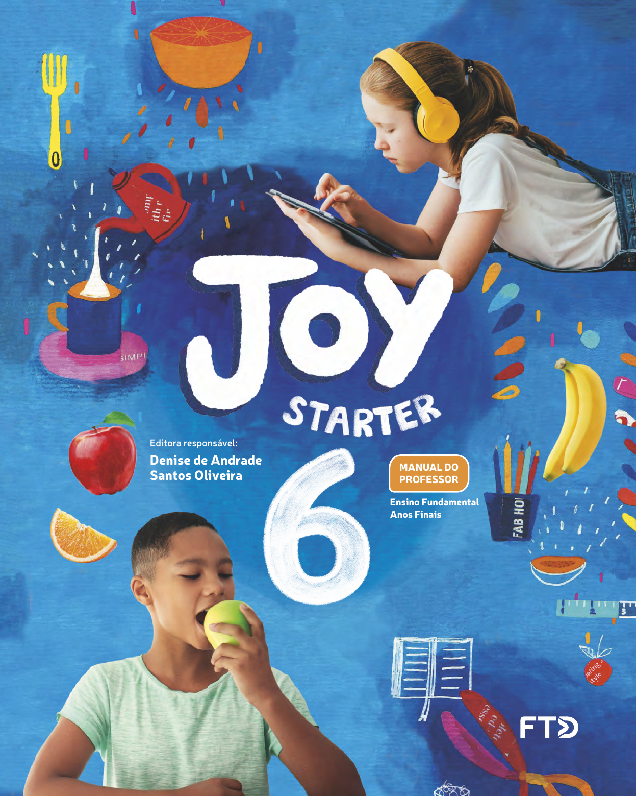 Ensino Fundam ental • Anos Finais Com ponente curricular: Língua Inglesa Componente curricular: Língua Inglesa Editora responsável: Denise de Andrade Santos Oliveira Ensino Fundamental Anos Finais MANUAL DO PROFESSOR 08/08/2022 12:12:4608/08/2022 12:12:46 Organizadora: FTD Educação Obra coletiva concebida, desenvolvida e produzida pela FTD Educação. 1ª edição São Paulo, 2022 Editora responsável: Denise de Andrade Santos Oliveira Licenciada em Letras Anglo-Portuguesas pela Universidade Estadual de Londrina (UEL-PR). Especialista em Língua Inglesa pela Universidade Estadual de Londrina (UEL-PR). Mestra em Letras Estrangeiras Modernas pela Universidade Estadual de Londrina (UEL-PR). Professora de Inglês em institutos de língua estrangeira e em escolas da rede particular de ensino e editora de materiais didáticos da área de Linguagens. Ensino Fundamental Anos Finais MANUAL DO PROFESSOR Componente curricular: Língua Inglesa 05/08/2022 16:19:0005/08/2022 16:19:00 Impresso no Parque Gráfico da Editora FTD CNPJ 61.186.490/0016-33 Avenida Antonio Bardella, 300 Guarulhos-SP – CEP 07220-020 Tel. (11) 3545-8600 e Fax (11) 2412-5375 Reprodução proibida: Art. 184 do Código Penal e Lei 9.610 de 19 de fevereiro de 1998. Todos os direitos reservados à EDITORA FTD. Rua Rui Barbosa, 156 – Bela Vista – São Paulo – SP CEP 01326-010 – Tel. 0800 772 2300 Caixa Postal 65149 – CEP da Caixa Postal 01390-970 www.ftd.com.br central.relacionamento@ftd.com.br Em respeito ao meio ambiente, as folhas deste livro foram produzidas com fibras obtidas de árvores de florestas plantadas, com origem certificada. Direção-geral Ricardo Tavares de Oliveira Direção de conteúdo e negócios Cayube Galas Direção editorial adjunta Ana Carolina Costa Lopes Gerência editorial Renata Lara de Moraes Edição Myrian Kobayashi Yamamoto (coordenação) Preparação/Revisão Beatriz Carneiro (supervisão) Assistência de produção Janaina Simplicio Gerência de produção e arte Letícia Mendes de Souza Supervisão de arte e design Simone Oliveira Vieira Coordenação de imagens e textos Marcia Berne Supervisão de arquivos Silvia Regina E. Almeida Coordenação de eficiência e analytics Marcelo Henrique Ferreira Fontes Direção de operações e produção gráfica Reginaldo Soares Damasceno Projeto e produção editorial Scriba Soluções Editoriais Edição Denise de Andrade Santos Oliveira, Karina Otsuka Nihonmatsu, Rosana Gemima Amancio, Guilherme dos Santos Roberto Assistência editorial Marcela Marques Carreiro, Guilherme José Franzon Schürmann Preparação/Revisão Moisés Manzano da Silva (coordenação), Raisa Rodrigues da Fonseca Revisão técnica Jacob Lee Gaston Gerência de produção editorial Camila Rumiko Minaki Hoshi Supervisão de produção editorial Priscilla de Freitas Cornelsen Rosa Coordenação de produção editorial Daiana Fernanda Leme de Melo Coordenação de produção de arte Tamires Rose Azevedo Edição de arte Rogério Casagrande Projeto gráfico e capa Marcela Pialarissi Imagens de capa Alex Staroseltsev/Shutterstock.com (maça), Ilona Kozhevnikova/Shutterstock.com (menina), Africa Studio/Shutterstock.com (menino), Tim UR/Shutterstock.com (laranja), Pixfiction/Shutterstock.com (banana), Erica Maradona (ilustrações) Diagramação Ana Maria Puerta Guimarães, Laryssa Dias Almeron dos Santos, Vivian Larissa Morita, Formato Comunicação Ltda. Autorização de recursos Marissol Martins Maia (coordenação) e Erika Cristina Iconografia Bruna Parronchi Tratamento de imagens Janaina Oliveira e Jéssica Sinnema Todos os direitos reservados à Editora FTD S.A. ELABORADORES DE ORIGINAIS Denise de Andrade Santos Oliveira Licenciada em Letras Anglo-Portuguesas pela Universidade Estadual de Londrina (UEL-PR). Especialista em Língua Inglesa pela Universidade Estadual de Londrina (UEL-PR). Mestra em Letras Estrangeiras Modernas pela Universidade Estadual de Londrina (UEL-PR). Professora de Inglês em institutos de língua estrangeira e em escolas da rede particular de ensino e editora de materiais didáticos da área de Linguagens. Ana Cláudia Cury Calia de Souza Licenciada em Letras Estrangeiras Modernas pela Universidade Estadual de Londrina (UEL-PR). Especialista em Formação de Professor, Práticas Metodológicas e Tradutórias pela Universidade Estadual de Maringá (UEM-PR). Mestra em Estudos da Linguagem pela Universidade Estadual de Londrina (UEL-PR). Doutora em Estudos da Linguagem pela Universidade Estadual de Londrina (UEL-PR). Professora de Inglês em escolas da rede particular de ensino, elaboradora e editora de materiais didáticos da área de Linguagens. Maria Paula Pereira de Lima Licenciada em Letras Estrangeiras Modernas pela Universidade Estadual de Londrina (UEL-PR). Elaboradora e editora de materiais didáticos da área de Linguagens. Glaucia Alecrin Timoteo Silva Licenciada em Letras Português-Inglês pela Universidade Cesumar (Unicesumar-PR). Elaboradora de materiais didáticos da área de Linguagens. Ficha técnica dos recursos em áudio Locução: Lee Courtney Marvin, Mari Guedes, Rodrigo Seiji Kaneko, Tinofara Trevor Mangwiza Captação, edição e mixagem: Yan Maran 22-114403 CDD-372.652 Dados Internacionais de Catalogação na Publicação (CIP) (Câmara Brasileira do Livro, SP, Brasil) Joy starter : 6º ano : ensino fundamental : anos finais / organizadora FTD Educação ; obra coletiva concebida, desenvolvida e produzida pela FTD Educação ; editora responsável Denise de Andrade Santos Oliveira. -- 1. ed. -- São Paulo : FTD, 2022. Componente curricular: Língua inglesa. ISBN 978-85-96-03405-0 (aluno) ISBN 978-85-96-03406-7 (professor) 1. Inglês (Ensino fundamental) I. Oliveira, Denise de Andrade Santos. Índices para catálogo sistemático: 1. Inglês : Ensino fundamental 372.652 Cibele Maria Dias - Bibliotecária - CRB-8/9427 09/08/2022 08:54:2509/08/2022 08:54:25 Caro professor, O mundo segue em constante mudança, e não po- demos