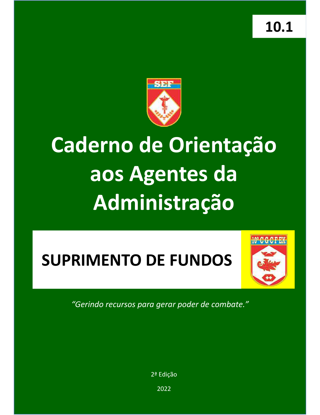Caderno de Orientação aos Agentes da Administração 10.1 SUPRIMENTO DE FUNDOS “Gerindo recursos para gerar poder de combate.” 2ª Edição 2022 Caderno de Orientação aos Agentes da Administração 10.1 Suprimento de Fundos 1 INTRODUÇÃO Caro agente da administração, Este documento tem por finalidade esclarecer aspectos importantes para o exercício da sua função. É natural que, ao assumir a função de agente da administração, os militares e servidores civis tenham dúvidas a respeito das atividades que devem executar e as responsabilidades envolvidas. Assim, elaborou-se este documento informativo, que, além de renovar conhecimentos e destacar pontos importantes, tem o intuito de permitir a melhor gestão dos recursos públicos colocados à disposição do Exército. A fim de facilitar a compreensão, os assuntos são apresentados, observando-se as dúvidas corriqueiras e os pontos mais importantes da legislação pertinente. Se restarem interrogações, por favor, procure o Centro de Gestão, Contabilidade e Finanças do Exército apoiador de sua organização militar. Caso, ainda assim, persistam dúvidas, utilize os canais de contato disponibilizados pela SEF. Será uma satisfação esclarecer suas dúvidas. Convém destacar que este documento tem objetivo meramente informativo, não se sobrepondo à legislação vigente e nem servindo como amparo legal para quaisquer postulações. Boa leitura! Secretaria de Economia e Finanças Caderno de Orientação aos Agentes da Administração 10.1 Suprimento de Fundos 2 SUMÁRIO 1. FINALIDADE ........................................................................................................................... 3 2. O QUE É O SUPRIMENTO DE FUNDOS (SF)............................................................................... 3 3. QUANDO UTILIZAR SUPRIMENTO DE FUNDOS ........................................................................ 3 4. LIMITES PARA SUPRIMENTO DE FUNDOS................................................................................ 5 4.1 LIMITES DE CONCESSÃO .....................................................................................................................5 4.2 LIMITE DE DESPESAS DE PEQUENO VULTO ..............................................................................................6 4.3 RESUMO DOS LIMITES........................................................................................................................6 4.4 FRACIONAMENTO.............................................................................................................................7 5. PROPOSTA DE CONCESSÃO DE SUPRIMENTO DE FUNDOS - PCSF ............................................ 7 6. EMISSÃO DE EMPENHOS ........................................................................................................ 7 7. UTILIZAÇÃO DO CARTÃO DE PAGAMENTO DO GOVERNO FEDERAL - CPGF .............................. 8 8. UTILIZAÇÃO DA CONTA-CORRENTE TIPO “B” ........................................................................ 11 9. REGISTROS NO SIAFI............................................................................................................. 12 9.1 LIQUIDAÇÃO DA DESPESA .................................................................................................................12 9.2 PAGAMENTO DA FATURA DO CPGF ...................................................................................................13 9.3 REGISTRO DA PRESTAÇÃO DE CONTAS ................................................................................................14 9.4 DEVOLUÇÃO DE SAQUES NÃO UTILIZADOS ...........................................................................................14 9.5 SALDO NÃO APLICADO.....................................................................................................................15 9.6 CONTAS CONTÁBEIS RELATIVAS A SUPRIMENTO DE FUNDOS....................................................................16 9.7 ENCARGOS E RETENÇÕES .................................................................................................................16 10. PRAZOS.............................................................................................................................. 17 11. PRESTAÇÃO DE CONTAS ..................................................................................................... 18 11.1MONTAGEM DO PROCESSO ............................................................................................................18 11.2 ANÁLISE DA PRESTAÇÃO DE CONTAS .................................................................................................19 12. RESTRIÇÕES AO AGENTE SUPRIDO...................................................................................... 20 13. SUPRIMENTO DE FUNDOS E O REGIME ESPECIAL ................................................................ 20 14. PROBLEMAS MAIS COMUNS OBSERVADOS NOS SF............................................................. 21 15. ORIENTAÇÕES GERAIS AO AGENTE SUPRIDO ...................................................................... 22 LEGISLAÇÃO DE REFERÊNCIA .................................................................................................... 24
