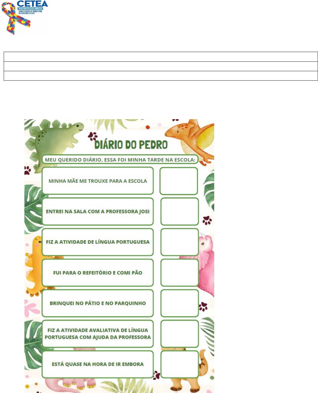 CETEA- JUDITHA PALUDO ZANUZZO ATIVIDADE AVALIATIVA COMPONENTE CURRICULAR: LÍNGUA PORTUGUESA ALUNO (A): PROFª: JOSIELI DATA:____/____/_____ TRIMESTRE: 3º TRIMESTRE 1ª ATIVIDADE AVALIATIVA DE LÍNGUA PORTUGUESA 1- RECORTE AS FIGURAS E COLE NA FRASE CORRESPONDENTE À UMA ATIVIDADE QUE VOCÊ REALIZOU, NO DIÁRIO ILUSTRADO ABAIXO: OBSERVAÇÕES:________________________________________________________________________________________________________________________________________________________________________________________________________________________________________ Avenida Guaíra, 510 Tropical, CEP: 85807- 430 Fone (045)3321-2232 – Cascavel - Paraná image2.png image1.png