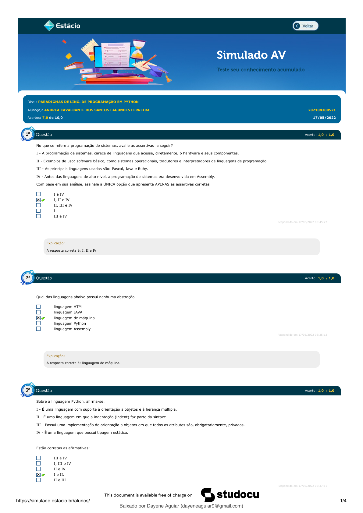 17/05/2022 06:56 Estácio: Alunos https://simulado.estacio.br/alunos/ 1/4 Disc.: PARADIGMAS DE LING. DE PROGRAMAÇÃO EM PYTHON Aluno(a): ANDREA CAVALCANTE DOS SANTOS FAGUNDES FERREIRA 202108380521 Acertos: 7,0 de 10,0 17/05/2022 Acerto: 1,0 / 1,0 No que se refere a programação de sistemas, avalie as assertivas a seguir? I - A programação de sistemas, carece de linguagens que acesse, diretamente, o hardware e seus componentes. II - Exemplos de uso: software básico, como sistemas operacionais, tradutores e interpretadores de linguagens de programação. III - As principais linguagens usadas são: Pascal, Java e Ruby. IV - Antes das linguagens de alto nível, a programação de sistemas era desenvolvida em Assembly. Com base em sua análise, assinale a ÚNICA opção que apresenta APENAS as assertivas corretas I e IV I, II e IV II, III e IV I III e IV Respondido em 17/05/2022 06:45:27 Explicação: A resposta correta é: I, II e IV Acerto: 1,0 / 1,0 Qual das linguagens abaixo possui nenhuma abstração linguagem HTML linguagem JAVA linguagem de máquina linguagem Python linguagem Assembly Respondido em 17/05/2022 06:35:12 Explicação: A resposta correta é: linguagem de máquina. Acerto: 1,0 / 1,0 Sobre a linguagem Python, afirma-se: I - É uma linguagem com suporte à orientação a objetos e à herança múltipla. II - É uma linguagem em que a indentação (indent) faz parte da sintaxe. III - Possui uma implementação de orientação a objetos em que todos os atributos são, obrigatoriamente, privados. IV - É uma linguagem que possui tipagem estática. Estão corretas as afirmativas: III e IV. I, III e IV. II e IV. I e II. II e III. Respondido em 17/05/2022 06:37:11 Baixado por Dayene Aguiar (dayeneaguiar9@gmail.com) lOMoARcPSD|48644674 Mobile User 17/05/2022 06:56 Estácio: Alunos https://simulado.estacio.br/alunos/ 2/4 Explicação: A resposta correta é: I e II. A linguagem Python é conhecida por possuir tipagem dinâmica, ou seja, a atribuição de valores a uma variável ocorre durante a execução, podendo ser alterada dinamicamente. Sua sintaxe indentada promove a organização do código e a fluidez de leitura. O Python agrega os atributos de visibilidade presentes nas linguagens orientadas a objetos. Acerto: 1,0 / 1,0 Considere a seguinte expressão: (True + 2)**2 Utilizando Python para avaliar a expressão, é correto afirmar que: A expressão vale True. A expressão vale 9. A expressão vale 1. A expressão vale 6. Não será possível efetuar a operação em virtude da incompatibilidade de tipos. Respondido em 17/05/2022 06:40:48 Explicação: A resposta correta é: A expressão vale 9. Vamos analiser por partes: (True + 2)**2 (1 + 2)**2 (3)**2 9 Acerto: 1,0 / 1,0 Considere o seguinte trecho de um programa escrito em Python: a = 0 for i in range(30): if a%2 == 0: a += 1 continue else: if a%5 == 0: break else: a += 3 print(a) Assinale a opção que apresenta corretamente o que será impresso na tela. 6 2 5 30 10 Respondido em 17/05/2022 06:48:21 Explicação: A resposta correta: 5 Acerto: 1,0 / 1,0 Observe o código abaixo em Python. a, b = 0, 1 while b