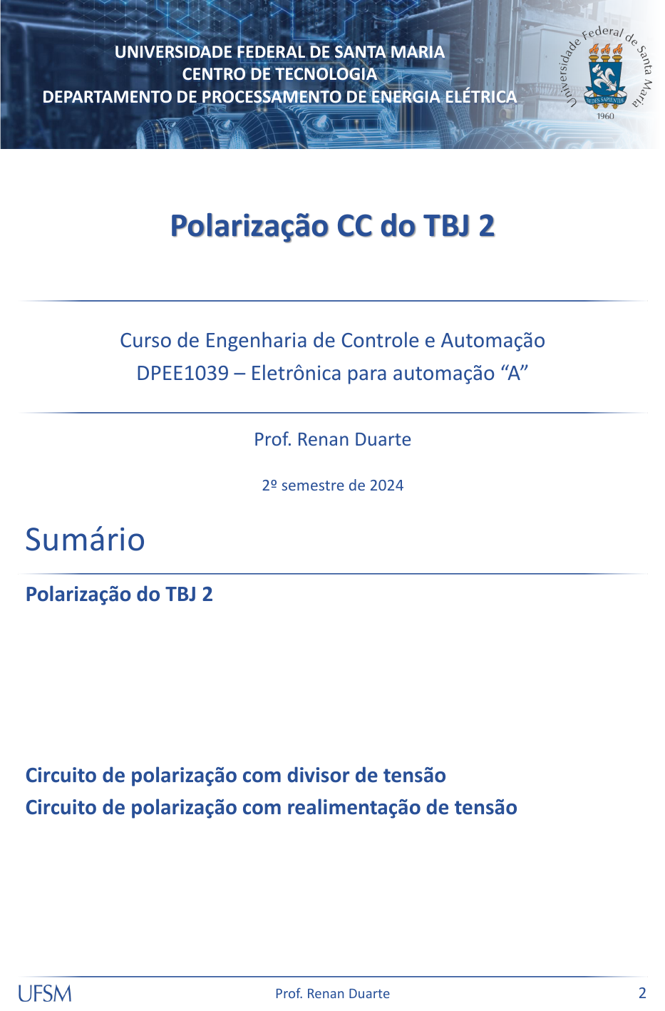 Prof. Renan Duarte UNIVERSIDADE FEDERAL DE SANTAMARIA CENTRO DE TECNOLOGIA DEPARTAMENTO DE PROCESSAMENTO DE ENERGIA ELÉTRICA Polarização CC do TBJ 2 Curso de Engenharia de Controle e Automação DPEE1039 – Eletrônica para automação “A” 2º semestre de 2024 2Prof. Renan Duarte Circuito de polarização com divisor de tensão Circuito de polarização com realimentação de tensão Sumário Polarização do TBJ 2 3Prof. Renan Duarte Relação entre as correntes no transistor Ganho de corrente do amplificador (emissor comum) Queda de tensão entre base e emissor (junção pn de silício) Revisão Equações características = + = ≅ 0,7V Valor constante 4Prof. Renan Duarte 1: Capacitor de acoplamento : Capacitor de desacoplamento Se sinal é CC: = 0→ = ∞→ Circuito aberto Polarização por divisor de tensão Topologia = 5Prof. Renan Duarte Para simplificar a análise do circuito CC equivalente, podemos transformar a malha de entrada através do Teorema de Thévenin, obtendo um circuito com um único resistor em série com a base do transistor Polarização por divisor de tensão Análise 6Prof. Renan Duarte Determinação do equivalente Thévenin Circuito equivalente Polarização por divisor de tensão Análise ℎ = 2 = 1 + ℎ = 1|| = 1 1 + 7Prof. Renan Duarte Aplicando LKT na malha de entrada: −ℎ + ℎ + + = 0 Sabemos que = + , então: −ℎ + ℎ + + + = 0 Temos uma resposta idêntica ao do circuito com estabilização do emissor. Se aumentar (devido à temperatura por exemplo), irá diminuir, deixando o ponto mais estável Polarização por divisor de tensão Análise = ℎ − ℎ + + 8Prof. Renan Duarte Polarização por divisor de tensão Análise Na malha de saída teremos: − + + + = 0 Em casos onde ≫ , temos que Logo, a queda de tensão entre coletor e emissor do transistor será: = − ( + ) = + ≅ = − − 9Prof. Renan Duarte Determine , e Respostas: = 8,38μA = 0,84mA = ,34V Polarização por divisor de tensão Exercício 1 tinyurl.com/257r4rth 10Prof. Renan Duarte Mesmo comportamento do circuito com estabilização do emissor Polarização por divisor de tensão Análise pela reta de carga 11Prof. Renan Duarte Capacitores 1 e ainda têm a mesma função Pode haver capacitor em paralelo com → Análise CA (próximas aulas) Polarização por realimentação do coletor Topologia 12Prof. Renan Duarte Aplicando LKC ao nó do coletor do transistor, temos: ′ = + Podemos concluir então que ′ = Aplicando LKT na malha de entrada: − + ′ + + + = 0 Sabemos que = + , então: − + + + + + + = 0 Polarização por realimentação do coletor Análise = − + + (+) Ganho da realimentação é maior que no caso anterior 13Prof. Renan Duarte Polarização estável do emissor Análise Na malha de saída teremos: − + ′ + + = 0 Como ′ = , a queda de tensão entre coletor e emissor do transistor será: = − ( + ) 14Prof. Renan Duarte Determine , e Respostas: = ,9μA = ,07mA = 3,69V Polarização estável do emissor Exercício 2 tinyurl.com/2ampd95w 15Prof. Renan Duarte Refaça o exercício 2 considerando que sofreu variação para 135 e compare os resultados Resposta Apesar de sofrer um aumento de 50%, a corrente de base diminuiu para compensar a variação. A corrente de coletor aumentou apenas 12,1% e a tensão reduziu apenas 20,9% Polarização estável do emissor Exercício 3 Parâmetro = = ,9μA 8,89μA ,07mA ,mA 3,69V ,9V 16Prof. Renan Duarte Mesmo comportamento do circuito com estabilização do emissor Polarização estável do emissor Análise pela reta de carga 17Prof. Renan Duarte Transistores bipolares de junção • Transistor operando como chave • Resposta em frequência • Parâmetros importantes Revisão Próxima aula 18Prof. Renan Duarte Dúvidas? renan.duarte@gedre.ufsm.br GEDRE – Prédio 10 – CTLAB