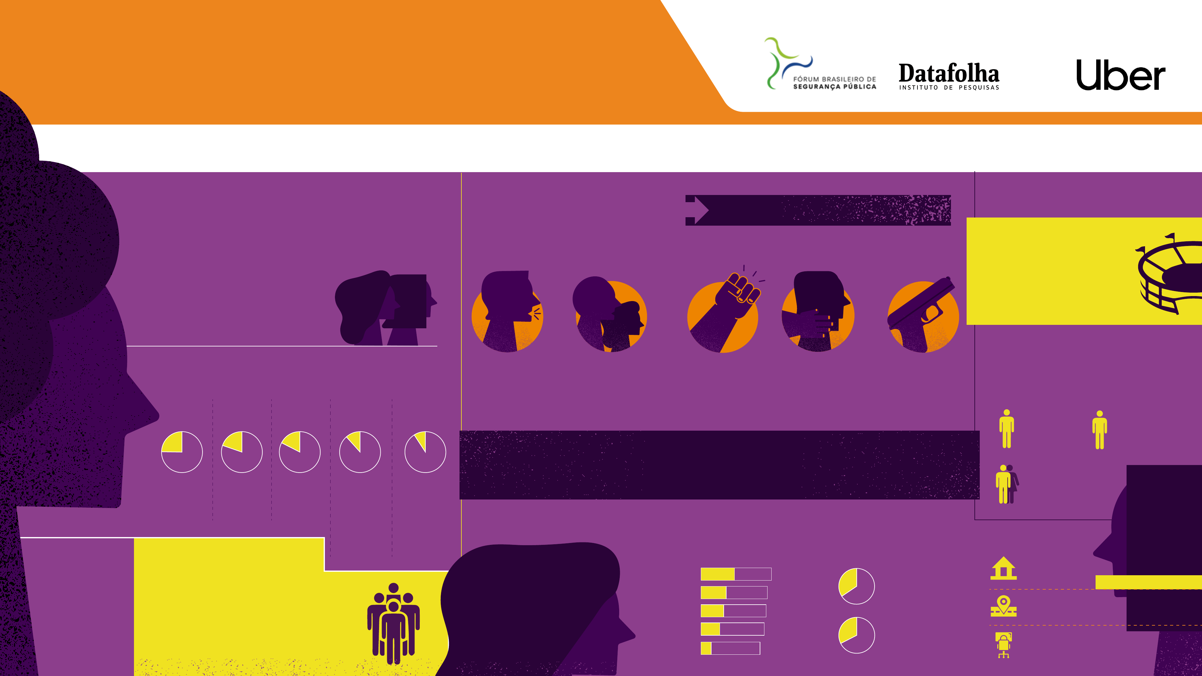 Design/Ilustração Lais Oliveira VISÍVEL E INVISÍVEL a Vitimização de Mulheres no Brasil. 4ª edição - 2023 Violências sofridas pelas brasileiras no último ano Realização Patrocínio Ameaça com faca ou arma de fogo 5,1% Espancamento ou tentativa de estrangulamento 5,4% Chutes e socos 14 MULHERES AGREDIDAS POR MINUTO 11,6% Perseguição 13,5% Ofensas verbais 23,1% 14,9 milhões 8,7 milhões 7,6 milhões 3,5 milhões 3,3 milhões 28,9% Sofreram algum tipo de violência ou agressão Quem era o agressor? Pela primeira vez, o ex-parceiro aparece como principal agressor Violência ao longo da vida Percepção da população Principais formas de violência provocadas por parceiro íntimo ou ex Epidemia de violência 33,4% das mulheres brasileiras com 16 anos ou mais sofreram violência física e/ou sexual por parte de parceiro íntimo ou ex Maior do que a média global, de 27% (OMS) 21,5 milhões de mulheres 32,6% Psicológica Física Forçada a ficar sozinha ou impedida de se comunicar com amigos e familiares Sexual Teve acesso negado a recursos básicos, como assistência médica ou dinheiro 24,5% 21,1% 12,9% 9,8% 6,3 milhões 8,3 milhões 13,6 milhões 15,8 milhões 21 milhões 65,2% 52% dos brasileiros acham que a violência contra a mulher aumentou no último ano relatam ter visto alguma situação de violência nos últimos 12 meses 18,6 milhões de mulheres 50.962 sofreram violência diariamente em 2022. O equivalente a um estádio lotado. EPISÓDIOS DE VIOLÊNCIA 4 vezes é o número médio de agressões sofridas no último ano. Entre mulheres divorciadas, a média foi de 9 agressões ex-cônjuge ex-companheiro ex-namorado 31,3% cônjuge companheiro namorado 26,7% na rua17,6% pai/mãe 8,4% no trabalho4,7% 53,8% residem em cidades do interior 51,9% em capitais e RM 48,1% 65,6% Negras 29,0% Brancas 2,3% Amarelas 3,0% Indígenas QUEM SÃO ESSAS MULHERES? Onde ocorreu?Idade 57,4% tinham filhos 16 a 24 25 a 34 35 a 44 45 a 59 60 e + 30,3% 22,8% 20,6% 17,1% 9,2% casa espaço de maior violência Denunciou em uma Delegacia da Mulher Delegacia da Mulher 14% Realização Patrocínio VISÍVEL E INVISÍVEL a Vitimização de Mulheres no Brasil. Crescimento de todas as formas de violências sofridas pelas brasileiras no último ano Procurou ajuda da Família Procurou ajuda dos Amigos Denunciou à Polícia através de um registro eletrônico Ligou para a Central de Atendimento à Mulher (180) Razões para não procurar a polícia O que fez após o episódio mais grave de violência? Maior índice já registrado Ações consideradas muito importantes pelas mulheres para enfrentar a violência doméstica Sofreu algum tipo de assédio no último ano 60 2017 2019 2021 2023 40 20 0 21,3% 14,4% resolveram sozinhas não acreditavam que a polícia pudesse oferecer solução não tinham provas suficientes 76,5% Punir de forma mais severa aqueles que cometem violência doméstica 72,4% alguém para conversar, como um psicólogo ou outro especialista em saúde mental 69,4% Oferecer suporte legal e serviços que orientem a mulher 67,9% Ampliar a divulgação de campanhas sobre conscientização e denúncia de violência doméstica para homens e mulheres 67,2% Garantir acesso a necessidades básicas para mulheres em situação de violência 38,0% ligou para a PM no 190 1,6%1,7%4,8% Espancamento ou tentativa de estrangulamento 2021 0,0% 5,0% 10,0% 15,0% 20,0% 25,0% 30,0% 35,0% Ameaça com faca ou arma de fogo Insulto, humilhação ou xingamento (Ofensa verbal) SOFREU ALGUM TIPO DE VIOLÊNCIA OU AGRESSÃO Amedrontamento ou perseguição Batida, empurrão ou chute Ofensa sexual 2023 2,4% 5,4% 5,1% 3,1% 5,4% 9,0% 6,3% 7,9% 13,5% 18,6% 23,1% 24,4% 28,9% 11,6% Metodologia: Pesquisa quantitativa com abordagem pessoal em ponto de fluxo. Amostra de abrangência nacional (2.017 entrevistas) representativa do universo de população adulta brasileira com 16 anos ou mais. Entrevistas realizadas em 126 municípios entre os dias 09 e 13 de janeiro de 2023, tendo como referência o período dos 12 meses anteriores à pesquisa. Módulo de autopreenchimento com questões aplicadas somente às mulheres (1042 mulheres, das quais 818 respondentes). Margem de erro de 2,0 pontos para mais ou para menos na amostra nacional e de 3,0 pontos para mais ou para menos na amostra do módulo de autopreenchimento. As projeções populacionais consideram os valores médios previstos a partir da margem de erro. Fonte: Datafolha e Fórum Brasileiro de Segurança Pública. Assédio Cantadas e comentários desrespeitosos na rua41,0% Cantadas e comentários desrespeitosos no ambiente de trabalho 18,6% Assediadas fisicamente no transporte público12,8% Abordadas de maneira agressiva em uma festa11,2% + frequentes Quantas mulheres? 26,3 milhões 11,9 milhões 8,2 milhões 7,2 milhões 46,7% das brasileiras afirma ter sofrido alguma forma de assédio em 2022 15,6%17,3% 40,2 37,1 37,9 46,7 Não fez nada 45% 30 milhões de mulheres Design/Ilustração Lais Oliveira