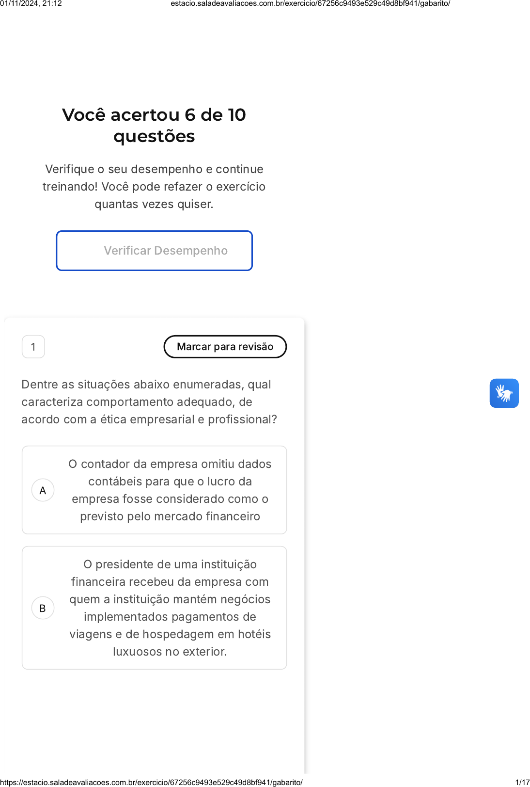 Você acertou 6 de 10 questões Verifique o seu desempenho e continue treinando! Você pode refazer o exercício quantas vezes quiser. Verificar Desempenho A B 1 Marcar para revisão Dentre as situações abaixo enumeradas, qual caracteriza comportamento adequado, de acordo com a ética empresarial e profissional? O contador da empresa omitiu dados contábeis para que o lucro da empresa fosse considerado como o previsto pelo mercado financeiro O presidente de uma instituição financeira recebeu da empresa com quem a instituição mantém negócios implementados pagamentos de viagens e de hospedagem em hotéis luxuosos no exterior. 01/11/2024, 21:12 estacio.saladeavaliacoes.com.br/exercicio/67256c9493e529c49d8bf941/gabarito/ https://estacio.saladeavaliacoes.com.br/exercicio/67256c9493e529c49d8bf941/gabarito/ 1/17 C D E O diretor-presidente da empresa YYY cobrava comissões de todas as empresas que firmavam contratos com aquela que era por ele dirigida. Os membros da diretoria de uma empresa, em busca de lucro maior, procederam à reorganização da empresa com corte de empregos ocupados por empregados que não produziam adequadamente. Um dos gerentes da empresa WW contratou, para prestar serviços vultosos, uma empresa vinculada a parentes de sua esposa, sem cotação de preços. Resposta correta Parabéns, você selecionou a alternativa correta. Confira o gabarito comentado! Gabarito Comentado A resposta correta é: Os membros da diretoria de uma empresa, em busca de lucro maior, procederam à reorganização da empresa com corte de empregos ocupados por empregados que não produziam adequadamente. A reorganização da empresa com corte de empregos ocupados por empregados que não produziam adequadamente é uma medida que visa aumentar a produtividade da empresa e, consequentemente, o seu lucro. As demais alternativas não são corretas, pois envolvem práticas que são consideradas inéticas, como omitir dados contábeis, receber pagamentos de viagens 01/11/2024, 21:12 estacio.saladeavaliacoes.com.br/exercicio/67256c9493e529c49d8bf941/gabarito/ https://estacio.saladeavaliacoes.com.br/exercicio/67256c9493e529c49d8bf941/gabarito/ 2/17 A B C e de hospedagem em hotéis luxuosos no exterior, cobrar comissões de todas as empresas que firmavam contratos com aquela que era por ele dirigida e contratar, para prestar serviços vultosos, uma empresa vinculada a parentes de sua esposa, sem cotação de preços. 2 Marcar para revisão Analise as afirmativas a seguir. I. A simples existência da moral já significa uma presença da ética, já que os dois termos são sinônimos e representam a ciência que estuda e problematiza os valores e costumes da sociedade. II. No caso da ética, todos os meios são justificáveis, não só aqueles que estão de acordo com os fins da própria ação. Em outras palavras, fins éticos não exigem meios éticos. III. A ética profissional representa um conjunto de normas e valores morais que direcionam a conduta dos integrantes de determinada profissão e distingue-se do conceito de ética pessoal. No que tange aos conceitos de ética geral pessoal e profissional, ética e moral, sociedade e ética, contabilidade na sociedade, está correto o que se afirma apenas em: I. II III. 01/11/2024, 21:12 estacio.saladeavaliacoes.com.br/exercicio/67256c9493e529c49d8bf941/gabarito/ https://estacio.saladeavaliacoes.com.br/exercicio/67256c9493e529c49d8bf941/gabarito/ 3/17 D E I e II. II e III. Resposta incorreta Opa! A alternativa correta é a letra C. Confira o gabarito comentado! Gabarito Comentado A resposta correta é: III. A ética profissional é um conjunto de normas e valores morais que direcionam a conduta dos integrantes de determinada profissão e distingue-se do conceito de ética pessoal. ----- 3 Marcar para revisão A ética, que marca as discussões na sociedade e nos ambientes organizacionais, tornou-se tema importante e essencial para a conquista da legitimidade em uma época em que a confiança da sociedade é um dos componentes fundamentais para a aceitação social. Sobre a dimensão ética dos espaços de negociação, assinale a alternativa incorreta. Questão 4 de 10 Corretas �6� Incorretas �4� Em branco �0� 1 2 3 4 5 6 7 8 9 10 Exercicio Ética Geral e Profissional Sair 01/11/2024, 21:12 estacio.saladeavaliacoes.com.br/exercicio/67256c9493e529c49d8bf941/gabarito/ https://estacio.saladeavaliacoes.com.br/exercicio/67256c9493e529c49d8bf941/gabarito/ 4/17 A B C D E Na sociedade da informação e do conhecimento, o modelo de gestão é científico e tecnocrático, centrado nos processos. Atualmente, o respeito aos princípios morais e éticos tem se mostrado uma condição para a sustentabilidade e legitimidade pública das organizações. As estratégias de comunicação e marketing na atualidade têm priorizado os valores éticos e sociais dos produtos e serviços para fornecer às marcas uma sustentação moral. A ética contribui para que as organizações possam delimitar o campo das suas escolhas e tornar compreensíveis os fatos sociais que têm implicações morais. A sociedade vem exigindo empresas mais éticas. Resposta correta Parabéns, você selecionou a alternativa correta. Confira o gabarito comentado! Gabarito Comentado A alternativa incorreta afirma que "Na sociedade da informação e do conhecimento, o modelo de gestão é científico e tecnocrático, centrado nos processos". No entanto, na sociedade atual, marcada pela informação e pelo 01/11/2024, 21:12 estacio.saladeavaliacoes.com.br/exercicio/67256c9493e529c49d8bf941/gabarito/ https://estacio.saladeavaliacoes.com.br/exercicio/67256c9493e529c49d8bf941/gabarito/ 5/17 A B conhecimento, o modelo de gestão não é apenas científico e tecnocrático, centrado nos processos. Ele também precisa considerar aspectos éticos, sociais e humanos. Portanto, a gestão não pode ser reduzida apenas a processos técnicos e científicos, mas deve incorporar uma dimensão ética e social