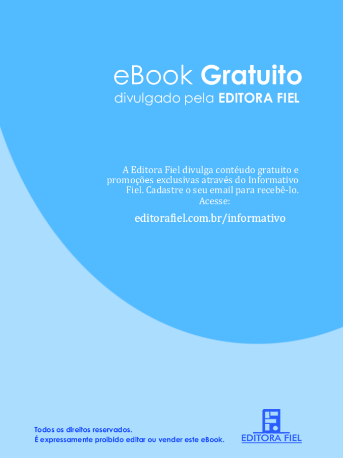 Editora Fiel John PiPer Deus Glorificado e a Alma Satisfeita Plena Satisfação em Deus Deus glorificado e a alma satisfeita. Publicado originalmente me inglês sob o título de The Dangerous Duty of Delight, por John Piper Copyright©2001 por Desiring God Foundation Publicado por Multnomah Books, uma marca de Crown Publishing Group Uma divisão de Random House, Inc. 12265 Oracle Boulevard, Suíte 200 Colorado Springs, Colorado 80921 USA Todos os direitos para tradução em outros idiomas devem ser contratados através de: Gospel Literature International P. O Box 4060, Ontário, Califórnia 91761-1003 USA A presente tradução foi feita com a permissão de Multnomah Books, uma marca de Crown Publishing Group Uma divisão de Random House, Inc. Primeira edição em português © Editora Fiel 2009 • Todos os direitos em língua portuguesa reservados por Editora Fiel da Missão Evangélica Literária Proibida a reprodução deste livro por quaisquer meios, sem a permissão escrita dos editores, salvo em breves citações, com indicação da fonte. • Presidente: Rick Denham Presidente emérito: James Richard Denham Jr. Editor: Tiago Santos Tradução: Juliana G. Duarte Portella Revisão: Franklin Ferreira Diagramação: Layout Produção Gráfica Capa: Edvânio Silva ISBN: 978-85-99-145-63-0 Editora Fiel Caixa Postal 1601 CEP 12230-971 São José dos Campos-SP PABX.: (12) 3936-2529 www.editorafiel.com.br Índice Prefácio .....................................................................................10 Capítulo 1 Considerar o prazer em Deus como nosso dever é um assunto polêmico ............................................................................. 13 Capítulo 2 Glorifique a Deus alegrando-se nEle para sempre .......................19 Capítulo 3 Afeições...Não são uma opção! ...................................................31 Capítulo 4 Buscar o prazer em Deus mina o orgulho e a autocomiseração ....36 Capítulo 5 Busque a sua alegria na alegria do Amado ..................................41 Capítulo 6 O que isso significa na adoração? ...............................................58 Plena Satisfação em Deus6 Capítulo 7 O que isso significa no casamento? .............................................64 Capítulo 8 O que isso significa nas finanças? ...............................................69 Capítulo 9 O que isso significa nas missões? ................................................80 Epílogo: Um chamado final ......................................................88 Notas .........................................................................................90 Você quer conhecer mais sobre este assunto? ........................92 Imaginem-me com os dentes cerrados, perseguindo a alegria — completamente armado, pois essa busca é altamente perigosa. Flannery O’connor Há quinze anos eu dediquei a versão maior deste livro, Em Busca de Deus – A Plenitude da Alegria Cristã, ao meu pai William Solomon Hottle Piper Agora, mais do que nunca, há um doce débito que sinto para com ele, todos estes cinqüenta e cinco anos da minha vida, pela feliz santidade que ele viveu para a glória de Deus e por minha causa. “Inquieto está o nosso coração, enquanto não repousa em Ti.” Santo Agostinho “Se encontro em mim um desejo que nenhuma experiência deste mundo pode satisfazer, a explicação mais provável é a de que fui criado para um outro mundo.” C. S. Lewis Plena Satisfação em Deus10 Caro leitor, Esse livrete de John Piper é um resumo de sua obra maior, “Desiring God”, publicado no Brasil pela Shedd Publicações sob o título de “Em busca de Deus – A plenitude da alegria cristã”. A tônica desta obra está em sua premissa básica, que é desenvolvida em todos os capítulos do livro: Deus é mais glo- rificado em nós quando somos mais satisfeitos n’Ele. Assim, vemos que a maior motivação da vida do cristão é buscar a Deus e gozá-lo para sempre. Piper, muitas vezes alerta o leitor que o grande problema da humanidade é que ela se contenta com muito pouco prazer; busca sua alegria em coisas fugazes e efêmeras. E, para enfatizar o dever do amor e prazer em Nota do Editor 11Nota do Editor • Deus, como expressão máxima da alegria verdadeira e perene, criou uma expressão, o “hedonismo cristão”. Entendemos o interesse do autor em chamar a atenção do leitor para o dever deste em buscar prazer em Deus, e o conseqüente uso de uma linguagem que, embora chocante, possa traduzir esse forte apelo. No entanto, entendemos que a associação de um en- sino tão bíblico e belo com uma terminologia proveniente de filosofia estranha à fé cristã, não seria apropriado, por isso, todas as vezes que aquele termo é empregado, utilizamos a expressão “prazer cristão”, pois esta traduz bem o propósito do autor e não dá margem à uma interpretação equivocada da mensagem principal, que é bíblica e deve ser buscada por todo cristão. Amado Leitor, Escrevo este livreto porque a verdade e a beleza de Jesus Cris- to, o Filho de Deus, são fascinantes. Eu faço coro com o salmista: Uma coisa peço ao Senhor, e a buscarei: que eu possa morar na Casa do Senhor todos os dias da minha vida, para contemplar a beleza do Senhor e meditar no seu templo. Salmo 27:4 Se você é um guia turístico e sabe que os turistas anseiam por desfrutar da beleza — que estão até mesmo dispostos a Prefácio 13Prefácio • arriscar suas vidas para que a vejam — e assim se vê diante de um pico de tirar o fôlego, então o seu dever é mostrá-lo a eles e insistir que desfrutem da vista. Bem, a raça humana de fato anseia pela experiência da admiração. E não há realidade mais arrebatadora do que Jesus Cristo. Estar com Ele não significa estar livre de perigo, mas a sua be- leza é extraordinária. Deus colocou a eternidade na mente do homem e encheu o coração humano de anelos. Mas nós não sabemos pelo que anelamos até que