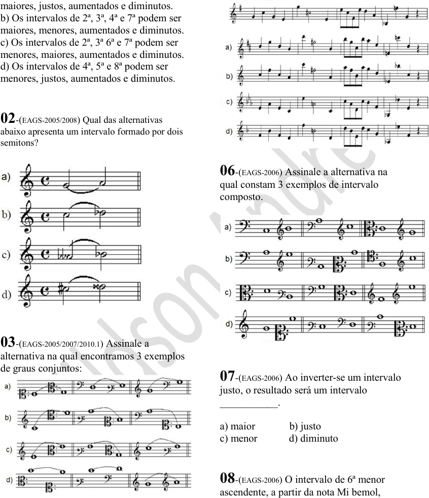 INTERVALOS 01-(EAGS-2005) Assinale a alternativa correta: a) Os intervalos de 4ª, 5ª e 8ª podem ser maiores, justos, aumentados e diminutos. b) Os intervalos de 2ª, 3ª, 4ª e 7ª podem ser maiores, menores, aumentados e diminutos. c) Os intervalos de 2ª, 3ª 6ª e 7ª podem ser menores, maiores, aumentados e diminutos. d) Os intervalos de 4ª, 5ª e 8ª podem ser menores, justos, aumentados e diminutos. 02-(EAGS-2005/2008) Qual das alternativas abaixo apresenta um intervalo formado por dois semitons? 03-(EAGS-2005/2007/2010.1) Assinale a alternativa na qual encontramos 3 exemplos de graus conjuntos: 04-(EAGS-2006) Qual das alternativas abaixo apresenta apenas intervalos consonantes? a) Dó2 ao Ré2 / Fá3 ao Dó3 b) Sol3 ao Dó4 / Mi2 ao Fá2 c) Láb2 ao Mib2 / Fá4 ao Ré4 d) Si5 ao Mi5 / Dó3 ao Si3 05-(EAGS-2006) Qual das alternativas apresenta o trecho abaixo transposto a uma 5ª justa superior? 06-(EAGS-2006) Assinale a alternativa na qual constam 3 exemplos de intervalo composto. 07-(EAGS-2006) Ao inverter-se um intervalo justo, o resultado será um intervalo ___________. a) maior b) justo c) menor d) diminuto 08-(EAGS-2006) O intervalo de 6ª menor ascendente, a partir da nota Mi bemol, completa sua formação com a nota a) Ré. b) Sol. c) Dó bemol. d) Lá bemol. INTERVALOS 09-(EAGS-2006) Em relação aos intervalos formados com as notas naturais, assinale a alternativa correta. a) Todas as 4as, 5as e 8as são justas. b) Todas as 3as, 6as e 7as que contiverem intercalados um dos semitons Mi-Fá ou Si- Dó são maiores; as que contiverem ambos os semitons são menores. c) Os intervalos de 2ª, 4ª e 6ª, quando invertidos, passam a ser 7ª, 5ª e 3ª, respectivamente. d) Os intervalos de 3ª, 5ª e 7ª, quando invertidos, passam a ser 5ª, 3ª e 1ª, respectivamente. 10-(EAGS-2006) Assinale a alternativa correta. a) Intervalo melódico é formado por notas simultâneas. b) Intervalo disjunto é formado por notas não-consecutivas. c) No intervalo descendente, a primeira nota é mais grave do que a segunda. d) Intervalo simples é formado por notas que ultrapassam uma oitava. 11-(EAGS-2007) Observando o trecho musical abaixo, assinale a alternativa que apresenta sua transposição para uma 5ª justa inferior. 12-(EAGS-2007) Assinale a alternativa que apresenta o intervalo existente entre o 5º e o 7º harmônicos da série harmônica ascendente. a) 4ª aumentada b) 4ª diminuta c) 5ª aumentada d) 5ª diminuta 13-(EAGS-2007) Assinale a alternativa que, respectivamente, apresenta a classificação dos intervalos citados abaixo. Sol#4–Dó4; Mib2–Réb3; Lá#4–Dó5; Si1 Fá#1; Dó3–Lá#2. a) 7ª diminuta; 6ª aumentada; 5ª justa; 4ª diminuta; 3ª diminuta b) 6ª aumentada; 7ª diminuta; 6ª aumentada; 4ª justa; 5ª aumentada c) 6ª aumentada; 7ª menor; 3ª diminuta; 5ª justa; 4ª diminuta d) 5ªaumentada ; 7ª menor; 3ª diminuta; 4ª justa; 3ª diminuta 14-(EAGS-2007) Ao analisarmos a extensão das vozes masculinas, verificamos que o intervalo formado entre a nota mais grave do Baixo e a nota mais grave do Tenor é de a) 2ª maior. b) 5ª justa. c) 9ª maior. d) 12ª justa. 15-(EAGS-2008) Assinale a alternativa na qual as notas formam intervalo diatônico ou natural. INTERVALOS 16-(EAGS-2008) Qual das alternativas apresenta as notas citadas abaixo, transportadas a uma 7ª menor superior? Dó3 , Si1 , Mib2 , Lá4 , Si -1 , Ré3 a) Si3, Lá2, Réb2, Sol5, Láb2, Ré b) Sib3, Lá2, Réb3, Sol5, Lá1, Dó4 c) Si3, Lá2, Ré3, Solb5, Láb2, Ré3 d) Sib3, Láb3, Réb3, Sol5, Lá1, Dó4 17-(EAGS-2008) Ao invertermos um intervalo de 3ª maior, obteremos a) 4ª justa. b) 7ª maior. c) 6ª menor. d) 5ª aumentada. 18-(EAGS-2008) Analise os intervalos, relacione a 2ª coluna de acordo com a 1ª e assinale a alternativa que apresenta a sequência correta. Alguns números poderão ser utilizados mais de uma vez, e outros poderão não ser usados. a) 3 – 4 – 1 – 2 – 2 b) 2 – 1 – 4 – 3 – 2 c) 3 – 4 – 1 – 3 – 3 d) 2 – 1 – 4 – 2 – 3 19-(EAGS-2009/1) Assinale a alternativa cujas notas formam os intervalos pedidos abaixo, respectivamente. 20-(EAGS-2008) Relacione os intervalos da coluna da esquerda com a notação da direita e depois marque a sequência correta nas alternativas abaixo. Alguns números poderão ser utilizados mais de uma vez e outros poderão não ser usados. a) 6 – 7 – 7 – 1 – 3 – 2 – 4 – 4 b) 6 – 2 – 2 – 1 – 2 – 7 – 5 – 4 c) 5 – 7 – 7 – 8 – 3 – 2 – 4 – 4 d) 6 – 7 – 2 – 1 – 3 – 2 – 5 – 5 INTERVALOS 21-(EAGS-2009/1) Coloque (V) para verdadeiro e (F) para falso quanto à classificação dos intervalos abaixo, em seguida, assinale a alternativa com a sequência correta. a) F – V – F – V b) F – V - V – V c) V – F – V – F d) V – F – F – F 22-(EAGS-2009/1) Assinale a alternativa que apresenta a inversão dos intervalos abaixo, respectivamente. a) 3ª menor – 2ª Aumentada – 6ª Aumentada – 7ª Maior b) 3ª menor – 2ª Maior – 6ª Aumentada – 7ª Maior c) 3ª Maior – 2ª Maior – 6ª Maior – 7ª menor d) 3ª Maior – 2ª menor – 6ª Maior – 7ª menor 23-(EAGS-2009/1) Assinale a alternativa que contém somente intervalos de segunda. 24-(EAGS-2009/2) Assinale as alternativas cujas notas formam os intervalos pedidos abaixo, respectivamente. 25-(EAGS-2009/2) Relacione a coluna da direita com a da esquerda e assinale a alternativa cuja sequência está correta. Alguns números poderão ser utilizados mais de uma vez, outros poderão não ser usados. a) 6 – 8 – 4 – 1 – 2 – 3 – 5 b) 7 – 5 – 1 – 6 – 3 – 4 – 2 c) 5 – 2 – 3 – 7 – 1 – 8 – 4 d) 2 – 3 – 5 – 4 – 8 – 7 – 6 INTERVALOS 26-(EAGS-2009/2) Relacione a coluna da direita com a da esquerda e assinale a alternativa cuja sequência está correta. Alguns números poderão ser utilizados mais de uma vez, outros poderão não ser usado. a) 1 – 2 – 4 – 5 