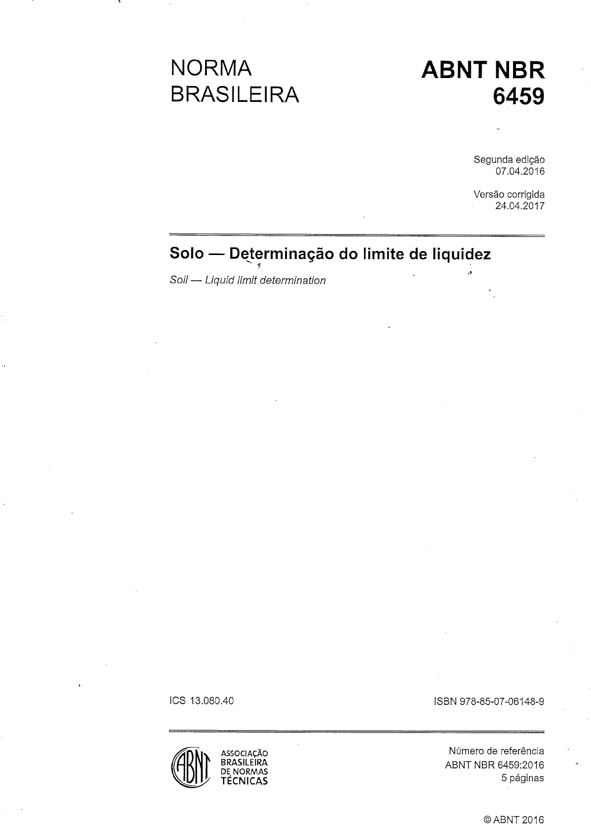 NORMA A B N T NBR BRASILEIRA 6459 Segunda edição 07.04.2016 Versão corrigida 24.04.2017 5010 — Determinação do limite de liquidez 5011 — Liquid limit determination ICS 13.080.40 ISBN 978-85-07-06148-9 ASSOCIAÇÃO Número de referência BRASILEIRA ABNT NBR 6459:2016 DE NORMAS j - , . TÉCNICAS 5 paginas ©ABNT 2016 ABNT NBR 6459:2016 o o o to £ a . I N . . CTl CO CD o -a d) s> CO o o • ç CD CO lÓ LO cg escrito da ABNT. _ ^ ^ ABNT Q Av.Treze de Maio, 13 - 28° andar § 20031-901 - Rio de Janeiro - RJ 2 Tel.: +55'21 3974-2300 §. Fax: + 55 21 3974-2346 « abnt@abnt.org.br www/.abnt.org.br o. E LU ii ©ABNT 2016 - Todos os direitos reservados ABNT NBR 6459:2016 Sumário Página o 00 o o CO CO 0) Q. E O) CO CD o -u '"O 0) CO o o g CD CO trj to I N LO Prefácio • - iv 1 Escopo , ....1 2 Referência normativa 1 3 Apareliiagem... , 1 4 Execução do ensaio..... ..,....„ ..3 4.1 Preparação da amostra...,. ............3 4.2 Amostra preparada com secagem prévia ..3 4.3 Amostra preparada sem secagem prévia .......4 4.4 Cálculo. 1.1....... ;, ..5 5 Expressão dos resultados. • ................5 Figuras Figura 1 - Aparelho para determinação do limite de liquidez.. .......2 Figura 2 - Cinzel .—. •2 Figura 3 - Calibração da altura de queda .........3 Figura 4 - Aspecto da ranhura... .4 'to _2 o o to 3 C53 D . Q. E d! X UJ © ABNT 2016 - Todos os direitos resen/ados iii ABNT NBR 6459:2016 Prefácio A Associação Brasileira de Normas Técnicas (ABNT) é o Foro Nacional de Normalização. As Normas Brasileiras, cujo conteúdo é de responsabilidade dos Comités Brasileiros (ABNT/CB), dos Organismos de Normalização Setorial (ABNT/ONS) e das Comissões de Estudo Especiais (ABNT/CEE), são elaboradas por Comissões de Estudo (CE), formadas pelas partes interessadas no tema objeto da normalização. Os Documentos Técnicos ABNT são elaborados conforme as regras da Diretiva ABNT, Parte 2. A ABNT chama a atenção para que, apesar de ter sido solicitada manifestação sobre eventuais direitos de patentes durante a Consulta N,acional, estes podem ocorrer e devem ser comunicados àABNT a qualquer momento (Lei n° 9.279, de 14 de maio de 1996). Ressalta-se que Normas Brasileiras podem ser objeto de citação em Regulamentos Técnicos. Nestes casos, os Órgãos responsáveis pelos Regulamentos Técnicos podem determinar outras datas para exigência dos requisitos desta Norma. A ABNT NBR 6459 foi elaborada no Comité Brasileiro de Construção Civil (ABNT/CB-002), pela Comissão de Estudo de Identificação e Compactação de Solos (CE-002:004.002). Esta Norma teve seu conteúdo técnico confirmado e adequado à Diretiva ABNT, Parte 2:2011, pela Comissão de Estudo Especial de Solos (ABNT/CEE-221). O séu Projeto de adequação circulou em Consulta Nacional conforme Edital n° 02, de 26.02.2016 a 26.03.2016. Esta segunda edição cancela e substitui a edição anterior (ABNT NBR 6459:1984), sem mudanças técnicas. Esta versão corrigida da ABNT NBR 6459:2016 incorpora a Errata 1, de 24.04.2017. O Escopo em inglês desta Norma Brasileira é o seguinte: Scope This Standard specifies the method for determination ofthe liquid limit ofsoiis. iv ©ABNT 2016 - Todos os direitos resen/ados NORMA BRASILEIRA ABNT NBR 6459:2016 Solo — Determinação do limite de liquidez 1 Escopo Esta Norma especifica o método para a determinação do limite de liquidez dos solos. 2 Referência normativa O documento relacionado a seguir é iadispensável à aplicação deste documento. Para referências datadas, aplicam-se somente as edições citadas. Para referências não datadas, aplicam-se as edições mais recentes do referido documento (incluindo emendas). ABNT NBR 6457, Amostras de solo - Preparação para ensaios de compactação e ensaios de caracterização 3 Aparelhagem 3.1 A aparelhagem ou dispositivo com o qual se executa o ensaio é a seguinte: a) estufa capaz de manter a temperatura de 60 °C a 65 °C e 105 °C a 110 °C; b) cápsula de porcelana com aproximadamente 120 mm de diâmetro; c) espátula de lâmina flexível com aproximadamente 80 mm de comprimento e 20 mm de largura; d) aparelho com as características e dimensões indicadas na Figura 1; e) -cinzel com as características e dimensões indicadas na Figura 2; f) recipientes adequados que evitem a perda de umidade da amostra, como pares de vidros côncavos com grampo; g) balança que permita pesar nominalmente 200 g, com resolução de 0,01 g e sensibilidade compatível; h) gabarito para verificação da altura de queda de concha; i) esfera de aço com 8 mm de diâmetro. © ABNT 2016 - Todos os direitos reservados 1 ABNT NBR 6459:2016 Dimensões em milímetros a) Vista em planta pés de borracha Diâmetro 13 b) Vista ÍFrontal c) Vista lateral Figura 1 - Aparelho para determinação do limite de liquidez Dimensões em milímetros a) Vista em planta b) SeçÕes Figura 2 - Cinzel 3.2 Inspecionar o aparelho de ensaio e verificar se: a) o pino que conecta a concha está firme, não permitindo deslocamento lateral; b) os parafusos que conectam essa concha estão apertados; c) os pontos de contato, tanto da base como da concha, não estão gastos pelo uso; ©ABNT 2016 - Todos os direitos reservados ABNT NBR 6459:2016 d) a concha não apresenta ranhuras, perceptíveis ao tato; e) o cinzel está em perfeito estado. 3.3 Ajustar o aparelho de modo que o ponto de contato da concha com a base esteja 10 mm acima da base, quando aquela estiver no ponto mais alto do seu curso, utilizando-se para tal um gabarito, como se mostra na Figura 3. Após o ajuste e o aperto dos parafusos, testar o ajuste girando rapidamente a manivela várias vezes e verificar novamente a altura de queda da concha. 3.4 Verificar as características da base de ebonite do aparelho, deixando cair a esfera de aço com 8 mm de diâmetro em queda livre de uma altura de 250 mm sobre a superfície desta, devendo a altura de restituição ficar compreendida entre 185 mm e 230 