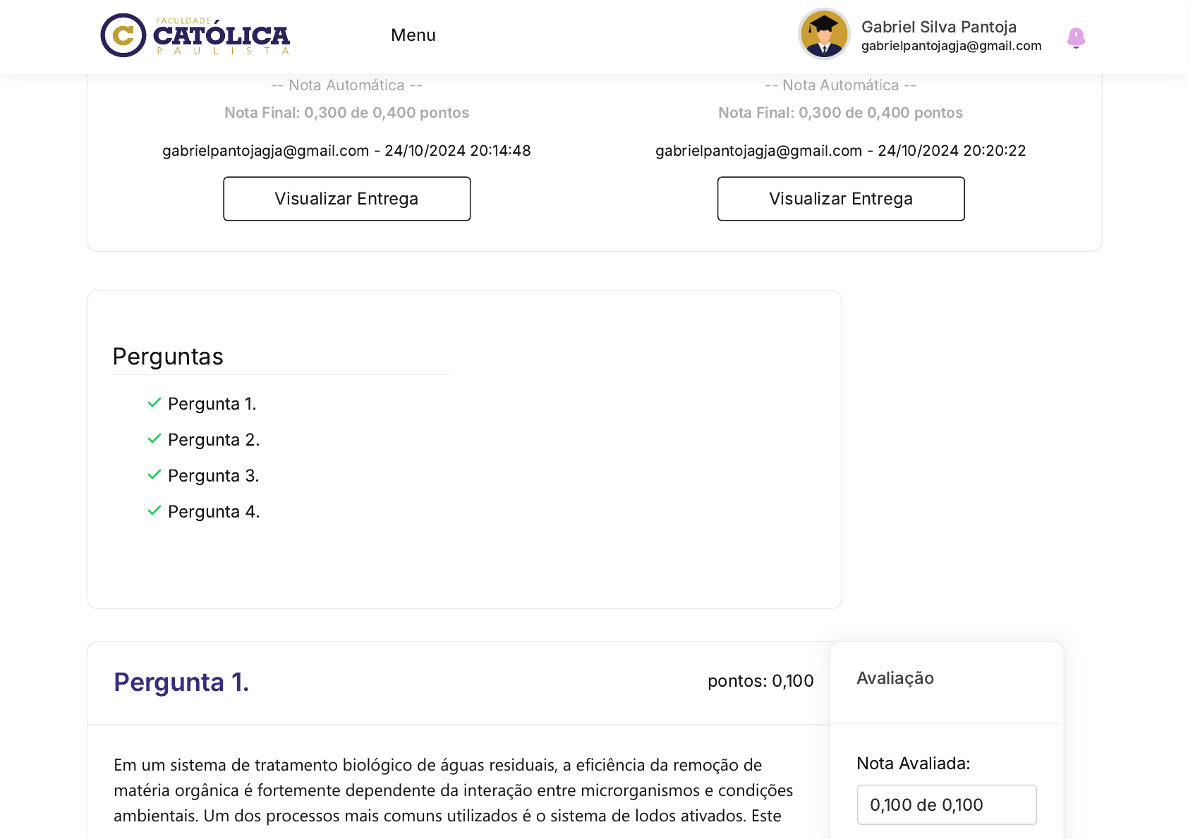 Primeira Tentativa DEB13AFD�6245�F19D�39CE�B2D2240ED7E9 -- Nota Automática -- Nota Final: 0,300 de 0,400 pontos gabrielpantojagja@gmail.com - 24/10/2024 20�14�48 Visualizar Entrega Segunda Tentativa 0BB64E7D�3BC2�2295�A1D1�DFD90956A6B3 -- Nota Automática -- Nota Final: 0,300 de 0,400 pontos gabrielpantojagja@gmail.com - 24/10/2024 20�20�22 Visualizar Entrega Perguntas Pergunta 1. Pergunta 2. Pergunta 3. Pergunta 4. pontos: 0,100Pergunta 1. Em um sistema de tratamento biológico de águas residuais, a eficiência da remoção de matéria orgânica é fortemente dependente da interação entre microrganismos e condições ambientais. Um dos processos mais comuns utilizados é o sistema de lodos ativados. Este Avaliação Nota Avaliada: 0,100 de 0,100 Menu Gabriel Silva Pantoja gabrielpantojagja@gmail.com javascript:void(0); javascript:void(0) javascript:void(0) processo é baseado na aeração de uma mistura de água residual e lodo biológico, o que promove a oxidação da matéria orgânica pelos microrganismos presentes no lodo. No entanto, a operação deste sistema pode ser afetada por diversos fatores, incluindo a carga de poluentes, a taxa de aeração e o tempo de retenção. Para garantir um tratamento eficaz, é essencial compreender como esses fatores influenciam o desempenho do sistema. Com base no descrito, assinale a alternativa que corretamente identifica um dos principais objetivos da aeração no processo de lodos ativados: Múltipla Escolha: A�� Oxigenar a água para a multiplicação de microrganismos aeróbicos. B�� Reduzir a turbidez da água residual. C�� Aumentar a quantidade de sólidos em suspensão na água residual. D�� Eliminar o odor gerado durante o processo de tratamento. E�� Promover a degradação anaeróbica da matéria orgânica. pontos: 0,100Pergunta 2. Uma indústria têxtil localizada em uma região com alta concentração de fábricas tem gerado uma quantidade significativa de águas residuais durante o processo de tingimento e acabamento dos tecidos. Essas águas residuais são caracterizadas por uma alta carga de Observação: Avaliação Nota Avaliada: 0,100 de 0,100 Menu Gabriel Silva Pantoja gabrielpantojagja@gmail.com javascript:void(0); javascript:void(0) javascript:void(0) contaminantes orgânicos e corantes sintéticos. O monitoramento da qualidade das águas residuais é essencial para garantir que os efluentes tratados atendam aos padrões ambientais estabelecidos. Considerando os principais parâmetros de qualidade que devem ser avaliados em águas residuais industriais, qual dos seguintes parâmetros é mais adequado para indicar a presença de matéria orgânica dissolvida que pode impactar a qualidade da água? Múltipla Escolha: A�� Concentração de Amônia - Mede a quantidade de amônia presente nas águas residuais, que pode indicar poluição nitrogenada. B�� Demanda Bioquímica de Oxigênio (DBO) - Este parâmetro quantifica a quantidade de oxigênio requerida por microorganismos para decompor a matéria orgânica presente na água em condições aeróbicas durante um período específico. C�� Demanda Química de Oxigênio (DQO) - Este parâmetro mede a quantidade total de oxigênio necessária para oxidar a matéria orgânica e alguns inorgânicos presentes na água, fornecendo uma indicação geral da carga orgânica. D�� pH - Mede a acidez ou alcalinidade da água, que pode afetar os processos biológicos e químicos na água. E�� Sólidos Totais Suspensos (STS) - Refere-se à quantidade de sólidos presentes na água que permanecem suspensos e podem causar turbidez. Observação: Menu Gabriel Silva Pantoja gabrielpantojagja@gmail.com javascript:void(0); javascript:void(0) javascript:void(0) pontos: 0,100Pergunta 3. Durante a operação de um sistema de tratamento biológico de águas residuais, a remoção de nutrientes, especialmente nitrogênio e fósforo, é uma parte crucial para evitar a eutrofização em corpos d'água receptores. Em um processo biológico específico, a nitrificação e desnitrificação são etapas fundamentais para a remoção de nitrogênio. Em uma planta de tratamento que enfrenta problemas com a remoção eficaz de nitrogênio, a equipe decide aplicar um processo que envolve a oxidação do amoníaco para nitrito e, posteriormente, a redução do nitrito a nitrogênio gasoso. Qual processo biológico descrito é mais eficaz para a remoção de nitrogênio nesse contexto? Múltipla Escolha: A�� Reator de lodo ativado anaeróbio: Efetivo na remoção de matéria orgânica, mas não na remoção de nitrogênio por nitrificação e desnitrificação. B�� Sistema de filtro de areia: Focado na remoção de sólidos e turbidez, não especializado na remoção de nitrogênio. C�� Processo de lodos ativados com nitrificação e desnitrificação: Inclui etapas de oxidação do amoníaco e redução do nitrito para nitrogênio gasoso. D�� Processo de lagoas facultativas: Utiliza a ação de microorganismos aeróbios e anaeróbios em lagoas, mas é menos eficaz na remoção específica de nitrogênio. Avaliação Nota Avaliada: Observação: 0,100 de 0,100 Menu Gabriel Silva Pantoja gabrielpantojagja@gmail.com javascript:void(0); javascript:void(0) javascript:void(0) E�� Sistema de compostagem: Destinado à degradação de resíduos sólidos orgânicos, não aplicável diretamente à remoção de nitrogênio em águas residuais. pontos: 0,100Pergunta 4. Uma fábrica de produtos químicos produz grandes volumes de águas residuais industriais contendo altas concentrações de compostos orgânicos tóxicos. A empresa está buscando métodos eficientes para tratar essas águas antes de seu descarte. A escolha do processo de tratamento é crucial para garantir a conformidade com as normas ambientais e minimizar o impacto ambiental. Considerando os processos de tratamento físico-químico, qual das seguintes técnicas é a mais i