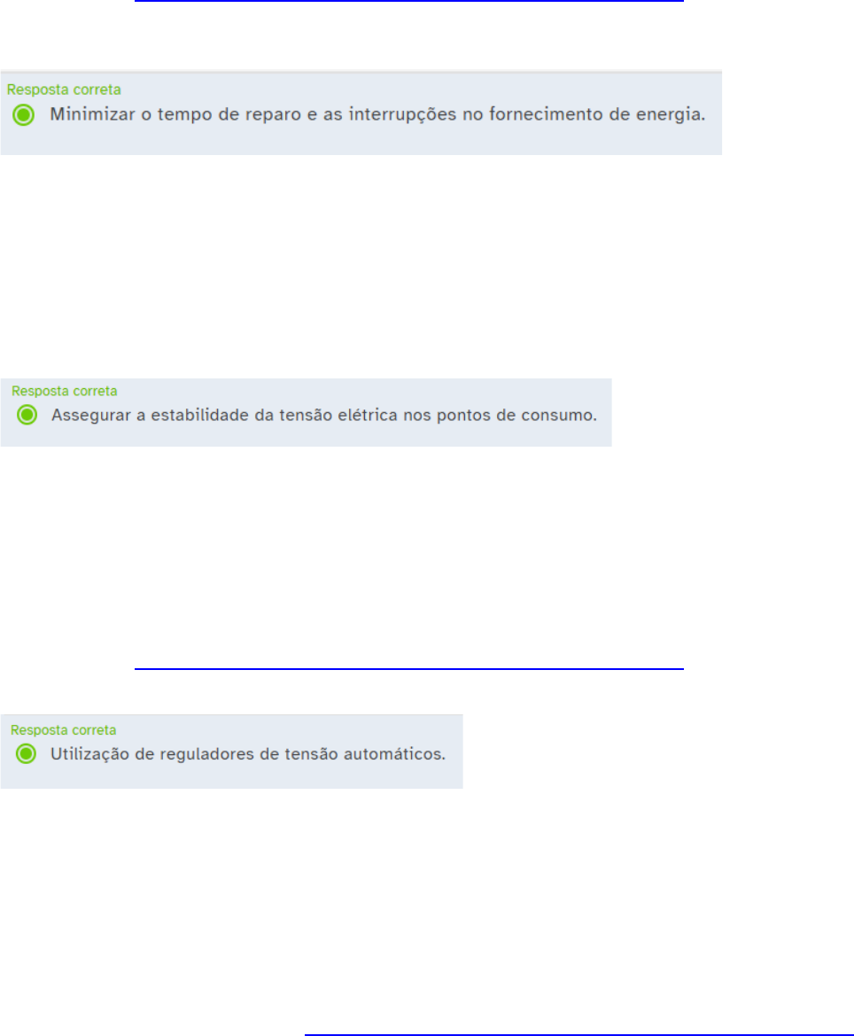 1 - Leia o excerto a seguir. A manutenção preventiva em sistemas de distribuição de energia (SDE) é fundamental para garantir o bom funcionamento e a confiabilidade do sistema. Por meio de inspeções regulares e ações programadas, é possível identificar e corrigir possíveis problemas antes que se tornem falhas graves. Dessa forma, a manutenção preventiva contribui para reduzir interrupções no fornecimento de energia, minimizar o tempo de reparo e aumentar a vida útil dos equipamentos (OLIVEIRA et al., 1996). OLIVEIRA, C.; SCHMIDT, H.; KAGAN, N.; ROBBA, E. Introdução a sistemas elétricos de potência: componentes simétricos. 2. ed. São Paulo: Edgard Blucher, 1996. Disponível em: https://integrada.minhabiblioteca.com.br/books/9788521217824. Acesso em: 02 jun. 2023. Considerando as informações do texto, qual é o objetivo principal da manutenção preventiva em sistemas de distribuição de energia (SDE)? 2 - O controle de tensão no Sistema de Distribuição de Baixa Tensão (SDBT) é de extrema importância para garantir o fornecimento de energia elétrica de forma segura e eficiente aos consumidores. O SDBT compreende a etapa final do processo de distribuição de energia elétrica, sendo responsável por levar a energia aos pontos de consumo, como residências, comércios e indústrias. Diversos equipamentos e técnicas são utilizados para manter a tensão em níveis adequados e estáveis, evitando oscilações prejudiciais ao funcionamento dos aparelhos elétricos e eletrônicos. Nesse contexto, analise as alternativas a seguir e identifique qual é o objetivo principal do controle de tensão no Sistema de Distribuição de Baixa Tensão (SDBT): 3 - Leia o excerto a seguir. O Sistema de Distribuição de Média Tensão (SDMT) é responsável por fornecer eletricidade a consumidores industriais e comerciais. No entanto, a variação de tensão pode causar problemas aos equipamentos elétricos. Portanto, é essencial que sejam adotadas medidas para controlar a tensão no SDMT, garantindo uma distribuição elétrica adequada e segura (OLIVEIRA et al., 1996). OLIVEIRA, C.; SCHMIDT, H.; KAGAN, N.; ROBBA, E. Introdução a sistemas elétricos de potência: componentes simétricos. 2. ed. São Paulo: Edgard Blucher, 1996. Disponível em: https://integrada.minhabiblioteca.com.br/books/9788521217824. Acesso em: 01 jun. 2023. Considerando as informações do texto, qual é uma medida eficaz para o controle de tensão no SDMT? 4 - Leia o trecho a seguir. A operação dos SDE envolve uma série de atividades que garantem a entrega contínua e confiável de energia elétrica aos consumidores. Isso inclui o monitoramento constante do sistema para identificar e corrigir quaisquer problemas que possam surgir, como interrupções, flutuações de tensão e sobrecargas. Além disso, a operação adequada dos SDE também envolve o gerenciamento da demanda de energia para evitar sobrecargas no sistema e garantir um fornecimento equilibrado de energia (GEDRA et al., 2014). GEDRA, R.; BARROS, B.; BORELLI, R. Geração, transmissão, distribuição e consumo de energia elétrica. São Paulo: Érica, 2014. Disponível em: https://integrada.minhabiblioteca.com.br/books/9788536532493. Acesso em: 02 jun. 2023. Com base no apresentado, analise as asserções a seguir e a relação proposta entre elas: I. O monitoramento constante do sistema é uma atividade envolvida na operação dos SDE, visando identificar e corrigir problemas como interrupções, flutuações de tensão e sobrecargas. PORQUE https://integrada.minhabiblioteca.com.br/books/9788521217824 https://integrada.minhabiblioteca.com.br/books/9788521217824 https://integrada.minhabiblioteca.com.br/books/9788536532493 II. O fornecimento equilibrado de energia é garantido através do gerenciamento da demanda de energia na operação adequada dos SDE. A respeito dessas asserções, assinale a opção correta: 5 - Leia o excerto a seguir. O controle de tensão no Sistema de Distribuição de Alta Tensão (SDAT) é essencial para garantir o correto funcionamento e segurança do sistema elétrico. O SDAT é responsável por transmitir a energia elétrica gerada nas usinas até os consumidores finais, por meio de subestações e linhas de transmissão de alta tensão. Nesse contexto, o controle de tensão é fundamental para evitar sobretensões e subtensões que possam danificar equipamentos e comprometer a qualidade da energia fornecida (FELBER, 2010). FELBER, L. A. Regulação de tensão em subestações de distribuição de energia elétrica. Dissertação (Mestrado em Engenharia Elétrica) - Universidade Federal de Itajubá, Itajubá/MG, 2010. Disponível em: https://repositorio.unifei.edu.br/jspui/bitstream/123456789/1522/1/dissertacao_0036434.pdf. Acesso em: 02 jun. 2023. O controle de tensão no Sistema de Distribuição de Alta Tensão (SDAT) é uma medida importante para garantir o bom funcionamento do sistema elétrico. Com base no excerto apresentado, avalie as afirmações a seguir: I. A utilização de transformadores de potência é uma das estratégias para controlar a tensão no SDAT. Esses dispositivos permitem elevar ou reduzir a tensão, de acordo com a necessidade do sistema. II. A regulação da tensão é realizada por meio de reguladores de tensão automáticos (AVRs), que ajustam a relação entre a tensão de entrada e a tensão de saída nos transformadores, mantendo-a dentro dos limites aceitáveis. III. O controle de tensão no SDAT é realizado e executado exclusivamente pela concessionária de energia elétrica, tornando os consumidores incapazes de interferir ativamente nesse processo. IV. Os compensadores estáticos de reativos (SVCs) são dispositivos utilizados para controlar a tensão no SDAT, atuando no fluxo de reativos e auxiliando na estabilização do sistema elétrico. É correto o que se afirma em: 6 - O Sistema de Distribuição de Alta Tensão (SDAT) é responsável por fornecer eletricidade