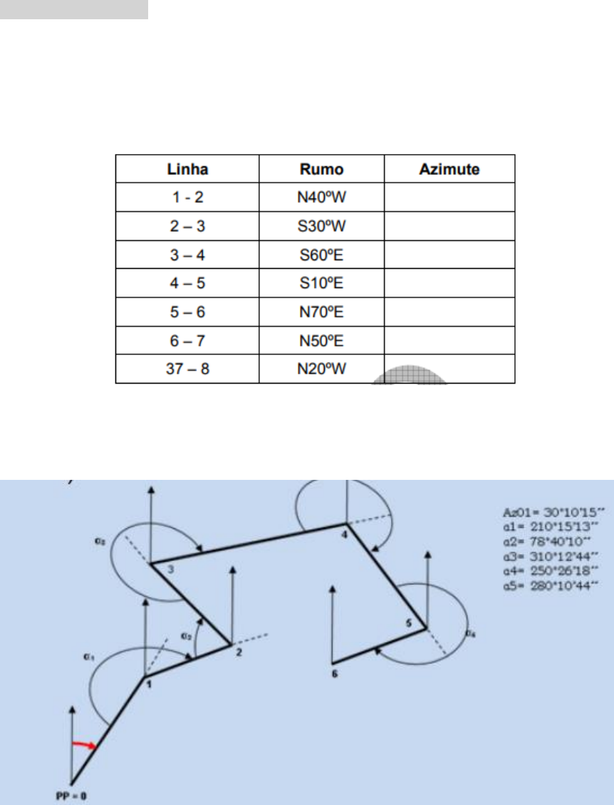 UNIVERSIDADE TECNOLÓGICA FEDERAL DO PARANÁ Engenharia Civil – Campus Toledo Disciplina de Topografia – Prof. Patrícia Casarotto de Oliveira Lista de exercícios (elaborado por aluno monitor) MEDIDAS DE DIREÇÕES 1. Determine o rumo e a direção correspondente ao azimute de 156°10'37". 2. Dados os rumos das linhas mostrados na tabela abaixo, calcular os azimutes correspondentes. 3. Calcule os azimutes em função dos ângulos horizontais medidos no sentido horário. 4. Calcule os ângulos internos das figuras apresentadas. 5. Completar todas as células da tabela abaixo e faça esquemas de cada alinhamento indicando os ângulos fornecidos, conforme exemplo. Linha Rumo Azimute Vante Ré Vante Ré A-B 332°21’ B-C N10°28’ . 6. Calcular o rumo verdadeiro de A para B, sabendo que o rumo magnético é N32°00’W e a declinação magnética na data da leitura foi de 2°36’W (obs: você precisam fazer o mesmo para a poligonal, consultando a declinação magnética pelo site indicado nos slides. Neste exercício a declinação é fornecida). 7. Sabe-se que o ângulo 1-2-3 é reto, com vértice no ponto 2. Num projeto realizado em 1/11/1960, consta que o rumo magnético de 1-2 era de S68°10’E. Em 01/09/1987 mediu-se o rumo magnético de 2-3, resultando em N23°31E. Calcular a variação anual de declinação magnética, no período.