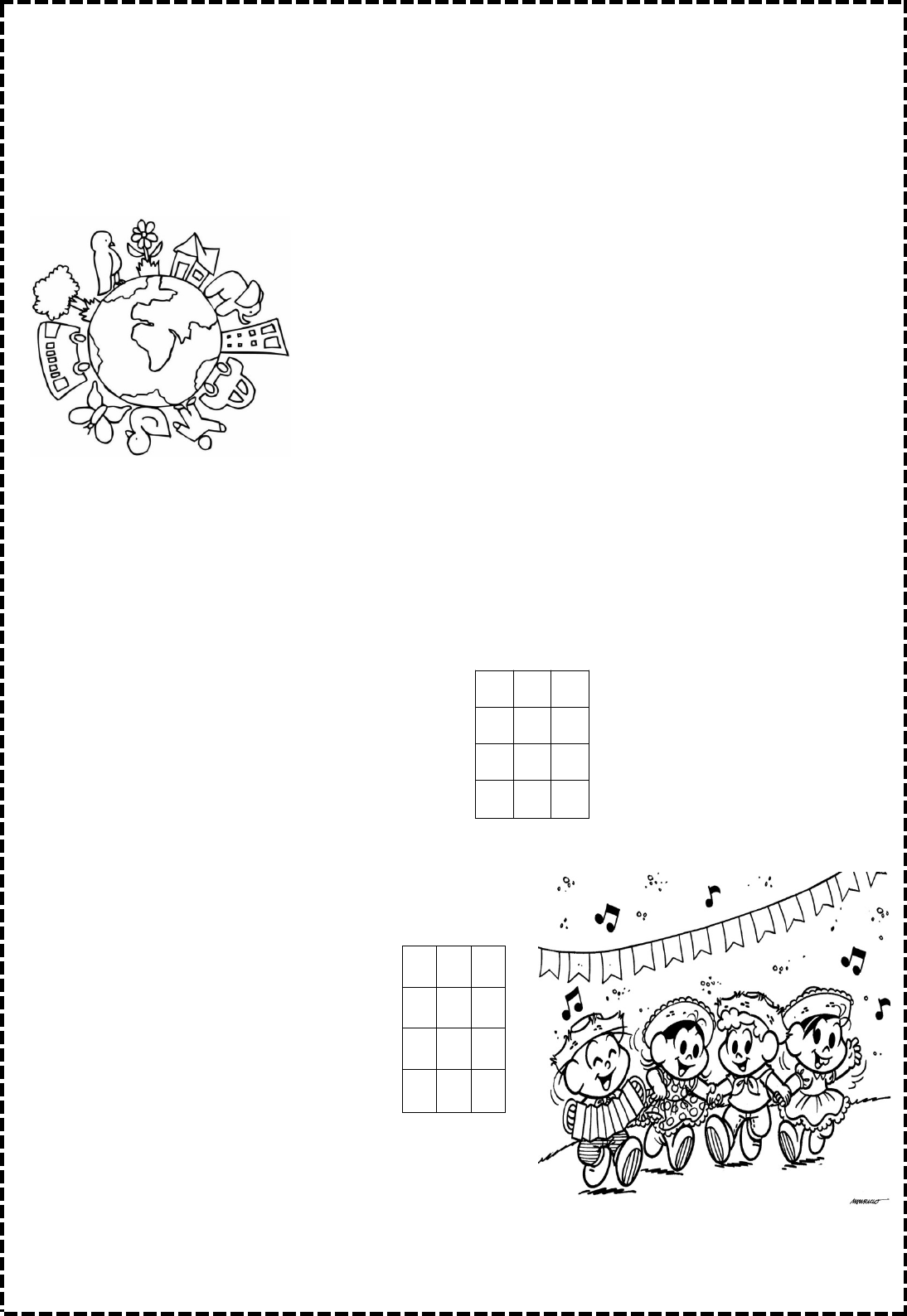 Escola Estadual Dr. Ermírio Leal Garcia Paranaíba, ______ de ____________________ de __________. Nome: _____________________________________________________________ Nº: ____ Professora: Renata Queiroz – Série: 4º Ano A Integral Valor Esperado: 10,0 (Dez) Valor Alcançado: _____________________ AVALIAÇÃO BIMESTRAL MATEMÁTICA 05 de Junho dia do MEIO AMBIENTE “Meio Ambiente é tudo o que tem a ver com a vida de um ser ou de um grupo de seres vivos¨.Tudo o que tem a ver com a vida, sua manutenção e reprodução. Infelizmente nosso planeta é afetado por vários problemas ambientais, muitos deles provocados por diversas ações humanas. Estes problemas afetam a fauna, flora, solo, águas, ar e etc. Ter consciência ambiental é fundamental para o futuro do planeta. Vários procedimentos podem ser tomados por pessoas, governos e empresas para não prejudicar a fauna, a flora e os recursos naturais disponíveis em nosso planeta. · Nesse mês do Meio Ambiente vamos fazer tudo com muita atenção: resolver os probleminhas, não jogar lixo no chão para ser um bom cidadão! 1) Bianca Alves e Aliquis são amigos do planeta! Eles arrumaram a sala de aula e cataram os papéis do chão. Bianca Alves jogou 328 pedaços de papel no lixo e Aliquis 539. Quanto papel Bianca Alves pegou a menos? (0,5) C D U (A) 267 papéis. (C) 211 papéis. (B) 212 papéis. (D) 217 papéis. 2) Oba! Vai ter Festa Junina na Escola! Vou ler e calcular direito para aproveitar todos os momentos! C D U a) Na festa junina da Escola Dr. Ermírio 350 alunos vão dançar a tradicional quadrilha, sendo que 186 são meninas. Quantos são os meninos? (0,5) (A) 167 papéis. (C) 111 papéis. (B) 112 papéis. (D) 164 papéis. R: _______________________________ b) Para enfeitar as barracas da Escola Ermírio, os alunos fizeram 246 bandeirinhas amarelas, 381 vermelhas, 186 azuis e 205 verdes. Quantas bandeirinhas confeccionaram ao todo? (0,5) (A) 1.167 papéis. (C) 1.018 papéis. (B) 1.112 papéis. (D) 1.164 papéis. R: _____________________________________________________ c) Um convite para a entrada no arraial custa 32 reais. Quanto pagará 6 pessoas? (0,5) C D U (A) 167 reais. (C) 192 reais. (B) 112 reais. (D) 164 reais. R:_____________________________________ d) Estão sendo feitos 36 pastéis para serem divididos entre 6 crianças. Quantos pastéis cada criança receberão? (0,5) (A) 6 pastéis. (C) 2 pastéis. (B) 12 pastéis. (D) 4 pastéis. R: ________________________________________________ ( a ) )3) - Olha!!! Quanta coisa gostosa terá nesse Arraiá!!!!! Foram feitos 239 pé-de-moleque e... (0,5) a) O dobro de cachorro-quente = ________ (A) 478 de cachorro-quente. (B) 492 de cachorro-quente. (C) 512 de cachorro-quente (D) 564 de cachorro-quente. ( b) ) b) O triplo de saquinhos de pipoca = ________ (0,5) (A) 767 de pipocas. (C) 792 de pipocas. (B) 712 de pipocas. (D) 717 de pipocas. ( c) ) c) O quádruplo de copinhos de canjica = _________(0,5) (A) 671 de copinhos de canjica. (B) 592 de copinhos de canjica. (B) 957 de copinhos de canjica. (D) 956 de copinhos de canjica. ( d) ) d) O quíntuplo de pastéis = _________ (0,5) (A) 1.167 pasteis. (B) 1.192 pasteis. (C) 1.112 pasteis. (D) 1.195 pasteis. 6) Escreva o valor relativo (V.R) e o valor absoluto (V.A) de cada algarismo negritado: (0,5) ( (A) VR – 700 – 8 , VA 7 – 70 (B) VR – 700 – 8 , VA 7 – 8 (C ) VR – 70 – 80, VA 7 – 80 (D) VR – 700 – 8 , VA 700 – 8 )717 V.R.: ________ V.A.: ________ 478 V.R.: ________ V.A.: ________ 7) Observe o gráfico abaixo e marque um (V) para verdadeiro e (F) para falso: (0,5) ( ( ) A quantidade de pastéis é a maior. ( ) Tem mais cachorros-quentes do que pipoca. ( ) O total de pipoca e canjica é o mesmo. ( ) A quantidade de copinhos de canjica é maior que a de saquinhos de pipoca. ( ) Tem menos cachorro-quente do que pastéis. (A) V – F – F – V – V. (C) F – V –V – F – V. (B) V – F – V – V – V. (D) F – F - V – V – V. ) 8) A festa no Arraial será bem organizada. Todos deverão chegar no horário para que a festa termine na hora certa. Observe os relógios e escreva a hora do início e do término da festa. ( (A) 4 hrs ou 16 hrs / 9 hrs ou 21 hrs . (B) 3 hrs ou 16 hrs / 8 hrs ou 20 hrs . (C) 4 hrs ou 16 hrs / 21 hrs ou 10 hrs . (D) 4 hrs ou 16 hrs / 21 hrs ou 7 hrs ) (0,5) Início Término 9) Observe o relógio abaixo e marque a alternativa que corresponde a hora que ele indica. Será que ainda está tendo a grandiosa festa da Escola Ermírio!!!! (0,5) (A) 10 horas e 2 minutos (B) 2 horas e 50 minutos (C)2 horas e 10 minutos (D) 10 horas e 10 minutos 21:15 21:35 Inicio da dança. Término da dança 11) 4º ano A Integral terá “Aprender”, o horário da apresentação que foi definido como mostram os quadros abaixo: (0,5) Essa dança tem a duração de: (A) 10 minutos. (B) 15 minutos. (C) 20 minutos. (D) 30 minutos. 12) Para ir para a festa na Escola Dr. Ermírio, Carlos Fernando leva uma hora e meia. Essa caminhada dura: (0,5) (A) 60 minutos. (B) 90 minutos. (C) 30 minutos. (D) 15 minutos. 13) A festa da Escola Dr. Ermírio foi um sucesso, conseguimos arrecadar 1.960 reais. Esse número é composto por: (0,5) (A) 1 unidade de milhar, 9 dezenas e 6 unidades. (B) 1 unidade de milhar, 9 centenas e 6 dezenas. (C) 1 unidade de milhar, 60 unidades. (D) 1 unidade de milhar, 90 unidades. 14) Bianca Rosa e suas amigas desenharam algumas figuras geométricas, para colocar enfeitar a escola para a grande festança. Veja o que cada uma desenhou. Quem fez o desenho de um retângulo? (0,5) Bianca Rosa Giselly Laura Maria Clara (A) Bianca Rosa. (B) Giselly. (C) Laura. (D) Maria Clara. 15) Cauã Rosa usou linhas retas fechadas para fazer um desenho: Quantas figuras de quatro lados foram desenhadas? (0,5) (A) 2 (B) 3 (C) 4 (D) 5 · Ufa! Final de festa! Então vamos colaborar com a preservação do meio ambiente e fazer uma bela limpeza, assim contribuiremos para um futuro melhor e um planeta mais