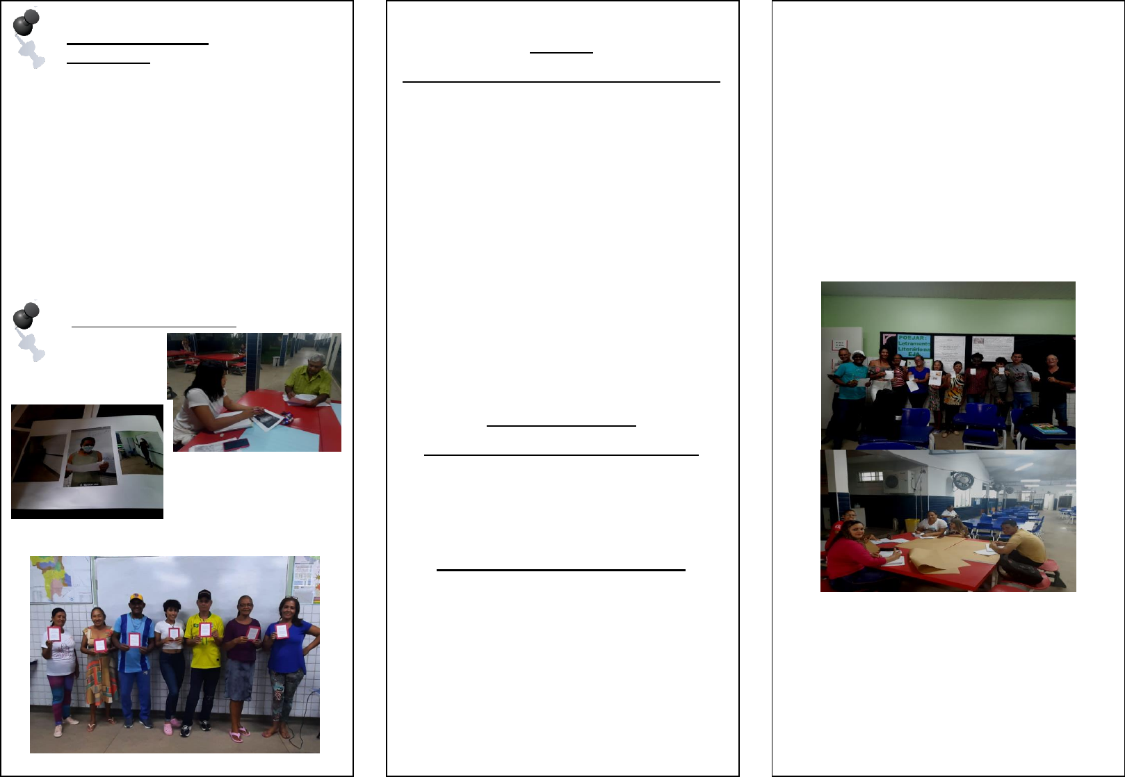 \ 19h30min – Abertura: - Gestão - Smec - Professores - Alunos 19h50min – Apresentação dos trabalhos 20h30 – Momento Cultural - Dramatização do poema: Retrato 20h45 - Exposição dos trabalhos 21h - Encerramento EQUIPE ADMINISTRATIVA E PEDAGÓGICA/FCM Olindina Guimarães Lima Gestora Escolar Maria Jucileide Santos Oliveira Vice-gestora Marili Gomes de Souza Ana Fernanda Silva Araújo Coordenadores Pedagógicos Alexuany Thaynara Parente Pimentel Secretária EQUIPE DOCENTE TURMA 1ª e 2ª – SÉRIES “U”- EJA PROFESSORA MISIARA SANTOS TURMA 3ª E 4ª – SÉRIE U - EJA PROFESSOR SEBASTIANA PEDROSO SECRETARIA MUNICIPAL DE EDUCAÇÃO E CULTURA - SMEC ESCOLA MUNICIPAL FRANCISCO CÁSSIO DE MORAES MOSTRA PEDAGÓGICA EJA – 2022.1 POEJAR – LETRAMENTO LITERÁRIO NA EJA Viajando no mundo de Cecília Meireles e Cora Coralina. TURMAS: 1ª A 4º SÉRIES BOA VISTA/RR 2022 PROGRAMAÇÃO: 08/07/2022 GALERIA DE FOTOS O QUE É POEJAR? Poejar é o projeto que nasceu da dificuldade identificada ao trabalhar a interpretação do gênero textual poemas e poesias com os alunos da Educação de Jovens e Adultos da Escola Municipal Francisco Cassio de Moraes. É a união entre as palavras “Poema” e “Eja”. Dessa forma, a possibilidade de letramento pelos poemas surgiu como forma de constituir uma prática significativa para a construção e ampliação do universo da leitura, da interpretação, não apenas dos significados, mas para a inserção de temas do contexto no qual o aluno faz parte. ➢ Viajando no Mundo de Cecília Meireles e Cora Coralina As poetisas escolhidas narram em versos todas as dificuldades pelos quais passaram em vida. As perdas familiares de Cecília também são as perdas que muitos alunos da Eja enfrentam ao longo da vida, e o que dizer de Cora Coralina a mulher que estudou apenas até a terceira série dos anos iniciais e criou versos preciosos e que começou a publicar os seus trabalhos aos 75 anos e ensina que nunca é tarde para iniciar ou recomeçar algo novo. Assim, o projeto oportuniza aos alunos a construção de sentidos, além da leitura, como forma de diálogo entre suas realidades por meio da reflexão dos poemas das artistas. Objetivo Geral: Estimular a oralidade, a produção escrita, a leitura e o contato com a linguagem poética nas obras de Cecília Meireles e Cora Coralina como manifestação da arte, do uso dos sentimentos, das experiências de vida e da subjetividade. Objetivos Específicos: • Conhecer a biografia de Cecília Meireles e Cora Coralina e distinguir seus diferentes temas literários dentro das poesias; • Participar de diferentes situações de comunicação oral e escrita, como a declamação em rodas de leitura, das rodas compartilhadas e momentos literários dentro da escola; • Compreender e identificar as estruturas de poemas e sua articulação com os versos, as estrofes e as rimas, as combinações de palavras, a linguagem conotativa, denotativa e as principais figuras de linguagem; • Saber atribuir significado, começando a identificar elementos possivelmente relevantes segundo os propósitos e intenções dos poetas. Resultados alcançados: Os alunos da EJA da Escola Municipal Francisco Cássio de Moraes conseguiram compreender que os poemas são portadores de textos carregados de sentimentos e subjetividades, com estruturas próprias e que dialogam com elementos presentes no dia a dia de muitas pessoas como amor, tristeza, admiração, reflexão, crítica. E que nem sempre será possível compreender de imediato o sentido que o artista quis expressar, pela forma como utiliza as palavras em determinadas situações e que saber reconhecê-las demanda tempo, prática de leitura e contato gradativo e contínuo. Considerações Finais: Por meio da realização deste projeto pode-se considerar que a possibilidade de letramento pelos poemas constituiu uma prática significativa para a construção e ampliação do universo da leitura e da produção escrita tornando o aluno protagonista em seu processo de letramento. Houve dificuldades inicialmente pelo fato de o gênero poético estar distante da realidade dos alunos, mas que pouco a pouco foram sendo possibilitados a partir de poemas selecionados, levando em consideração as peculiaridades dos alunos da EJA. Um aspecto salutar é ter observado que a letramento literário por poemas teve o poder de reverter boa parte das mazelas das quais os alunos vivenciam diariamente, por se tratar de um gênero textual carregado de inúmeros temas que circulam no meio social e que resgatam emoções e sentimentos. E, portanto, promove uma aprendizagem viva, ativa e significativa.