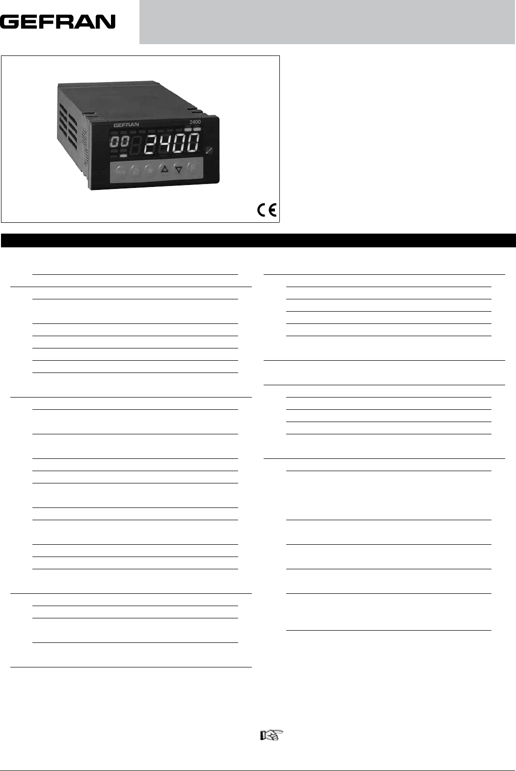 180290F_MHW_2400_02-2013_POR 2400 INDICADOR / UNIDADE DE ALARME RÁPIDA Versão de Software 1.6x Código 80290F / Edição 10 - 02/2013 POR INSTRUÇÕES DE UTILIZAÇÃO E ADVERTENCIAS ÍNDICE GERAL página Simbologia gráfica adotada 2 1 Instruções preliminares 2 Descrição geral 2 Indicador / Unidade de alarma na versão de base 2 Opções 2 Interface do operador 3 Interface elétrica 3 Advertências preliminares 3 2 Instalação e ligação 4 Alimentação elétrica 4 Notas sobre segurança elétrica e sobre compatibilidade eletromagnética 4 Conselhos para uma instalação correta no que respeita à EMC 5 Alimentação do instrumento 5 Ligação das entradas e das saídas 5 Dimensões externas máximas e medidas para furação 6 Instalação com fixação em painel 6 Avisos e prescrições para a instalação em painel 6 Condições ambientais nominais 6 Ligações elétricas 7 3 Operatividade 17 Interface do Operador 17 Notas operativas gerais 18 Navegação através dos menus do Indicador / Unidade de alarma 19 4 Configuração e programação 21 Notas de aplicação 39 Funcionamento tipo HOLD 39 Funcionamento tipo FLASH 39 Alarmes 39 Ligação/desligamento através do software 39 Cadeia associada a um alarme 40 5 Características técnicas 41 6 Manutenção 42 Limpeza 42 Reparações 42 Verificação das pontes 42 Guia para resolução de problemas 42 7 Informações técnicas-comerciais 43 Código de pedido 43 Accessorios Cabo Interface RS232 / TTL para configuração de instrumentos Gefran 43 Apêndice 44 Esquemas de blocos 49 Esquemas de funcionamento 50 Esquemas de linearização personalizada (custom) 56 O contenúdo de cada seção está resumido imediatamente após o título de cada seção 2 80290F_MHW_2400_02-2013_POR Simbologia gráfica adotada Para distinguir a natureza e importância das informações dadas aqui, neste livro de instruções de utilização, utilizamos símbolos gráficos de referência que ajudam a tornar mais imediata a interpretação das próprias informações. Indica os conteúdos das várias seções do manual, advertências gerais, notas e outros pontos para os quais se deseja chamar a atenção do leitor. Indica uma situação especialmente delicada que pode interferir com a segurança ou impedir o funcionamento correto do controlador, ou ainda, indicar uma prescrição que deve ser absolutamente seguida para evitar situações de perigo Indica uma condição de risco para a incolumi- dade do usuário, devido à presença de tensões perigosas nos pontos indicados Indica uma sugestão baseada na experiên- cia do técnicos GEFRAN que, em certas circunstâncias, pode ser muito útil Indica uma referência a Documentos técnicos detalhados disponíveis no site GEFRAN www.gefran.com 1 • INSTRUÇÕES PRELIMINARES Nesta seção do manual damos as informações e advertências de natureza geral das quais reco- mendamos a leitura antes de dar início à insta- lação, configuração e utilização do instrumento. Descrição geral O instrumento é indicado para aquisição de sinais com velocidade de variação elevada. Dispõe de duas entradas analógicas principais que permitem muitas aplicações, incluindo medidas diferenciais. As entradas são configuráveis por teclado e podem aceitar sinais lineares padronizados (inclusive linearizáveis personali- zados) provenientes de sondas de pressão, células de carga, potenciômetros, TCs e RTDs. Representam uma combinação exclusiva em termos de desempenho, confiabilidade e flexibilidade de aplicação. Nomeadamente, esta nova linha de indicadores/unida- des de alarme Gefran, representa a solução ideal para setores aplicativos em que o desempenho e a continu- idade de serviço são características importantes, como por exemplo: • medidas e alarmes de pressão em linhas de extrusão e prensas de injeção para matérias plásticas; • medidas e alarmes de pressão (absoluta ou diferencial); • medidas e alarmes de posição; • alarme de variáveis em processos e automações rápidas, com possibilidade de retransmissão O instrumento dispõe ainda de 2 entradas digitais para funções como reset, calibração, hold. As saídas, num máximo de 4, são do tipo relé ou saída lógica, com função configurável. Em alternativa às duas saídas 3 e 4, há à disposição uma expansão MD8 para mais 8 saídas de alarme. Além disso, está disponível uma saída analógica opcio- nal de alta resolução (optoisolada) para funções como retransmissão analógica, valor da variável de processo, valores de pico, limites de alarme e valor diferencial. Indicador / Unidade de alarme na versão de base (mod. 2400-0-0-4R-0-X) • 1 entrada universal para strain-gauge, potenciômetro, termopares TC, RTD 2/3 fios e lineares em corrente e tensão com grau de precisão inferior a 0,1% f.e. • 2 entradas auxiliares para lineares em corrente e tensão, potenciômetros • 1 alimentação para transmissores • 2 entradas digitais configuráveis NPN ou PNP • 1 alimentação de sonda selecionável para strain-gauge, potenciômetros e transmissores • 4 saídas: OUT1, OUT2, OUT3, OUT4 de relé Opções • 2a entrada universal (útil para medidas diferenciais) • 1 saída analógica de retransmissão • 1 interface serial optoisolada RS485 • interface para expansão MD8 alternativa às saídas 3 e 4. 380290F_MHW_2400_02-2013_POR Interface de operador Todos os dispositivos de interface com o operador estão concentrados no painel frontal do instrumento que garante nível de proteção IP54. • 6 botões utilizáveis para operações de configuração / seleção manual • 1 display de 5 dígitos bicolor vermelho/verde • 1 display com 2 dígitos de cor vermelha (Indicador par parâmetros de configuração) • 10 leds vermelhos para indicação do estado dos alarmes • 4 leds bicolores vermelho/verde para indicação configurável Interface elétrica Todos os bornes de conexão (alimentação, ent