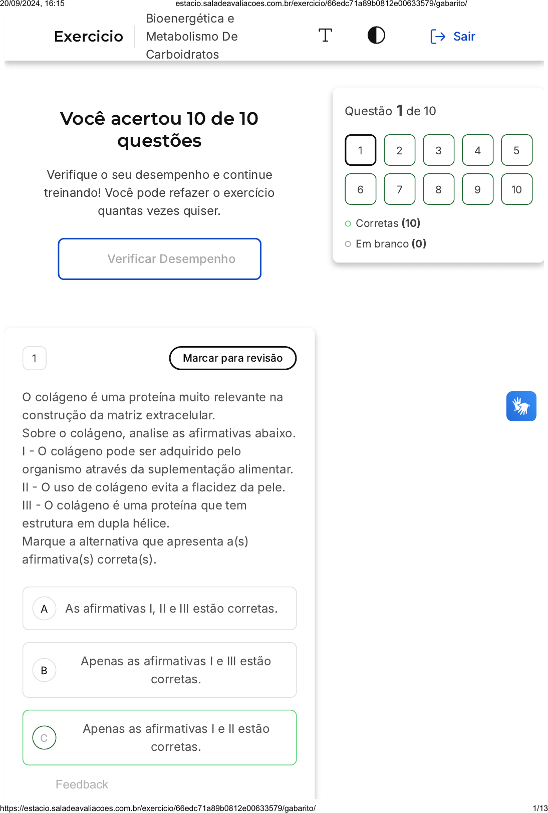 Você acertou 10 de 10 questões Verifique o seu desempenho e continue treinando! Você pode refazer o exercício quantas vezes quiser. Verificar Desempenho A B C 1 Marcar para revisão O colágeno é uma proteína muito relevante na construção da matriz extracelular. Sobre o colágeno, analise as afirmativas abaixo. I � O colágeno pode ser adquirido pelo organismo através da suplementação alimentar. II � O uso de colágeno evita a flacidez da pele. III � O colágeno é uma proteína que tem estrutura em dupla hélice. Marque a alternativa que apresenta a(s) afirmativa(s) correta(s). As afirmativas I, II e III estão corretas. Apenas as afirmativas I e III estão corretas. Apenas as afirmativas I e II estão corretas. Questão 1 de 10 Corretas �10� Em branco �0� 1 2 3 4 5 6 7 8 9 10 Feedback Exercicio Bioenergética e Metabolismo De Carboidratos Sair 20/09/2024, 16:15 estacio.saladeavaliacoes.com.br/exercicio/66edc71a89b0812e00633579/gabarito/ https://estacio.saladeavaliacoes.com.br/exercicio/66edc71a89b0812e00633579/gabarito/ 1/13 D E A B Apenas as afirmativas II e III estão corretas. Apenas a afirmativa I está correta. Resposta correta Parabéns, você selecionou a alternativa correta. Confira o gabarito comentado! Gabarito Comentado A afirmativa III está incorreta pois o colágeno é uma macromolécula proteica de extrema importância para a construção da matriz extracelular, com estrutura em hélice tripla. 2 Marcar para revisão O ciclo de Krebs, também conhecido como ciclo do ácido cítrico ou ciclo do ácido tricarboxílico �TCA�, é uma via metabólica crucial que ocorre no interior das mitocôndrias das células eucarióticas. No ciclo de Krebs, observa-se por ciclo a produção de quantas moléculas de ATP? 1 2 20/09/2024, 16:15 estacio.saladeavaliacoes.com.br/exercicio/66edc71a89b0812e00633579/gabarito/ https://estacio.saladeavaliacoes.com.br/exercicio/66edc71a89b0812e00633579/gabarito/ 2/13 C D E 3 4 5 Resposta correta Parabéns, você selecionou a alternativa correta. Confira o gabarito comentado! Gabarito Comentado O ciclo de Krebs é uma série de reações químicas que ocorrem na matriz mitocondrial e que produzem energia para a célula. O ciclo de Krebs produz 1 molécula de ATP por ciclo. ----- 3 Marcar para revisão A glicólise é uma via de degradação de glicose através de diversas reações bioquímicas. Em relação a glicólise, marque a alternativa correta. 20/09/2024, 16:15 estacio.saladeavaliacoes.com.br/exercicio/66edc71a89b0812e00633579/gabarito/ https://estacio.saladeavaliacoes.com.br/exercicio/66edc71a89b0812e00633579/gabarito/ 3/13 A B C D E Uma molécula de glicose é construída e uma série de reações enzimáticas para produzir duas moléculas de piruvato. Na glicólise, o piruvato pode ser adicionado ao etanol e dióxido de carbono, em um processo denominado fermentação lática em alta tensão de oxigênio ou em condições aeróbicas. Na glicólise, o piruvato sofre carboxilação oxidativa sequencial até Acetil Coenzima A em condições anaeróbicas. Na glicólise, o piruvato pode originar lactato em meio aeróbio com elevada tensão de oxigênio. A molécula de glicose produz ATP na presença ou na ausência de oxigênio, sendo esses processos respiração celular e fermentação respectivamente. Resposta correta Parabéns, você selecionou a alternativa correta. Confira o gabarito comentado! Gabarito Comentado A glicólise é uma via enzimática que transfere a energia presente nas ligações da molécula de glicose a outros compostos energéticos, como ATP e NADH�. A 20/09/2024, 16:15 estacio.saladeavaliacoes.com.br/exercicio/66edc71a89b0812e00633579/gabarito/ https://estacio.saladeavaliacoes.com.br/exercicio/66edc71a89b0812e00633579/gabarito/ 4/13 A B C D E molécula de glicose pode produzir ATP na falta (fermentação) como na presença de oxigênio (respiração celular). 4 Marcar para revisão Para que possa continuar o processo de respiração celular, o piruvato é convertido para acetil-CoA. Sobre este processo, marque a resposta correta: Esta reação ocorre no citoplasma da célula. Esta reação é catalisada pelo complexo PDH. Esta reação ocorre com gasto de ATP. Esta reação é endotérmica. Esta reação ocorre em uma única etapa. Resposta correta Parabéns, você selecionou a alternativa correta. Confira o gabarito comentado! Gabarito Comentado A conversão do piruvato em acetil-CoA é uma etapa crucial na respiração celular, permitindo a continuação do processo. 20/09/2024, 16:15 estacio.saladeavaliacoes.com.br/exercicio/66edc71a89b0812e00633579/gabarito/ https://estacio.saladeavaliacoes.com.br/exercicio/66edc71a89b0812e00633579/gabarito/ 5/13 A B C D E Esta reação é catalisada pelo complexo de desidrogenase do piruvato �PDH�. Portanto, a alternativa correta é a B� "Esta reação é catalisada pelo complexo PDH". As outras alternativas apresentam informações incorretas ou incompletas sobre o processo. 5 Marcar para revisão Uma afirmação da segunda lei da termodinâmica é que: As reações espontâneas são sempre exotérmicas. A energia é conservada em uma reação química. A entropia do universo está aumentando continuamente. A entalpia da reação é a diferença entre as entalpias dos produtos e dos reagentes. A energia livre de Gibbs é uma função da entalpia e da entropia. Resposta correta Parabéns, você selecionou a alternativa correta. Confira o gabarito comentado! 20/09/2024, 16:15 estacio.saladeavaliacoes.com.br/exercicio/66edc71a89b0812e00633579/gabarito/ https://estacio.saladeavaliacoes.com.br/exercicio/66edc71a89b0812e00633579/gabarito/ 6/13 A B Gabarito Comentado A segunda lei da termodinâmica afirma que a entropia do universo está sempre aumentando. A entropia é uma medida do grau de desordem de um sistema. Portanto, a afirmação de que a entropia do universo está aumentando continuamente significa que o universo está se tornando cada vez ma