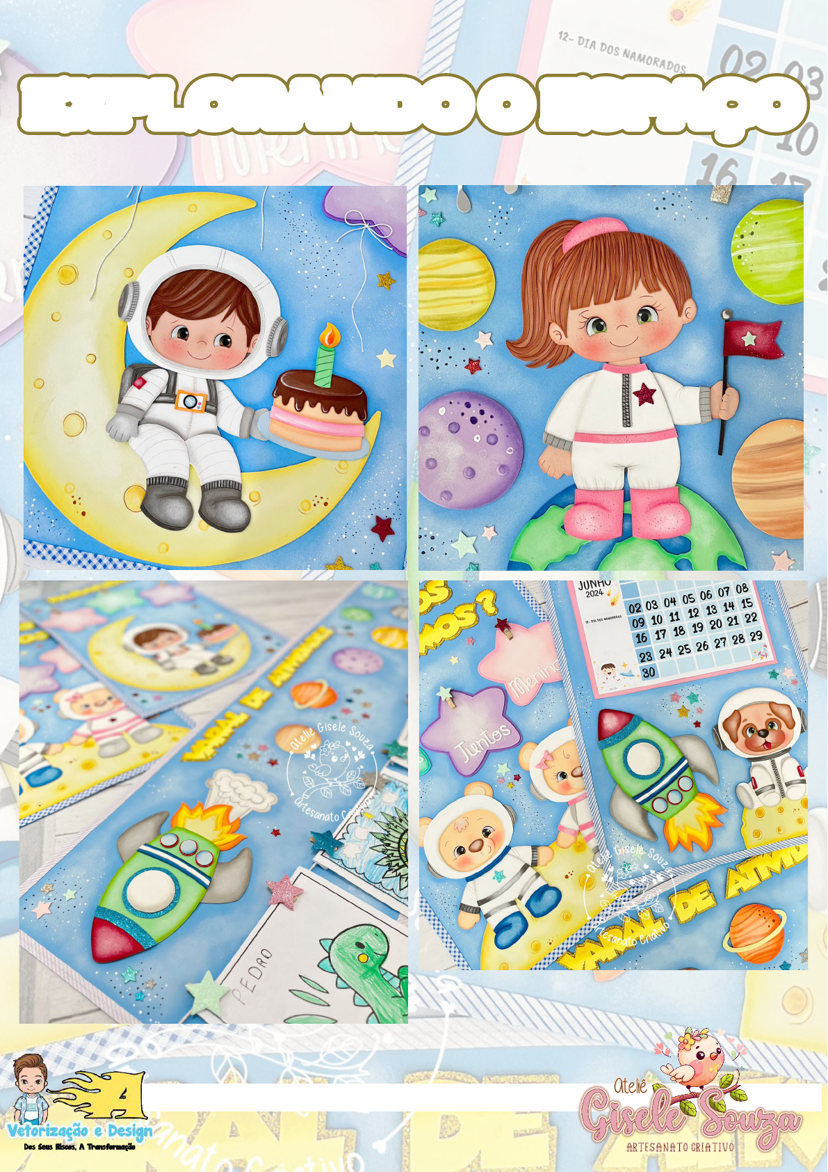 Moldes em tamanho real APOSTILA DE MOLDES EXPLORANDO O ESPAÇO RECADO IMPORTANTÍSSIMO ESSA APOSTILA FOI DESENVOLVIDA COM MUITO CARINHO, amor dedicação e muito trabalho! Foram dias intensos de trabalho! Não se desenvolve uma apostila do dia pra noite... São várias etapas e o processo é muito longo e trabalhoso. Por isso eu quero te pedir... Não compartilhe esse arquivo com outra pessoa e muito mesmo em grupos de trocas! Valorize seu investimento! Valorize o meu trabalho! Não faça com os outros, aquilo que você não gostaria que zessem com você! Antes de agir... pense e repense! Espero que goste da apostila e qualquer dúvida eu estou a disposição! Um abraço... Gisele Souza Lista de Materiais Eva Azul claro para a base de todos os cartazes. Eva Amarelo, Amarelo Baunilha, Rosa, Lilás, Verde claro, Cinza, Azul, Laranja, Bege, Nude, Salmão, Verde hortelã, Marrom claro. Azul com glitter Dourado de glitter. Cola quente e Cola instantânea. Olhos adesivos Carol G (Flávia Franco). Mini pregadores de madeira 3,5cm Viés no Gis pastel oleoso, Lápis de cor mega soft color TRIS, Tinta pva azul marinho (para pintinhas), Tinta branca pva fosca (para luz seca), Pincel para luz seca (Pituá). Marcador permanente preto Valor Sugerido para vender Cada Cartaz 70,00 à 80,00 reais Os cartazes Calendário, Quantos Somos, Parabéns, Tempo e Palavra Mágica, medem 40x60 (1 folha de eva). O Varal de atividades, mede 40x120 (2 folhas de eva deitadas). A Plaquinha de Bem-vindos, mede no total 66x54 Cartaz Chamadinha, mede 60 de largura x 80 de altura. (Emendei 2 folhas de eva 40x60). Você pode montar vários outros cartazes, para completar seu kit, usando moldes repetidos. Por exemplo: Dá para fazer Ajudantes, Combinados, Cantinho da leitura e etc... Use e abuse da sua criatividade. informações adicionais - EVAS: Instagram: @clubedoeva Cupom de 10% de desconto: 10GISELE - Olhinhos adesivos: Flávia Franco Instagram: @aviaolhinhosadesivo Cupom de desconto: atgisele - Apliques de Biscuit: Instagram: @encantosdabibi Cupom de desconto: ATELIEGI10 - Faquinhas: Instagram: @raquelgallete WhatsApp: (21) 98509-1537 - Aviamentos: MF Artesanatos Instagram: @mf_lojaartesanato Cupom de desconto: ATELIEGISELE Fornecedores Moldes M o ld es P ag o s - P ro d uz id o s p o r G is e le S o u za 01 Moldes da Placa de Bem-vindos Imprimir 4x e juntar as partes com durex, até formar um círculo inteiro com 37cm de diâmentro. parte do molde da faixa de Bem-vindos colar com a parte A B M o ld es P ag o s - P ro d uz id o s p o r G is e le S o u za Continuação Moldes da Placa de Bem-vindos 1 x A zul glitter (F o guete) 1 x A zul glitter (F o guete) 1 x B ranco Janela F o guete A02 1 x B ranco (F o guete) 1 x A zul glitter (F o guete) co lar co m d urex na p arte B d a p ágina 1 F aixa d e B em -vind o s E V A B ranco d ep o is, co le em cim a d e um eva am arelo b aunilh a e reco rte em vo lta, d eixand o um a b eirad inh a. 3x Vermelho 3x BrancoJanelinhas do Foguete M o ld es P ag o s - P ro d uz id o s p o r G is e le S o u za 1x Vermelho Ponta do Foguete 2x Cinza Asas do Foguete 1x Verde Claro Foguete 1x Amarelo Baunilha Fogo 1x Laranja Fogo 1x A m ar elo Fo go Moldes Foguete (Vem-vindos, Varal de Atividades e Calendário)03 M o ld es P ag o s - P ro d uz id o s p o r G is e le S o u za 1 x C in za ( Fu m aç a d o f o gu et e P la ca d e B em -v in d o s) 04 Moldes Fumaça do Foguete (Bem-vindos) M o ld es P ag o s - P ro d uz id o s p o r G is e le S o u za 1x Branco Fumaça Foguete Planetas 1x Bege 1x Lilás Estrela Amarela (Bem-vindos) Plan eta 1x C inza 1x Lara nja 1x Verd e ág ua 1x D ou ra do de g lit te r co la r a es tr el a am ar el a po r ci m a de ss a 05 Continuação Moldes Bem-vindos M o ld es P ag o s - P ro d uz id o s p o r G is e le S o u za 1x Bege Cabelo Menina 2x Bege Tranças Meninas para a menina e o menino 1x Rosa/Azul Gola 1x Rosa/Azul Cinto 1x Rosa 1x Azul de glitter M o ld ura R o sa d o C ap acete d a M enina V azad o Branco 1x Macacão Menina e Menino Bem-vindos06 M o ld es P ag o s - P ro d uz id o s p o r G is e le S o u za Nude Rosto Menina e Menino Olhos Carol G 1 x M arro m C ab elo M enino Luvas Cinza Branco Capacete Menino e Menina Vazado us ar e ss e m o ld e no m en in o d o P ar ab én s Cinza Bota Menino e Menina Bem-vindos07 Manga Branca Menina e Menino 2x C in zaBranco Manga Menino e Menina C in za C ap ac et e Cinza Luvas colar por dentro do capacete do menino Menino e Menina M o ld es P ag o s - P ro d uz id o s p o r G is e le S o u za Fogo da Vela 1x Amarelo 1x Verde Vela Imprimir 2x e juntar para formar a lua. 1x Amarelo Baunilha 1x Bege Bolo 1x Marrom Calda Bolo 1x Azul céu prim avera Prato do Bolo 1x Rosa Recheio do Bolo 08 Cartaz Parabéns M o ld es P ag o s - P ro d uz id o s p o r G is e le S o u za 1x Nude Rosto Menino Olhos Carol G 1x Cinza detalhe da Coxa 1x Branco Corpinho 1x Marrom Cabelo 1x Branco Braço 1x Branco Braço Vermelho detalhe do braço1x 09 Menino do Cartaz Parabéns pintei a parte branco com tinta 1x Cinza Cinza Punho 2x 1x Branco Pernas desenho 2x Cinza Luvas 1x Laranja 2 x C in za C ap ac et e Mochila 1x Cinza Escuro M o ld es P ag o s - P ro d uz id o s p o r G is e le S o u za Molde para os Balões e Quantos Somos. colar em outro eva e recortar deixando uma beiradinha. mesmo molde para o urso e ursa 4x Branco Braços 2 x R o sa 2 x C in za Punhos 4x Pele parte de dentro das orelhas Usei Olhos Carol G 2x Bege Cabeça Urso e Ursa Quantos Somos e Parabéns10 Focinho Mãos Bege 4x 2x Marrom Boca 2x Pele Clarinho 4x Botas2x Azul 2x Rosa M o ld es P ag o s - P ro d uz id o s p o r G is e le S o u za Vazado 4x Cinza detalhe do capacete 2x Branco Urso e Ursa 2x 1x Azul 1x Rosa Gola 1x Rosa 1x Cinza 11 Quantos Somos (Ursinhos) Cinto detalhe da perna 2x Cinza 2x Rosa M o ld es P ag o s - P ro d uz id o s p o r G is e le S o u za Planetas 1x Verde Limão 1x Bege 1x Lilás 1x Laranja Amarelo Sol Amarelo Sol L ua d o C ar ta z Q ua nt o s So m