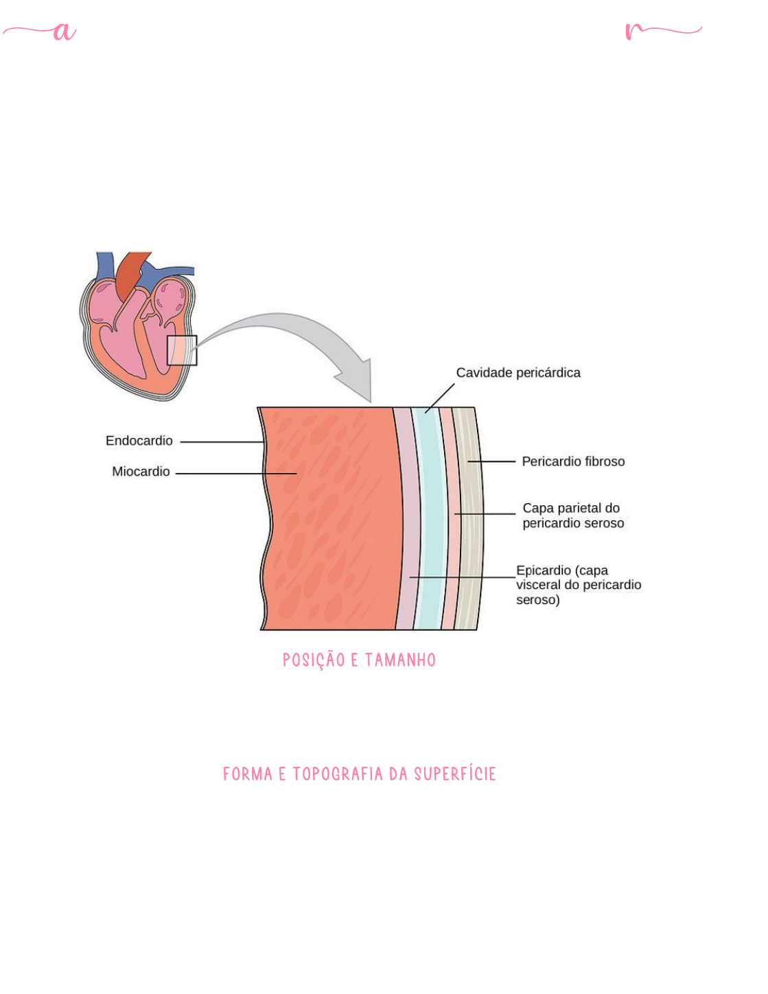 natomia do sistema cardiovascula O coração é o órgão central do sistema circulatório. É composto principalmente pelo músculo cardíaco, chamado miocárdio, o qual forma uma bolsa dividida em quatro câmaras: átrio direito, átrio esquerdo, ventrículo direito e ventrículo esquerdo. O coração é envolvido pelo pericárdio e forma parte do mediastino. O pericárdio é uma cobertura fibrosserosa, trata- se essencialmente de um saco com invaginação profunda com seu lúmen, a cavidade pericárdica, que se reduz a uma fenda capilar. Essa fenda contém uma pequena quantidade de fluido seroso, o líquido pericárdico (facilita o movimento do coração contra o pericárdio). O pericárdio pode ser dividido em parte fibrosa central e uma parte serosa interna e externa. Ainda pode ser dividido em: pleura pericárdica, pericárdio fibroso e pericárdio seroso. O coração se situa no mediastino, sendo a maior parte posicionada a esquerda do plano mediastino. Ele se prolonga entre a 3ª e a 6ª costelas (7ª no cão e no gato). Grande parte da superfície do coração é coberta pelo pulmão. Caudalmente, o coração se projeta até o diafragma. Variações quanto a posição e tamanho ocorrem entre espécies, raças e indivíduos. O coração se assemelha a um cone, sendo que sua base se volta dorsalmente e seu ápice se volta ventralmente, próxima ao esterno. Embora sua forma seja cônica, o coração é comprimido lateralmente, especialmente em direção ao ápice, ajustando-se ao tórax. A base do coração é o hilo do órgão, através do qual as grandes veias penetram e as grandes artérias deixam o coração. As aurículas dos átrios são visíveis no lado esquerdo, envolvendo a raiz da aorta e o tronco pulmonar, enquanto as partes principais dos átrios e as grandes veias se localizam no lado direito. As divisões da estrutura interna do coração são visíveis como sulcos em sua superfície. A face direita ou atrial do coração é marcada pelo sulco interventricular subsinuoso, o qual se prolonga desde o sulco coronário até o ápice do coração. O sulco interventricular paraconal corre sobre a face esquerda do coração a partir do sulco coronário até o terço distal da margem cranial. O sulco coronário marca a separação dos átrios e ventrículos. Ele contém uma grande quantidade de tecido adiposo, o qual envolve os vasos sanguíneos coronários. O coração é dividido internamente por um septo interventricular longitudinal em lado esquerdo e direito. O átrio direito forma a parte direita e recebe sangue da veia cava cranial, da veia cava caudal e do seio coronário, o qual coleta por si o sangue venoso da maior parte do coração. Ele se divide em uma parte principal, o seio das veias cavas e uma parte de terminação cega, a aurícula do átrio direito. Ele se separa do átrio esquerdo por um septo interatrial. O tubérculo intervenoso, uma crista transversa de tecido entre as aberturas das duas veias cavas, projeta-se para o interior do átrio direito e direciona o fluxo de sangue através do óstio atrioventricular. Imediatamente caudal a esse tubérculo, no septo interatrial, há uma área com uma depressão, a fossa oval, um vestígio de forame oval do desenvolvimento fetal. A superfície interna da parede da aurícula do átrio direito é fortalecida pelos músculos pectíneos entrelaçados que formam cristas irregulares. O átrio esquerdo forma a parte esquerda dorsocaudal da base do coração. Ele recebe sangue oxigenado das veias pulmonares e se assemelha ao átrio direito quanto a forma e estrutura. O átrio esquerdo se abre para o ventrículo esquerdo através do óstio atrioventricular esquerdo. O ventrículo direito possui formato de meia lua em secção transversal e molda-se a superfície do ventrículo esquerdo cônico. Ele não se prolonga até o ápice do coração. O ventrículo recebe sangue desoxigenado do átrio direito e o bombeia através do cone arterial para o tronco pulmonar, o qual transporta o sangue para o pulmão. O cone arterial é a parte em forma de funil do ventrículo direito, que se separa da câmara principal pela crista supraventricular e é contido pela aurícula do átrio direito externamente. A crista supraventricular é uma elevação dos músculos posicionada obliquamente que se projeta ventralmente entre a origem do cone arterial e o óstio atrioventricular. No óstio atrioventricular direito, encontra-se a valva atrioventricular direita ou valva tricúspide. Ela possui três válvulas que se fixam perifericamente aos anéis fibrosos do esqueleto cardíaco, que circunda o óstio atrioventricular. Cada válvula é reforçada por fios fibrosos, as cordas tendíneas. Essas cordas tendíneas emergem das projeções musculares cônicas, os músculos papilares, e se projetam até a margem livre e a face ventricular adjacente da valva atrioventricular direita. De modo geral, há três músculos que se projetam das paredes ventriculares e do septo interventricular para o interior da câmara. As cordas tendíneas se dispõem de tal forma que conectam cada músculo a duas válvulas e cada válvula a dois músculos. Essa disposição impede o prolapso da valva para o átrio quando os ventrículos se contraem. A valva atrioventricular direita impede que o sangue retorne do ventrículo para o átrio direito durante a fase sistólica. Durante a diástole, o refluxo do sangue do tronco pulmonar para o ventrículo direito é impedido pela valva do tronco pulmonar. Ela é composta por três válvulas semilunares. O lúmen do ventrículo direito é cruzado por uma faixa, a trabécula septomarginal, que passa do septo interventricular para a parede externa. A parte ventral do ventrículo direito é marcado por várias ondulações miocárdicas, as trabéculas cárneas, que se projetam principalmente da parede externa. O ventrículo esquerdo é cônico, sendo que seu ápice forma o ápice do coração. Ela recebe o sangue oxigenado dos