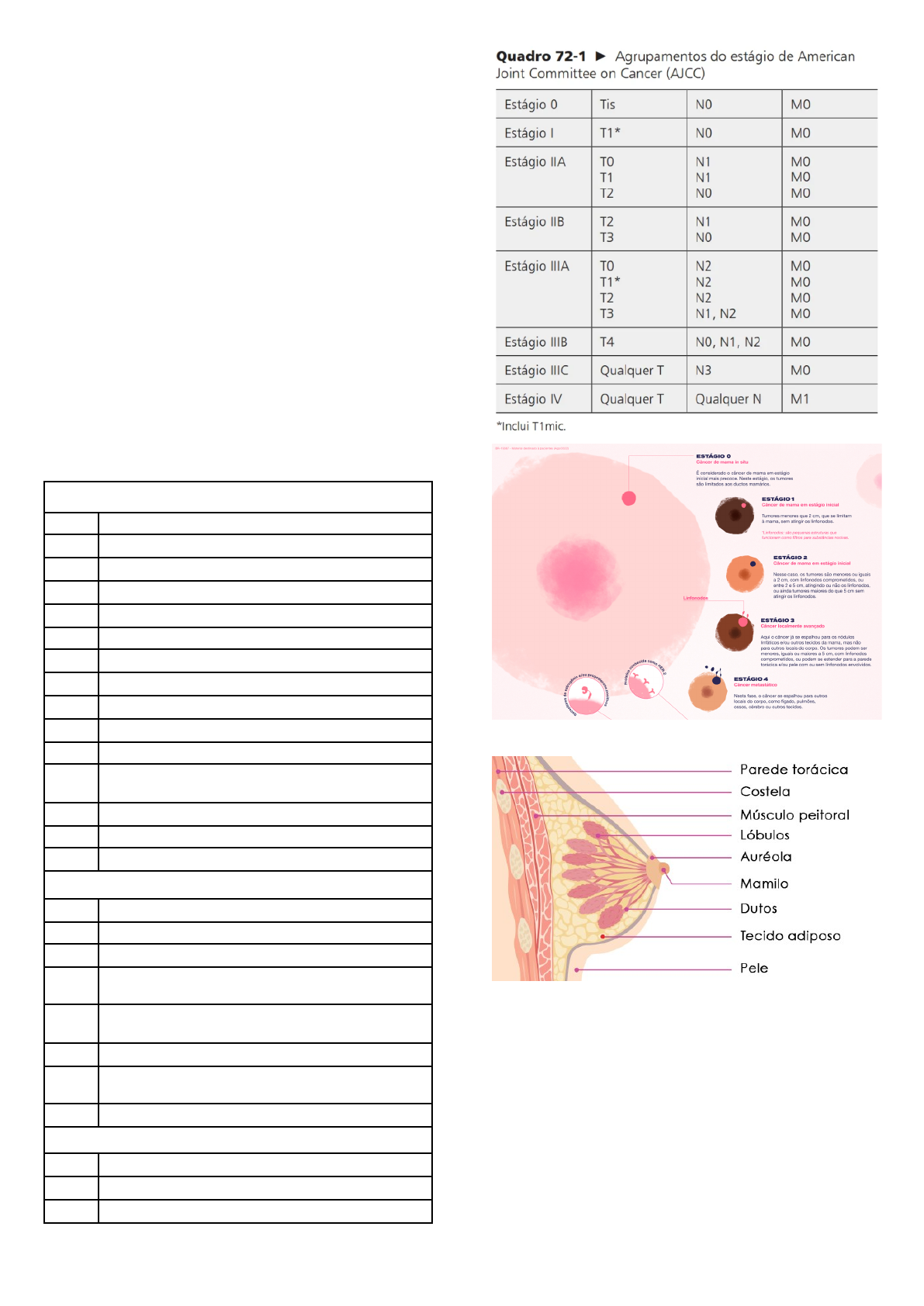 Neoplasias de Mama O câncer de mama é o segundo tipo de câncer mais frequente no mundo e o primeiro entre as mulheres. O prognóstico é bom quando diagnosticado e tratado precocemente. Carcinogênese Iniciação Eventos genéticos ou agentes oncogênicos ativam proto-oncogenes em oncogenes e inativam genes supressores de tumor. Promoção Estímulo contínuo através de onco-promotores. Progressão Crescimento descontrolado com capacidade de invasão e metastatização. [?] Proto-oncogenes: Genes normais envolvidos na multiplicação celular e que sofrem processos genéticos, tornando-se oncogenes participativos na proliferação anormal de células. Exemplo: HER-2, c-myc e int. [?] Genes supressores tumorais: Genes envolvidos no controle da multiplicação celular. Exemplo: p-53, BRCA-1, BRCA-2. Estadiamento Tamanho do Tumor (T) Tx Não avaliado T0 Nenhuma evidência Tis Carcinoma in situ T1 Tumor até 2 cm T1mic Microinvasão ≤ 0,1 cm T1a Tumor > 0,1 cm ≤ 0,5 cm T1b Tumor > 0,5 cm ≤ 1 cm T1c Tumor > 1 cm ≤ 2 cm T2 Tumor > 2 cm ≤ 5 cm T3 Tumor > 5 cm T4 Qualquer T com extensão na pele ou parede torácica T4a Extensão para costela ou músculos intercostais ou serráteis (não inclui peitoral) T4b Edema (casca de laranja) T4c T4d Carcinoma inflamatório Linfonodos (N) Nx Não avaliado N0 Linfonodo sem metástase N1 Metástase em linfonodo(s) axilar(es) ipsilateral(is) móvel(is) N2a Metástase em linfonodo(s) axilar(es) ipsilateral(is) fixo(s) a outro(s) ou a outra estrutura N2b Metástase apenas em linfonodo(s) de cadeia mamária interna na ausência de metástase axilar N3a Metástase em linfonodo infraclavicular ipsilateral N3b Metástase em linfonodo da cadeia mamária interna ipsilateral e em linfonodo axilar N3c Metástase em linfonodo supraclavicular supraclavicular ipsilateral Metástase a distância (M) Mx Não avaliado M0 Nenhuma metástase M1 Metástase a distância Anatomia A mama é um órgão par, situado na região anterior do tórax, sobre o músculo peitoral maior, sendo uma glândula sudorípara modificada de origem ectodérmica. Pode ainda haver uma extensão da mama em direção à borda lateral do músculo peitoral maior, denominada de cauda de Spencer. Estruturalmente a mama divide-se em cerca de 15 a 20 lobos, e cada um é formado por 20 a 40 lóbulos (unidade funcional da mama) e esses por 10 a 100 alvéolos (unidade secretora em repouso) ou ácinos (unidade secretora desenvolvida na gestação e lactação). Por meio de ductos em um desenho radial, o produto das glândulas é drenado até os seios lactíferos, localizados sob os mamilos. Diferenciar as principais afecções benignas da mama O tecido mamário benigno é heterogêneo, contendo gordura, estroma (arcabouço da mama) e parênquima (ductos e lóbulos). Os principais motivos que levam as pacientes ao consultório são dor, nódulo, alteração mamográfica e derrame papilar. Os diagnósticos em mastologia obedecem ao exame tríplice na sua maioria: Exame clínico: Inspeção estática e dinâmica, palpação das mamas, axilas, regiões infra e supra claviculares e regiões esternocostais. Exame de imagem: Mamografia e/ou ultrassom. Ressonância magnética em casos especiais. Exame anatomopatológico: Por meio de punção aspirativa por agulha fina (PAAF – citologia), biópsia de fragmento ou biópsia cirúrgica (histologia). Alterações Funcionais Benignas da Mama Expressão recomendada pela Sociedade Brasileira de Mastologia em 1994 com ampla sinonímia – displasia mamária, doença fibrocística, mastopatia fibrocística – as quais representam entidades como a dor, o cisto, o derrame papilar e o espessamento (nodularidade). A expressão displasia mamária também foi modificada em outros países por Alteração Normal do Desenvolvimento e Involução da Mama (ANDI). Mastalgia Sua fisiopatologia é controversa, envolvendo fatores hormonais, metabólicos e emocionais. A mastalgia cíclica tem relação com o período pré-menstrual. Amastalgia acíclica já não obedece a essa relação. Seja qual for a etiologia da dor, o primeiro passo é excluir qualquer alteração na mama e acalmar a paciente. A conduta não medicamentosa geralmente é bem sucedida. Excluídas as causas mamárias, o primeiro passo além do esclarecimento seria o uso de sutiãs adequados e a diminuição de metilxantilas (café, chocolate e refrigerante). A terapia medicamentosa pode ser baseada em AINEs, antiestrogênio, antiprolactinêmico (bromocriptina e cabergolina) e o antigonadotrófico (danazol), entre outros. Descarga papilar Representa a saída de secreção pela papila fora da gestação ou lactação. Menos de 5% têm causa maligna. O derrame fisiológico não necessita de grandes investigações. Na maioria dos casos apresenta aspecto seroso, é bilateral, multiductal e não espontâneo. Quando patológico, o derrame geralmente é aquoso ou sanguinolento, espontâneo, unilateral e uniductal. Podem ser indicados exame de imagem, citologia e eventual exérese da lesão. O derrame papilar leitoso após um ano do término da amamentação é denominado galactorreia. Geralmente está associada à amnorreia e infertilidade. Substâncias relacionadas com o aumento da prolactina: anti-hipertensivos (Verapamil, Metildopa, Reserpina), hormônios (Anticoncepcionais orais), psicoativos e outros (Cimetidina, Ranitidina, Cocaína, Metoclopramina, Opiáceos). Alterações Inflamatórias da Mama Mastite Puerperal Não Epidêmica Também chamada de endêmica, esporádica ou casual que acomete o tecido conjuntivo interlobular. Ocorre em virtude de fatores associados, como o ingurgitamento e a estase venosa e linfática. Dificulta a amamentação, predispondo a formação de fissuras papilares que servem como porta de entrada para bactérias. A mais comum é o Staphylococcus aureus. A contaminação também pode ocorrer por via hematogênica ou pelos ductos. O quadro inicial é inflamatório, podendo evoluir para a f