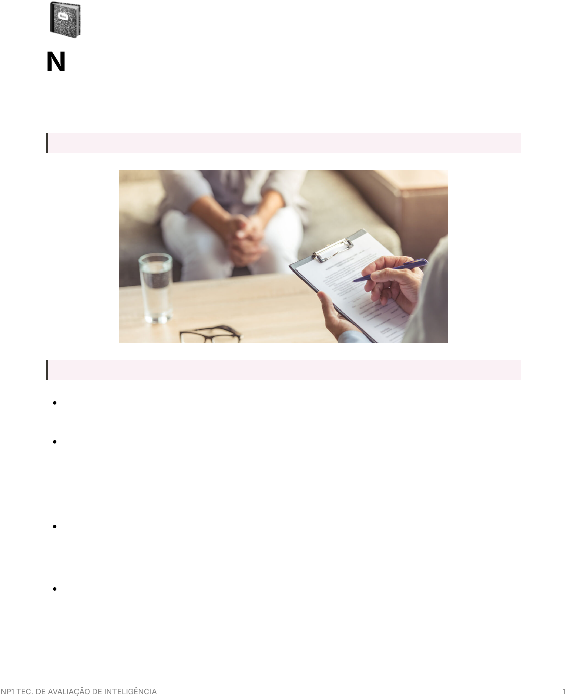 NP1 TEC. DE AVALIAÇÃO DE INTELIGÊNCIA 1 📓 NP1 TEC. DE AVALIAÇÃO DE INTELIGÊNCIA Capacidade geral de adaptação Não há ser humano desprovido de conhecimento/ inteligência A avaliação psicológica tem função de descrever algum aspecto de uma pessoa, através de técnicas e teorias científicas Desenvolvimento de métodos científicos e objetos utilizados para a quantificação e mensuração de fenômenos psicológicos Testagem psicológica: Foco nos resultados (obter uma medida) Individual/grupal Avaliação psicológica: Foco em como é processado pelo paciente (afim de responder uma questão, resolver um problema ou tomar uma decisão) Individual Para escolher o número de sessões, técnicas e instrumentos se considera: NP1 TEC. DE AVALIAÇÃO DE INTELIGÊNCIA 2 Contexto no qual a AP se insere (qual o contexto que a AP estará inserida? Propósitos da AP (para que? Construtos psicológicos a serem investigados (Personalidades, impulsividade, agressividade, são exemplos de construtos) Adequação das características dos instrumentos aos sujeitos avaliados Condições técnicas e metodológicas do instrumento de avaliação Passos � Levantamento dos objetivos e das particularidades do sujeito avaliado � Coleta de informações pelos meios escolhidos (testes e etc) � Integração das informações e desenvolvimento das hipóteses iniciais � Indicação das respostas à situação que motivou o processo de avaliação e comunicação CUIDADOSA dos resultados Avaliação psicológica Foco em modelos psicológicos Uso de testes psicométricos e projetivos Exemplos de uso: Corporativo (promoção de cargo), saúde (cirurgia bariátrica), escolar (essa criança se beneficia numa sala de aula regular? Clínica 📝 Hospital 🏥 Escola 🏫 Trânsito 🚦 Jurídico � Organizacional � Avaliação neuropsicológica Foco em modelos neurocognitivos Investiga as funções cognitivas e o comportamento relacionando com o funcionamento esperado ou deficitário do Sistema Nervoso Central SNC Uso de testes psicométricos, escalas e inventários de humor NP1 TEC. DE AVALIAÇÃO DE INTELIGÊNCIA 3 Quando a AN é recomendada? Auxílio diagnóstico de transtornos de desenvolvimento TEA, TDAH e transtornos de aprendizagem) Suspeita de alterações cognitivas decorrentes de doenças neurodegenerativas Alzheimer e outras demências) Identificação de prejuízos cognitivos consequentes de lesões cerebrais (traumatismo craniano, AVC, uso de substâncias) Exemplos de uso: Clínica 📝 Hospital 🏥 Escola 🏫 Jurídico � A AN é um campo de atuação e pesquisa interdisciplinar Nem todo neuropsicólogo pode utilizar testes psicológicos em um processo de AN Mas todo psicólogo tem permissão legal para uso de testes em AN ou AP Teorias da inteligência Inteligência é a capacidade que temos de nos adaptar ao ambiente Panorama NP1 TEC. DE AVALIAÇÃO DE INTELIGÊNCIA 4 Charles Spearman Fator geral (g): Spearman propôs que a inteligência humana é baseada em um fator geral (g). Esse fator seria responsável pelo desempenho consistente em diferentes tipos de tarefas cognitivas. Fatores específicos (s): Além do fator geral, Spearman identificou fatores específicos (s) que influenciam o desempenho em tarefas específicas. Esses fatores são independentes e explicam habilidades individuais em áreas específicas, como linguagem ou matemática. NP1 TEC. DE AVALIAÇÃO DE INTELIGÊNCIA 5 Análise Fatorial: Spearman utilizou a técnica da análise fatorial para identificar esses dois tipos de fatores, mostrando que as correlações entre os diferentes testes indicavam a presença do fator geral (por mais que existam habilidades específicas, existe uma inteligência geral) Louis Thurstone Propôs a Teoria das Aptidões Mentais Primárias, sugerindo que a inteligência não é um fator geral único, mas composta de várias habilidades mentais primárias (como compreensão verbal, fluência verbal, raciocínio, etc.). Raymond Cattell Introduziu a distinção entre inteligência fluida (Gf) e inteligência cristalizada (Gc). A inteligência fluida é a capacidade de resolver novos problemas sem depender de conhecimentos prévios, enquanto a cristalizada é baseada em conhecimentos cultural e socialmente adquiridos. John Horn Expandiu o trabalho de Cattell, adicionando outros fatores à teoria Gf-Gc, como o processamento visual e processamento auditivo. John B. Carroll Conduziu uma meta-análise de 461 estudos de inteligência e propôs a Teoria dos Três Estratos, um modelo hierárquico da inteligência. No topo está o fator g, seguido pelos fatores amplos (como Gf e Gc) e, na base, os fatores específicos, que avaliam habilidades específicas ligadas a testes psicométricos. NP1 TEC. DE AVALIAÇÃO DE INTELIGÊNCIA 6 Teoria Cattell-Horn-Carroll (CHC) (1998) Modelo mais atual e respaldo ao WISC Modelo hierárquico Gf e Gc Kevin McGrew e Dawn Flanagan unificaram as teorias de Cattell-Horn e Carroll, resultando na Teoria Cattell-Horn-Carroll CHC. Este modelo hierárquico multidimensional descreve a inteligência em três estratos/camadas: Camada I Aproximadamente 70 habilidades específicas. Camada II Dez fatores amplos Gf, Gc, memória de curto prazo, velocidade de processamento, etc.). Camada III O fator g de Spearman no topo, representando uma associação geral entre todas as habilidades cognitivas. NP1 TEC. DE AVALIAÇÃO DE INTELIGÊNCIA 7 Qualquer que seja a medida de inteligência está relacionada ao inteligência geral Durante a resolução de problemas tanto o fator g quanto o fator s (específicos) podem estar presentes NP1 TEC. DE AVALIAÇÃO DE INTELIGÊNCIA 8 Inteligência fluída (Gf) Capacidade de pensar logicamente em situações novas sem bagagem (ex: cotidiano) Aspectos biológicos (genético) → nutrição, sono, hormônios podem afetar (nascemos com a Gf → já vem instalado�) Envolve o raciocínio abstrato, a descoberta de padrões e a solução de problemas