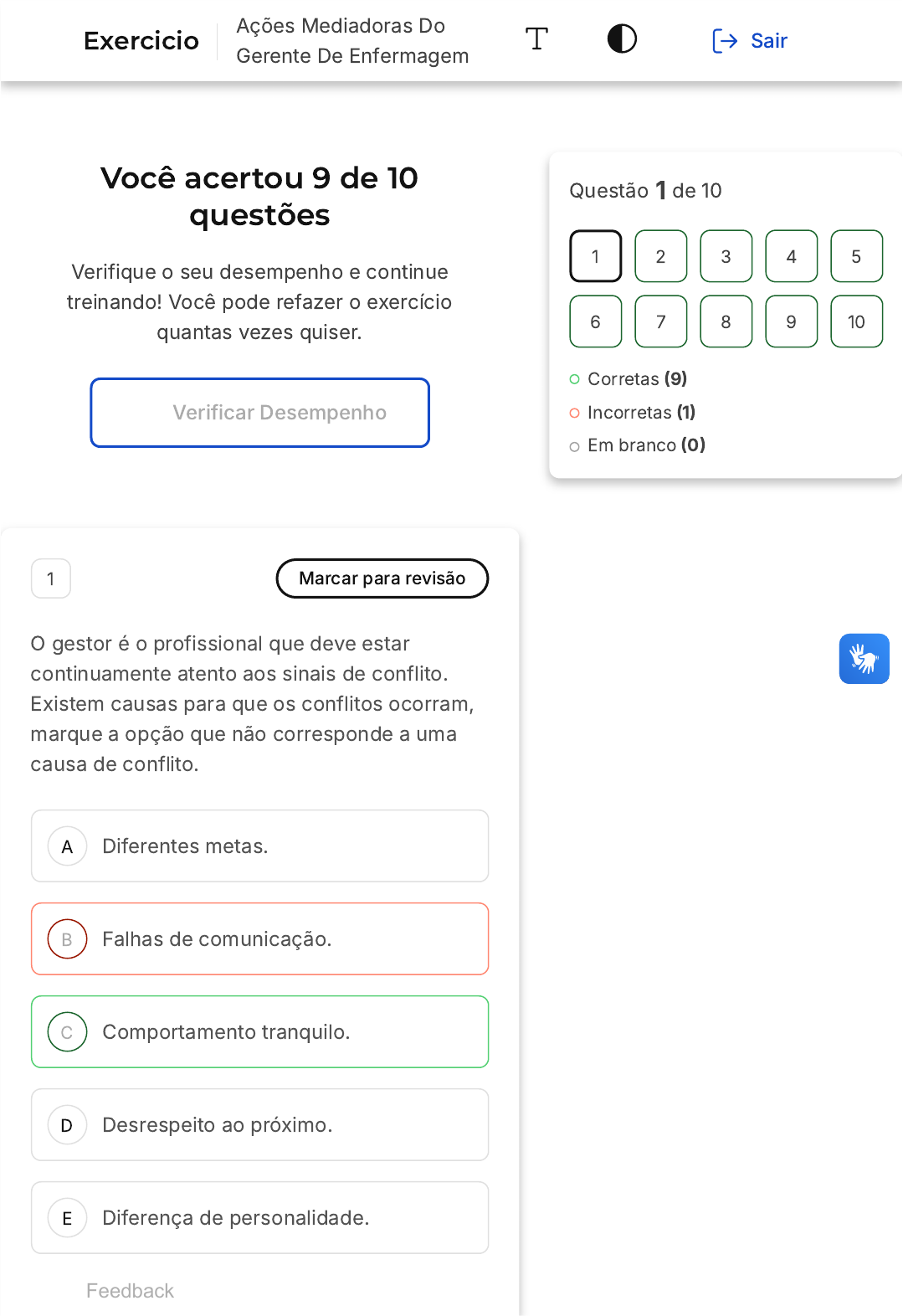 Você acertou 9 de 10 questões Verifique o seu desempenho e continue treinando! Você pode refazer o exercício quantas vezes quiser. Verificar Desempenho A B C D E 1 Marcar para revisão O gestor é o profissional que deve estar continuamente atento aos sinais de conflito. Existem causas para que os conflitos ocorram, marque a opção que não corresponde a uma causa de conflito. Diferentes metas. Falhas de comunicação. Comportamento tranquilo. Desrespeito ao próximo. Diferença de personalidade. Questão 1 de 10 Corretas �9� Incorretas �1� Em branco �0� 1 2 3 4 5 6 7 8 9 10 Exercicio Ações Mediadoras Do Gerente De Enfermagem Sair Feedback Resposta incorreta Opa! A alternativa correta é a letra C. Confira o gabarito comentado! Gabarito Comentado Os conflitos ocorrem devido às expectativas profissionais mal definidas no ambiente de trabalho, o gestor deve conhecer sua equipe e proporcionar um ambiente de trabalho agradável, além de uma rotina bem definida. 2 Marcar para revisão �FEPESE � 2023� São atribuições e condutas adequadas do enfermeiro auditor: 1. Identificar as falhas e punir os responsáveis. 2. Avaliar os serviços de assistência à saúde em qualquer nível onde exista a presença de profissionais de enfermagem. 3. Organizar, dirigir, planejar, coordenar e avaliar, prestar consultoria e emissão de parecer sobre os serviços de Auditoria de Enfermagem. 4. Atuar na elaboração, execução e avaliação dos planos assistenciais de saúde. 5. Atuar na elaboração de medidas de prevenção e controle sistemático de danos que possam ser causados aos pacientes durante a assistência de enfermagem. Assinale a alternativa que indica todas as afirmativas corretas. A B C D E São corretas apenas as afirmativas 2 e 4. São corretas apenas as afirmativas 1, 3 e 5. São corretas apenas as afirmativas 1, 2, 3 e 4. São corretas apenas as afirmativas 2, 3, 4 e 5. São corretas as afirmativas 1, 2, 3, 4 e 5. Resposta correta Parabéns, você selecionou a alternativa correta. Confira o gabarito comentado! Gabarito Comentado O auditor tem como objetivo principal avaliar a qualidade da assistência prestada e minimizar os riscos, além disso avalia os processos de trabalho propondo readequações ou elaboração de protocolos sempre que necessário. 3 Marcar para revisão �FCC � 2014� As auditorias são os instrumentos de medida da qualidade do cuidado de enfermagem. As mais utilizadas em controle de qualidade originam-se no modelo de A B C D E Donabedian e incluem auditorias de Resultados, de Processos e de Estrutura. As colunas abaixo estão descritas de acordo com o indicador avaliado e o tipo de auditoria correspondente. Coluna 1: indicador avaliado I. Taxa de queda de paciente. II. Tempo de espera no pronto-atendimento. III. Técnica de passagem de sonda vesical, conforme protocolo de enfermagem instituído. Coluna 2: tipo de auditoria ( ) Auditoria de Processo ( ) Auditoria de Resultado ( ) Auditoria de Estrutura A sequência numérica correta da Coluna 2: tipo de auditoria, correspondente a Coluna 1: indicador avaliado, é: III, II e I, apenas. I, II e III, apenas. II, III e I, apenas. III, I e II, apenas. I, III e II, apenas. Resposta correta Parabéns, você selecionou a alternativa correta. Confira o gabarito comentado! Gabarito Comentado A B C D E Na autoria a estrutura diz respeito à avaliação da infraestrutura, tendo como indicadores por exemplo a sinalização, espaço para sala de espera, acessibilidade, entre outros. Os processos têm relação com a dinâmica do cuidado, como a realização de procedimentos conforme protocolos e rotinas da instituição. Os resultados indicam o resultado da assistência prestada. 4 Marcar para revisão O serviço de enfermagem segue as diretrizes provenientes da teoria geral da administração. Qual a teoria que também pode ser conhecida como organização racional do trabalho? Teoria clássica. Teoria burocrática. Administração científica. Teoria das relações humanas. Teoria Contingencial. Resposta correta Parabéns, você selecionou a alternativa correta. Confira o gabarito comentado! A B C D E Gabarito Comentado A teoria da administração científica também é conhecida como organização racional do trabalho, pois busca organizar o trabalho de forma racional, exigindo processo sistematizado e padronizado. 5 Marcar para revisão Sabe-se que o conflito quando não for bem gerenciado poderá gerar maiores danos para a instituição. O conflito intrapessoal é o ocorrido como? Divergência entre duas pessoas. Divergência entre duas ou mais pessoas. Divergência entre grupos. Ocorrido com o próprio indivíduo. Ocorrido com o indivíduo e o gestor. Resposta correta Parabéns, você selecionou a alternativa correta. Confira o gabarito comentado! Gabarito Comentado A B C Existem três tipos de conflitos e o conflito intrapessoal é aquele que ocorre com o próprio indivíduo, geralmente decorrente de estresse, tensão, frustrações entre outros sentimentos que podem ser gerados decorrente do processo de trabalho. 6 Marcar para revisão �INSTITUTO AOCP � 2015� Uma das tarefas do profissional de enfermagem é o registro, no prontuário do paciente, de todas as observações e assistência prestada ao paciente – ato conhecido como anotação de enfermagem. Sobre a anotação de enfermagem, é correto afirmar que: Recomenda-se que o registro das informações seja organizado de modo a reproduzir a ordem cronológica dos fatos. Os dados devem ser sempre registrados a lápis para que haja possibilidade de alterá-los no decorrer do plantão. Por ser um importante instrumento de comunicação para a equipe, as informações devem ser rebuscadas e detalhadas ao extremo, ainda que dêem margem a interpretações dúbias. D E É dispensada a aposição do número de inscrição do Conselho Regional de Enfermagem do técnico que realiza a anotação, sendo este dado obrigatório apenas ao enferm