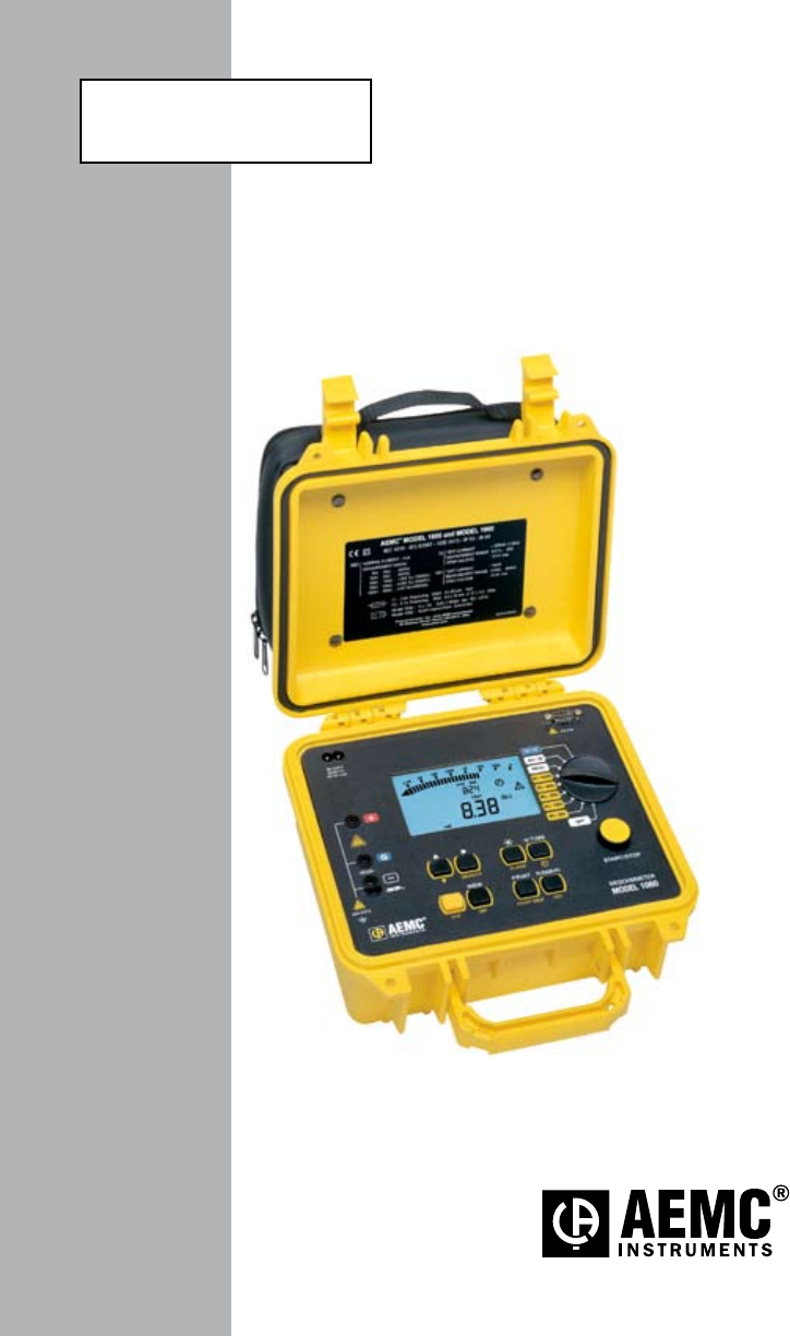 MEGOHMMETER 1050 1060 E N G L I S H User Manual Statement of Compliance Chauvin Arnoux®, Inc. d.b.a. AEMC® Instruments certifies that this instrument has been calibrated using standards and instruments traceable to international standards. We guarantee that at the time of shipping your instrument has met its published specifications. An NIST traceable certificate may be requested at the time of purchase, or obtained by returning the instrument to our repair and calibration facility, for a nominal charge. The recommended calibration interval for this instrument is 12 months and begins on the date of receipt by the customer. For recalibration, please use our calibration services. Refer to our repair and calibration section at www.aemc.com. Serial #: ________________________________ Catalog #: 2130.01 / 2130.03 Model #: 1050 / 1060 Please fill in the appropriate date as indicated: Date Received: _________________________________ Date Calibration Due: _______________________ Chauvin Arnoux®, Inc. d.b.a AEMC® Instruments www.aemc.com Table of Contents 1. INTRODUCTION ............................................................................... 4 1.1 International Electrical Symbols ...........................................................4 1.2 Definition of Measurement Categories .................................................5 1.3 Receiving Your Shipment .....................................................................5 1.4 Ordering Information ............................................................................5 1.4.1 Accessories and Replacement Parts ......................................6 1.4.2 Accessory Information ............................................................6 Remote Test Probe ..............................................................................6 DataView® Software (Model 1060) .......................................................6 Serial Printer (Model 1060) ..................................................................6 Serial-to-Parallel Adapter (Model 1060) ...............................................6 2. PRODUCT FEATURES ...................................................................... 7 2.1 Control Features ..................................................................................9 2.2 Digital Display Features .....................................................................10 2.3 Bargraph ............................................................................................10 2.4 Symbols .............................................................................................11 2.5 Button Functions ................................................................................12 2.5.1 2nd Button .............................................................................12 2.5.2 V-TIME / Button ..............................................................12 2.5.3 R-DAR-PI / R(t) Button ..........................................................13 2.5.4 / ALARM Button ..............................................................15 2.5.5 / SMOOTH Button ...........................................................16 2.5.6 Button ..............................................................................17 2.5.7 SET-UP Function ..................................................................17 2.5.8 Clearing the Memory.............................................................19 2.5.9 Communication Rate (RS-232) .............................................19 2.5.10 Lead Resistance Compensation ...........................................19 2.5.11 Default Device Configuration ................................................20 2.5.12 Blocking (Disabling) Test Voltages ........................................20 2.6 Measurement Functions.....................................................................21 2.6.1 AC/DC Voltage ......................................................................21 2.6.2 Insulation Measurement........................................................21 2.6.3 Continuity (40Ω ) / Resistance (400kΩ) ..........................22 3. SPECIFICATIONS........................................................................... 24 3.1 Reference Conditions.........................................................................24 3.2 Voltage ...............................................................................................24 3.3 Insulation Resistance .........................................................................24 3.4 Continuity ...........................................................................................28 3.5 Resistance .........................................................................................28 3.6 Power Supply .....................................................................................29 3.8 Mechanical Specifications ..................................................................30 3.7 Environmental Specifications .............................................................30 3.9 Safety Specifications ..........................................................................30 4. OPERATION .................................................................................. 31 4.1 Measurement Procedure....................................................................31 4.2 Insulation Measurement (see § 2.6.2)................................................31 4.3 Continuity Measurement (see § 2.6.3) ...............................................32 4.4 Resistance Measurement (see § 2.6.3) .............................................32 4.5 Capacitance Measurement ................................................................32 5. MEMORY / RS-232 (Model 1060) ........................................... 33 5.1 RS-232 Specifications ........................................................................33 5.2 Saving / Recalling Values (MEM/MR Button) .....................................33 5.3 Printing Mea