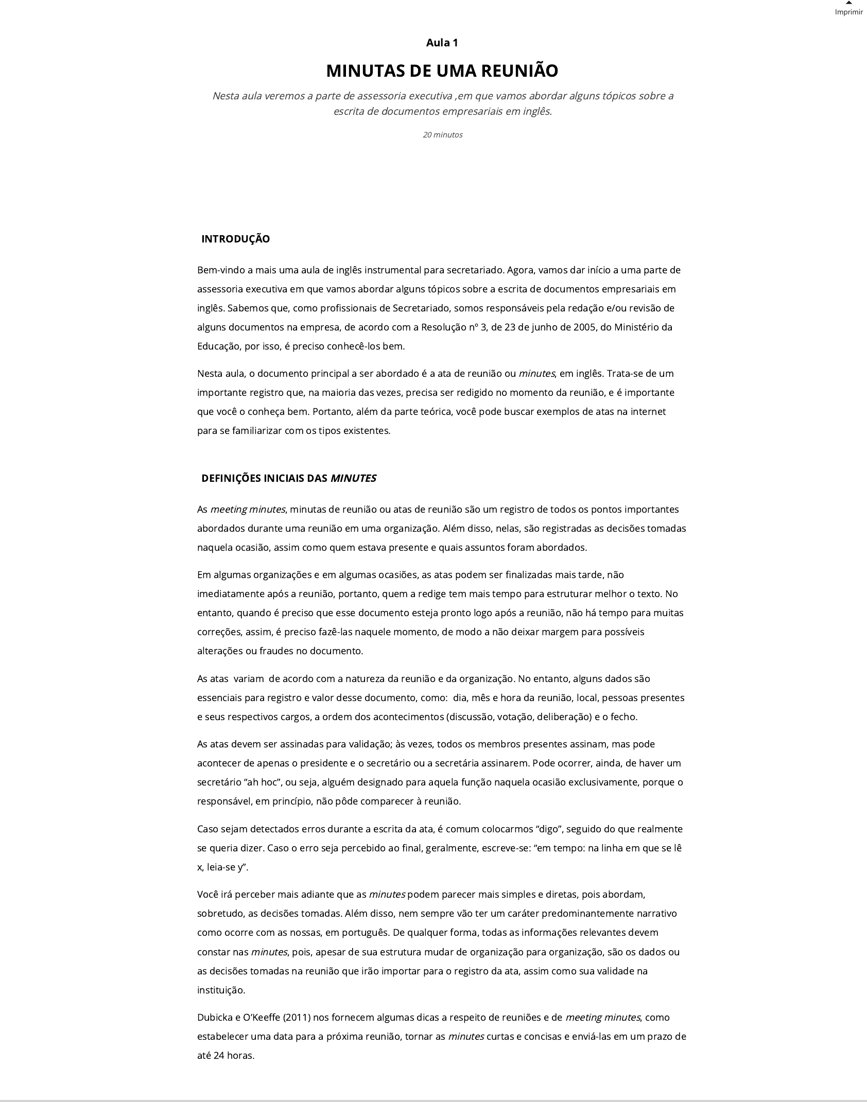 Imprimir INTRODUÇÃO Bem-vindo a mais uma aula de inglês instrumental para secretariado. Agora, vamos dar início a uma parte de assessoria executiva em que vamos abordar alguns tópicos sobre a escrita de documentos empresariais em inglês. Sabemos que, como pro�ssionais de Secretariado, somos responsáveis pela redação e/ou revisão de alguns documentos na empresa, de acordo com a Resolução nº 3, de 23 de junho de 2005, do Ministério da Educação, por isso, é preciso conhecê-los bem. Nesta aula, o documento principal a ser abordado é a ata de reunião ou minutes, em inglês. Trata-se de um importante registro que, na maioria das vezes, precisa ser redigido no momento da reunião, e é importante que você o conheça bem. Portanto, além da parte teórica, você pode buscar exemplos de atas na internet para se familiarizar com os tipos existentes. DEFINIÇÕES INICIAIS DAS MINUTES As meeting minutes, minutas de reunião ou atas de reunião são um registro de todos os pontos importantes abordados durante uma reunião em uma organização. Além disso, nelas, são registradas as decisões tomadas naquela ocasião, assim como quem estava presente e quais assuntos foram abordados. Em algumas organizações e em algumas ocasiões, as atas podem ser �nalizadas mais tarde, não imediatamente após a reunião, portanto, quem a redige tem mais tempo para estruturar melhor o texto. No entanto, quando é preciso que esse documento esteja pronto logo após a reunião, não há tempo para muitas correções, assim, é preciso fazê-las naquele momento, de modo a não deixar margem para possíveis alterações ou fraudes no documento. As atas variam de acordo com a natureza da reunião e da organização. No entanto, alguns dados são essenciais para registro e valor desse documento, como: dia, mês e hora da reunião, local, pessoas presentes e seus respectivos cargos, a ordem dos acontecimentos (discussão, votação, deliberação) e o fecho. As atas devem ser assinadas para validação; às vezes, todos os membros presentes assinam, mas pode acontecer de apenas o presidente e o secretário ou a secretária assinarem. Pode ocorrer, ainda, de haver um secretário “ah hoc”, ou seja, alguém designado para aquela função naquela ocasião exclusivamente, porque o responsável, em princípio, não pôde comparecer à reunião. Caso sejam detectados erros durante a escrita da ata, é comum colocarmos “digo”, seguido do que realmente se queria dizer. Caso o erro seja percebido ao �nal, geralmente, escreve-se: “em tempo: na linha em que se lê x, leia-se y”. Você irá perceber mais adiante que as minutes podem parecer mais simples e diretas, pois abordam, sobretudo, as decisões tomadas. Além disso, nem sempre vão ter um caráter predominantemente narrativo como ocorre com as nossas, em português. De qualquer forma, todas as informações relevantes devem constar nas minutes, pois, apesar de sua estrutura mudar de organização para organização, são os dados ou as decisões tomadas na reunião que irão importar para o registro da ata, assim como sua validade na instituição. Dubicka e O’Kee�e (2011) nos fornecem algumas dicas a respeito de reuniões e de meeting minutes, como estabelecer uma data para a próxima reunião, tornar as minutes curtas e concisas e enviá-las em um prazo de até 24 horas. Aula 1 MINUTAS DE UMA REUNIÃO Nesta aula veremos a parte de assessoria executiva ,em que vamos abordar alguns tópicos sobre a escrita de documentos empresariais em inglês. 20 minutos A seguir, vamos conhecer a estrutura de uma meeting minute concisa, chamada de action points, e compará- la com as ideias e a estrutura de uma ata em português, a �m de avaliarmos semelhanças e diferenças entre elas. MEETING MINUTES, ACTION POINTS E ATAS Dubicka e O’Kee�e (2011) recomendam que, antes de uma reunião, seja feita uma agenda em que constem os objetivos daquele encontro e, ao �nal, que essa agenda seja checada novamente, para se conferir se todos os propósitos foram cumpridos. As autoras ainda advertem para uma efetiva convocação de membros para a reunião, pessoas que possam, de fato, contribuir para a tomada de decisões e solução de problemas. As autoras, ainda, distinguem dois tipos de documentos: action points e full minutes. Os primeiros são mais concisos e diretos, focam as decisões tomadas e as próximas ações a serem empreendidas; já os últimos são as tradicionais atas, mais detalhadas, extensas e narrativas. Observe um exemplo de action points/minutes resgatado de Dubicka e O’Kee�e (2011, p. 144). Figura 1 | Modelo de minutes Fonte: Dubicka e O’Kee�e (2011, p. 144). Vamos detalhar, agora, algumas partes da estrutura desse documento. No cabeçalho, seção que corresponde à parte superior da folha, devem constar os seguintes elementos: o assunto da reunião (“Minutes of meeting on our commitment to corporate responsability”), a data (“date”), o local (“venue”) e os nomes dos presentes (“present”). Em seguida, no corpo, devem constar as discussões empreendidas naquela ocasião, enumeradas e intituladas, e, abaixo de cada título, as decisões tomadas referentes àquele assunto, assim como os nomes das pessoas envolvidas. Caso haja algo a ser feito em um futuro próximo, deve ser estabelecido um prazo (“deadline”). Na parte �nal do documento, ao �nal da página (“bottom of the page”), aparecem, novamente data, local e objetivo da próxima reunião, assim como a assinatura dos responsáveis pela escrita do documento ou de todos os presentes, se for o caso. Existem alguns pontos que devemos evitar ao elaborarmos minutes. Por se tratar de um documento público cujo acesso pode ser solicitado por qualquer pessoa, não é recomendado incluir citações diretas no documento, pois, mesmo sem os nomes, é possível identi�car alguém pela maneira de falar. Além disso, não podemos esquecer que, nas minutes, 