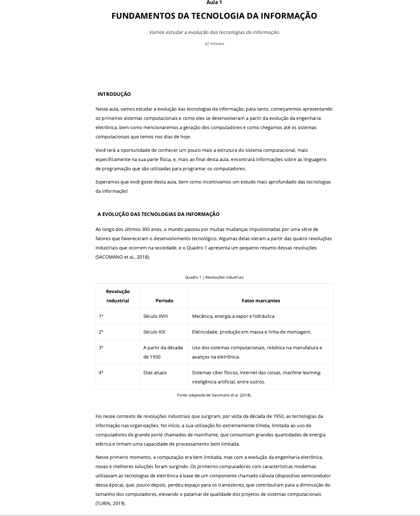 INTRODUÇÃO Nesta aula, vamos estudar a evolução das tecnologias da informação; para tanto, começaremos apresentando os primeiros sistemas computacionais e como eles se desenvolveram a partir da evolução da engenharia eletrônica, bem como mencionaremos a geração dos computadores e como chegamos até os sistemas computacionais que temos nos dias de hoje. Você terá a oportunidade de conhecer um pouco mais a estrutura do sistema computacional, mais especi�camente na sua parte física, e, mais ao �nal desta aula, encontrará informações sobre as linguagens de programação que são utilizadas para programar os computadores. Esperamos que você goste desta aula, bem como incentivamos um estudo mais aprofundado das tecnologias da informação! A EVOLUÇÃO DAS TECNOLOGIAS DA INFORMAÇÃO Ao longo dos últimos 300 anos, o mundo passou por muitas mudanças impulsionadas por uma série de fatores que favoreceram o desenvolvimento tecnológico. Algumas delas vieram a partir das quatro revoluções industriais que ocorrem na sociedade, e o Quadro 1 apresenta um pequeno resumo dessas revoluções (SACOMANO et al., 2018). Quadro 1 | Revoluções industriais Revolução Industrial Período Fatos marcantes 1ª Século XVIII Mecânica, energia a vapor e hidráulica. 2ª Século XIX Eletricidade, produção em massa e linha de montagem. 3ª A partir da década de 1950 Uso dos sistemas computacionais, robótica na manufatura e avanços na eletrônica. 4ª Dias atuais Sistemas ciber físicos, internet das coisas, machine learning, inteligência arti�cial, entre outros. Fonte: adaptado de Sacomano et al. (2018). Foi nesse contexto de revoluções industriais que surgiram, por volta da década de 1950, as tecnologias da informação nas organizações. No início, a sua utilização foi extremamente tímida, limitada ao uso de computadores de grande porte chamados de mainframe, que consumiam grandes quantidades de energia elétrica e tinham uma capacidade de processamento bem limitada. Nesse primeiro momento, a computação era bem limitada, mas com a evolução da engenharia eletrônica, novas e melhores soluções foram surgindo. Os primeiros computadores com características modernas utilizavam as tecnologias de eletrônica à base de um componente chamado válvula (dispositivo semicondutor dessa época), que, pouco depois, perdeu espaço para os transistores, que contribuíram para a diminuição do tamanho dos computadores, elevando o patamar de qualidade dos projetos de sistemas computacionais (TURIN, 2019). Aula 1 FUNDAMENTOS DA TECNOLOGIA DA INFORMAÇÃO Vamos estudar a evolução das tecnologias da informação. 62 minutos Imprimir Já por volta da década de 1970, os transistores foram substituídos pelos circuitos integrados, também conhecidos como chips, e tudo isso favoreceu o surgimento dos primeiros computadores pessoais, com tamanho bem menor que aqueles construídos à base de válvulas ou de transistores (TURIN, 2019). Essa evolução dos computadores pode ser vista no Quadro 2, que apresenta as tecnologias utilizadas, bem como o período e a velocidade de operação. Quadro 2 | Evolução dos sistemas computacionais Geração Tecnologia eletrônica Velocidade de operação Período Primeira Válvula 40.000 operações por segundo. Por volta da década de 1950. Segunda Transistor 200.000 operações por segundo. Por volta da década de 1960. Terceira Circuito integrado 1.000.000 operações por segundo. Por volta da década de 1970. Quarta Circuito integrado 1.000.000.000 operações por segundo. A partir de 1980. Fonte: Adaptado de Stalling (2010). É importante destacarmos que além da parte física dos sistemas computacionais (chamada de hardware), houve, também, uma grande evolução na parte lógica, ou seja, nos programas que fazem o computador, efetivamente, funcionar. Os programas de computador (também chamados de software) representam um conjunto de códigos e programações executados pela parte física. Os primeiros códigos (ou programas) utilizados em máquinas computacionais sem características modernas foram criados por volta de 1842 pela Sra. Ada Augusta King, considerada a primeira programadora. Ela criou um código para ser utilizado em máquinas analíticas, consideradas percussoras dos computadores modernos (MARÇULA; BENINI FILHO, 2019). Nos primeiros computadores, o software operava com processamento em batch (em lote) e os códigos �cavam armazenados em cartões perfurados. Aos poucos, as linguagens de programação e o próprio hardware foram evoluindo e novas soluções de software foram sendo criadas, de modo que, ao longo da história da informática do século passado, observamos o desenvolvimento e a evolução, em paralelo, tanto do hardware como do software (MARÇULA; BENINI FILHO, 2019). VIDEOAULA: A EVOLUÇÃO DAS TECNOLOGIAS DA INFORMAÇÃO Olá, estudante! Nesta videoaula, adentraremos um pouco mais na evolução dos sistemas computacionais. Vamos mostrar os tipos de computadores e o surgimento de cada um deles dentro do processo evolutivo da tecnologia da informação, bem como falar sobre os desktops, notebooks, tablets e smartphones, suas vantagens e desvantagens. ESTRUTURA GERAL DE UM SISTEMA DE COMPUTAÇÃO – HARDWARE, CPU, MEMÓRIA, PERIFÉRICOS, SISTEMA OPERACIONAL O sistema computacional foi a grande invenção da tecnologia da informação; ele é composto por uma parte física chamada de hardware e uma parte lógica chamada de software. A parte física do sistema computacional e todos os seus componentes podem ser vistos na Figura 1. Figura 1 | Parte física do sistema computacional Para visualizar o objeto, acesse seu material digital. Fonte: adaptado de Marçula e Benini Filho (2019). O primeiro elemento da parte física do hardware é o processador ou unidade central de processamento (CPU – Control Processing Unit). Esse componente é considerado o “cérebro” do sistema computacional, sendo responsável diret
