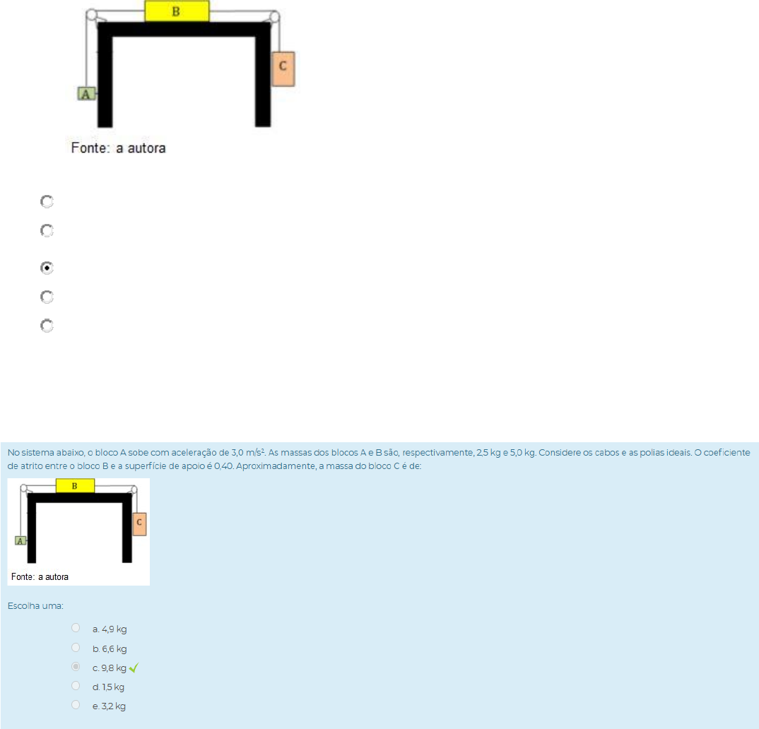 No sistema abaixo, o bloco A sobe com aceleração de 3,0 m/s². As massas dos blocos A e B são, respectivamente, 2,5 kg e 5,0 kg. Considere os cabos e as polias ideais. O coeficiente de atrito entre o bloco B e a superfície de apoio é 0,40. Aproximadamente, a massa do bloco C é de: Escolha uma: a. 4,9 kg b. 6,6 kg c. 9,8 kg d. 1,5 kg e. 3,2 kg